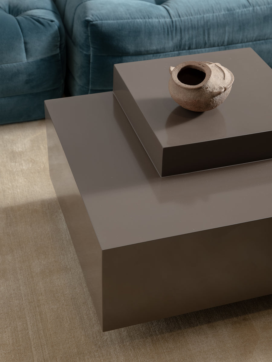 Finished in a semi-gloss lacquer, the surface catches the light subtly, enhancing the table’s crisp, cubic form without overpowering it. A recessed shadow line adds a subtle depth and floating effect, giving the clean, cubic form a sense of lightness and dimension.
