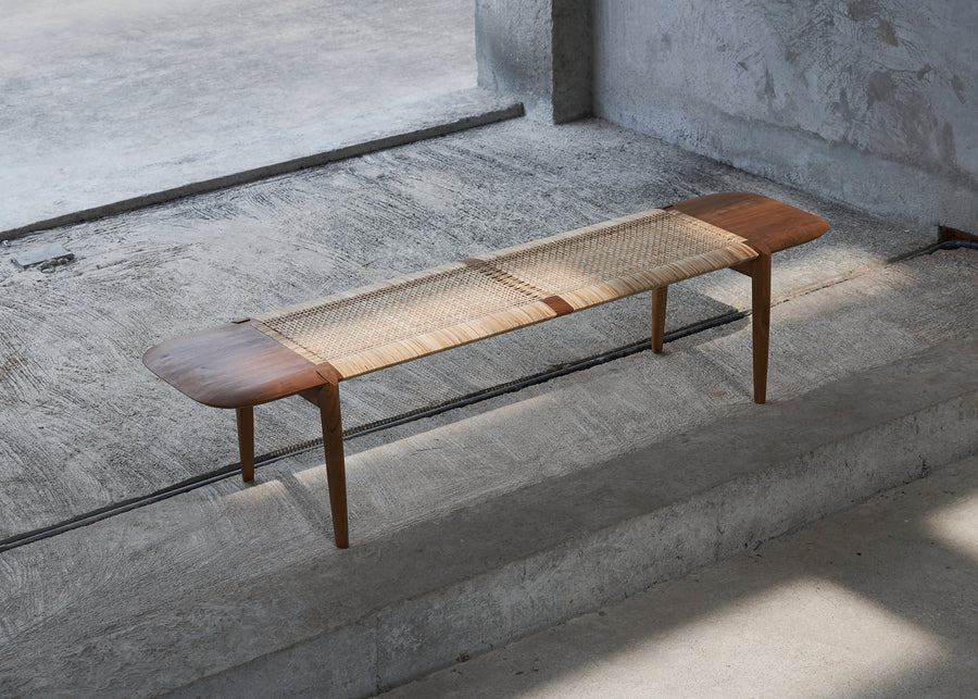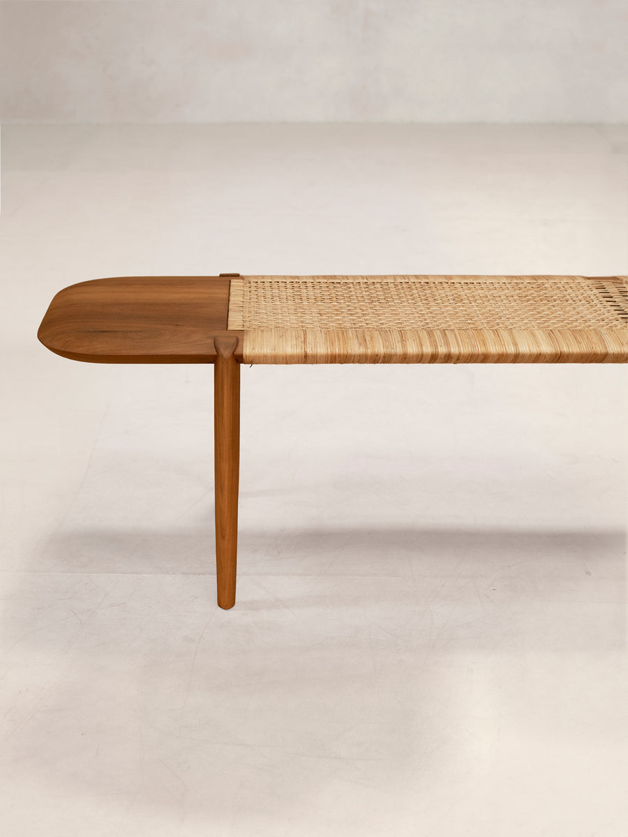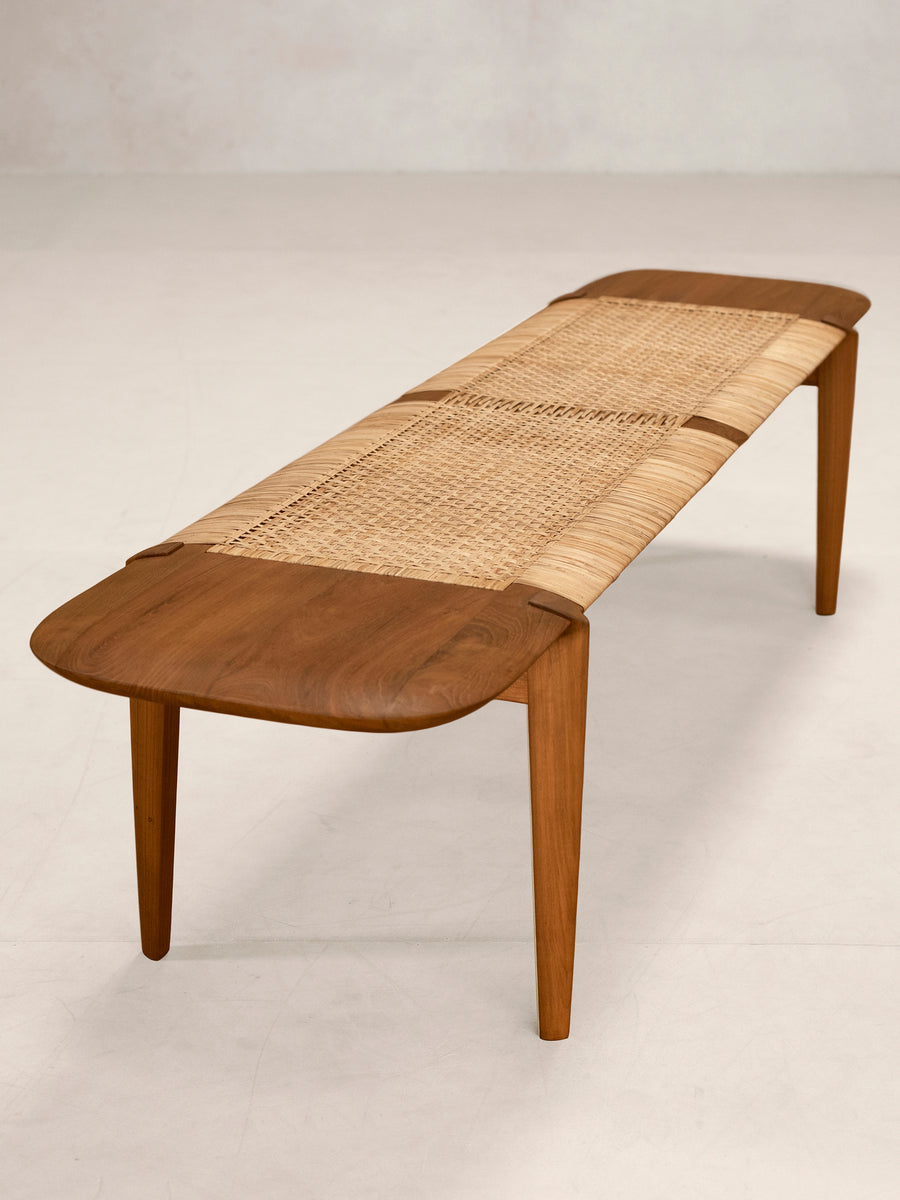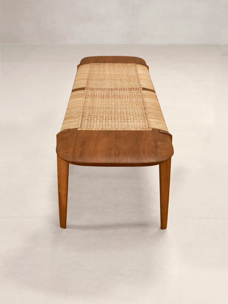 The contours of the bench are completely shaped by hand, with innovation in cane weaving a core part of the design process where the cane is wrapped and woven around the wooden frames in the signature Tangali style.