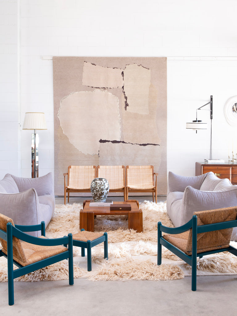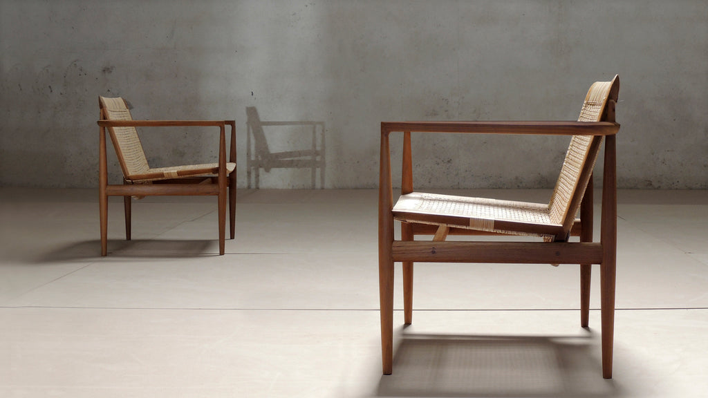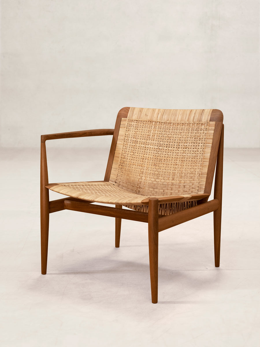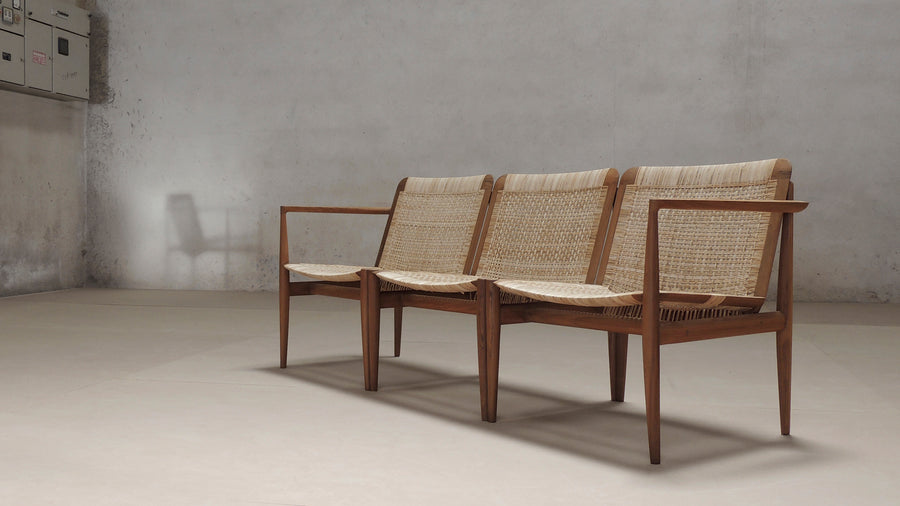 The Tangali Modular Chairs are a set comprising an armless chair, chairs with one arm (left or right) and armchairs with both arms. Individual chairs can be used in different combinations based on the seating requirement in a particular space. The contours of the modular pieces are completely shaped by hand, and the cane is wrapped and woven around the wooden frames in the signature Tangali style.