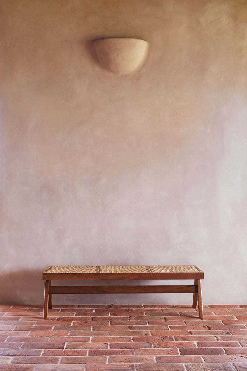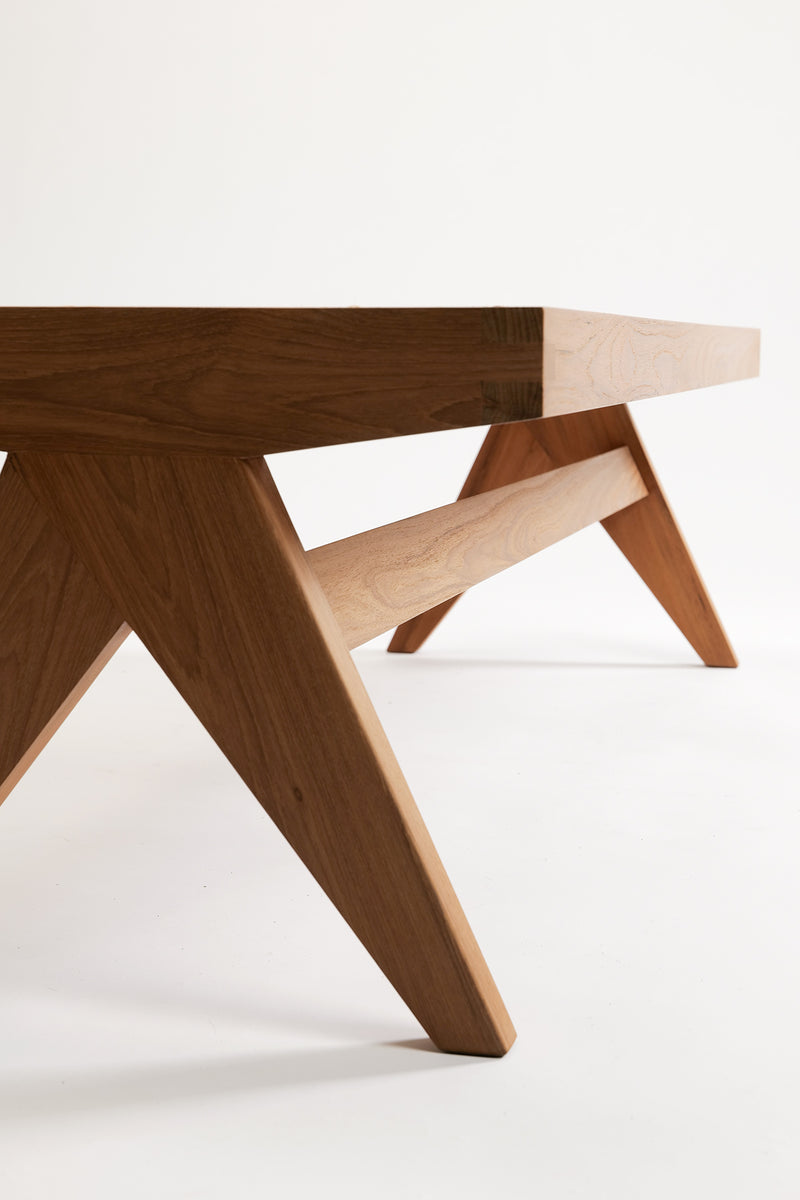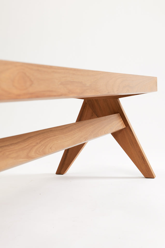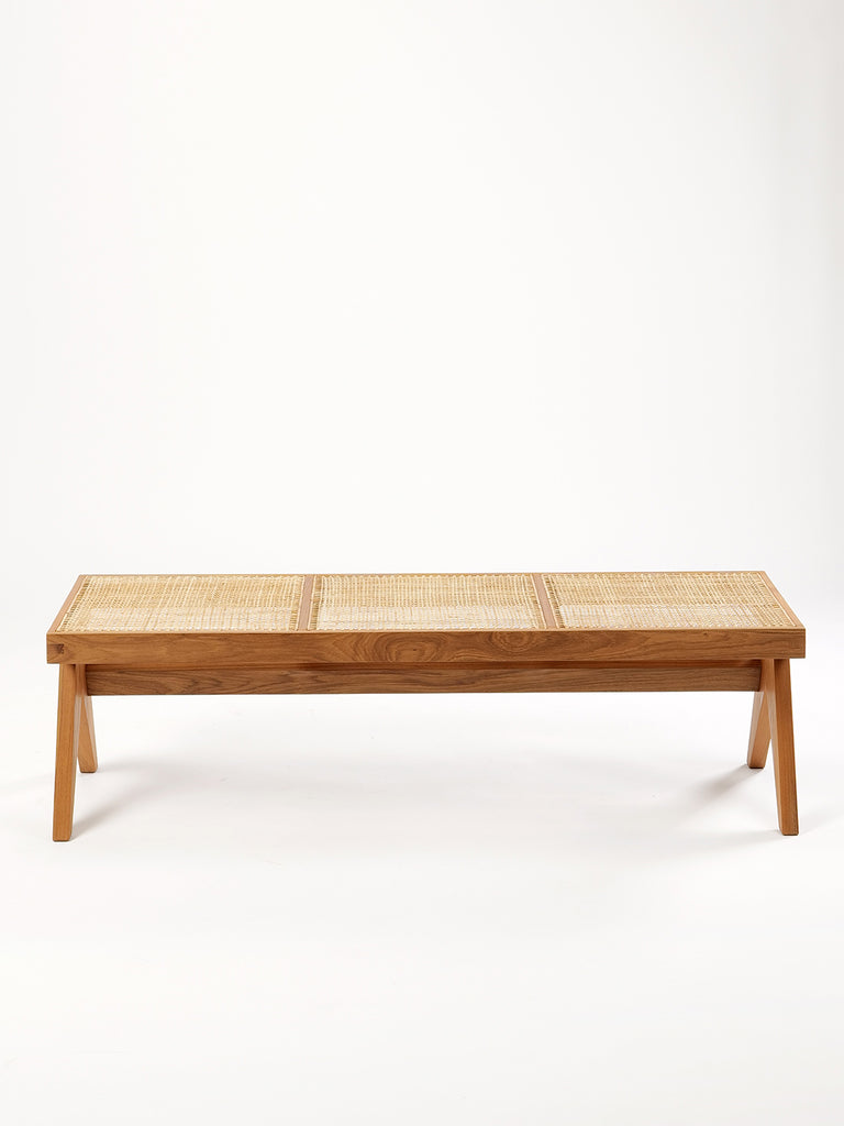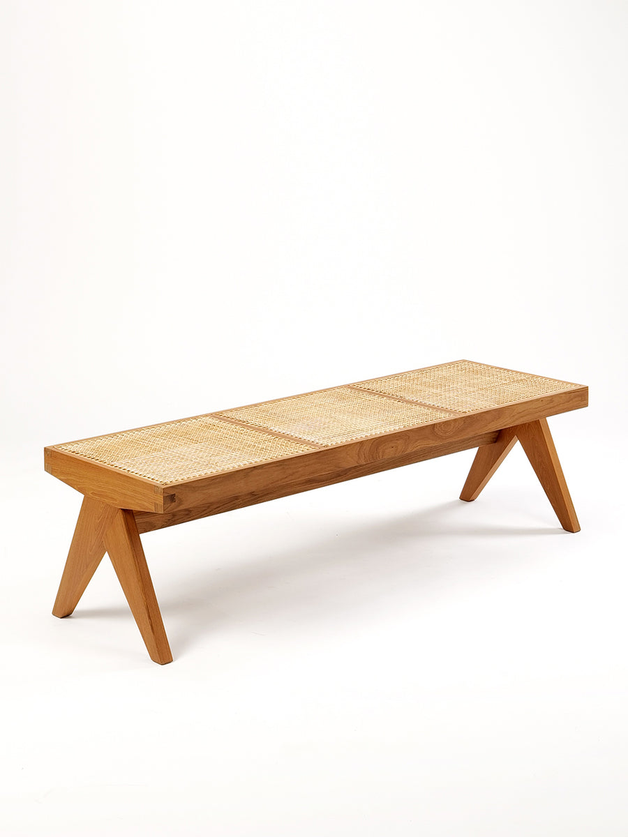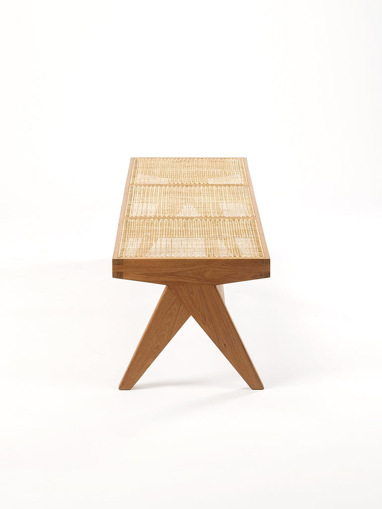 The Teak & Cane bench is a re-edition of the low teak bench designed for residential hostels in Chandigarh. The bench is a 3-seater with cane lattice seating and characteristic V leg assemblies on either end. Each V leg assembly is comprised of a long and short leg piece. A supporting crossbar runs along the length of the bench between the the longer leg pieces. The natural rattan cane is peeled and woven meticulously by hand.
