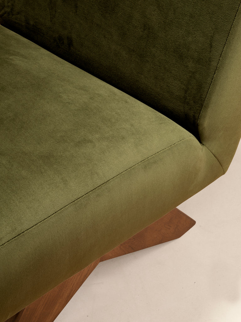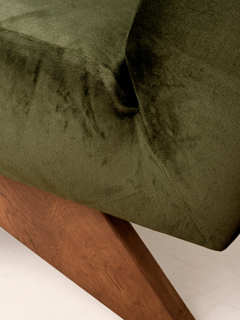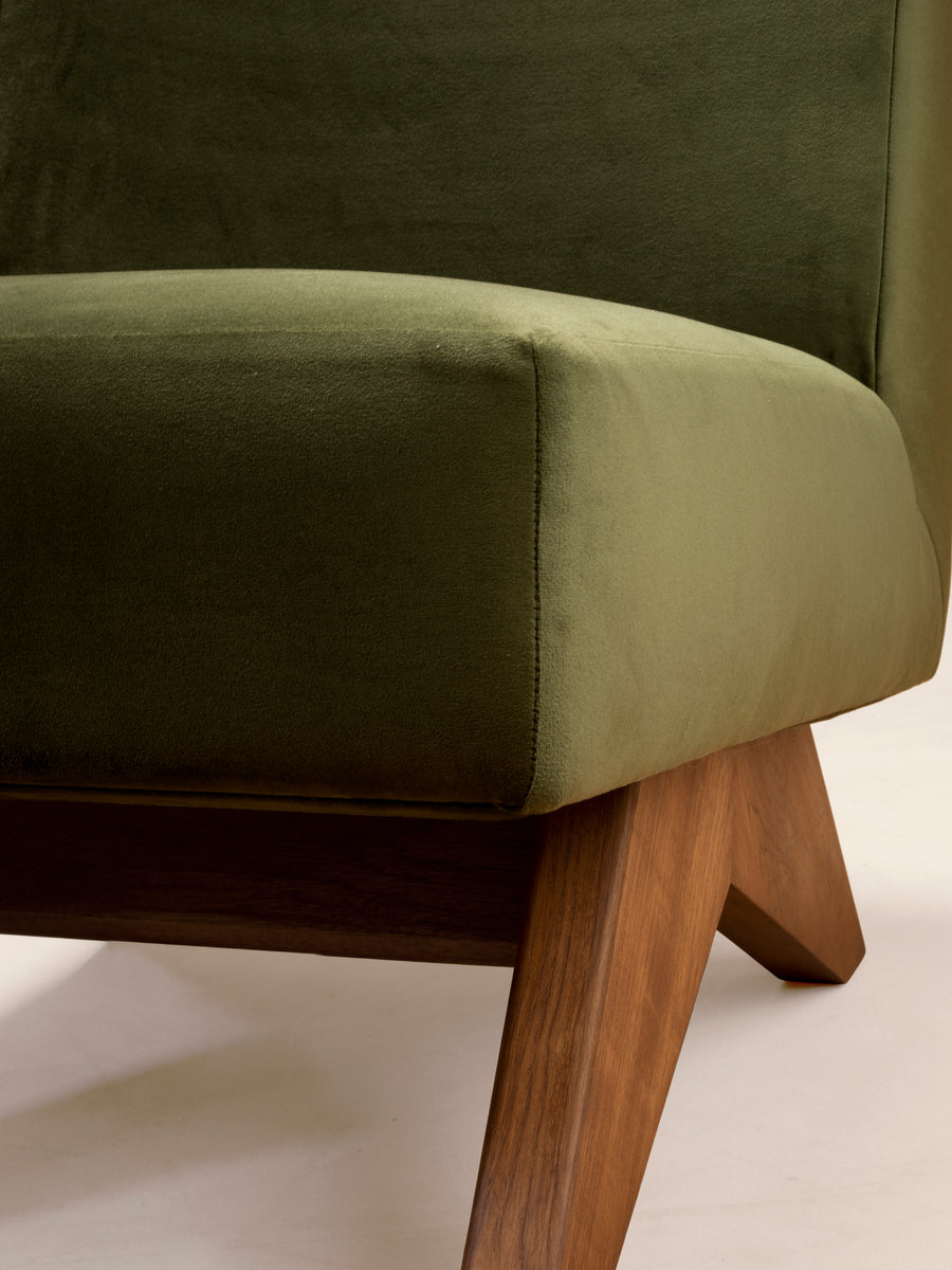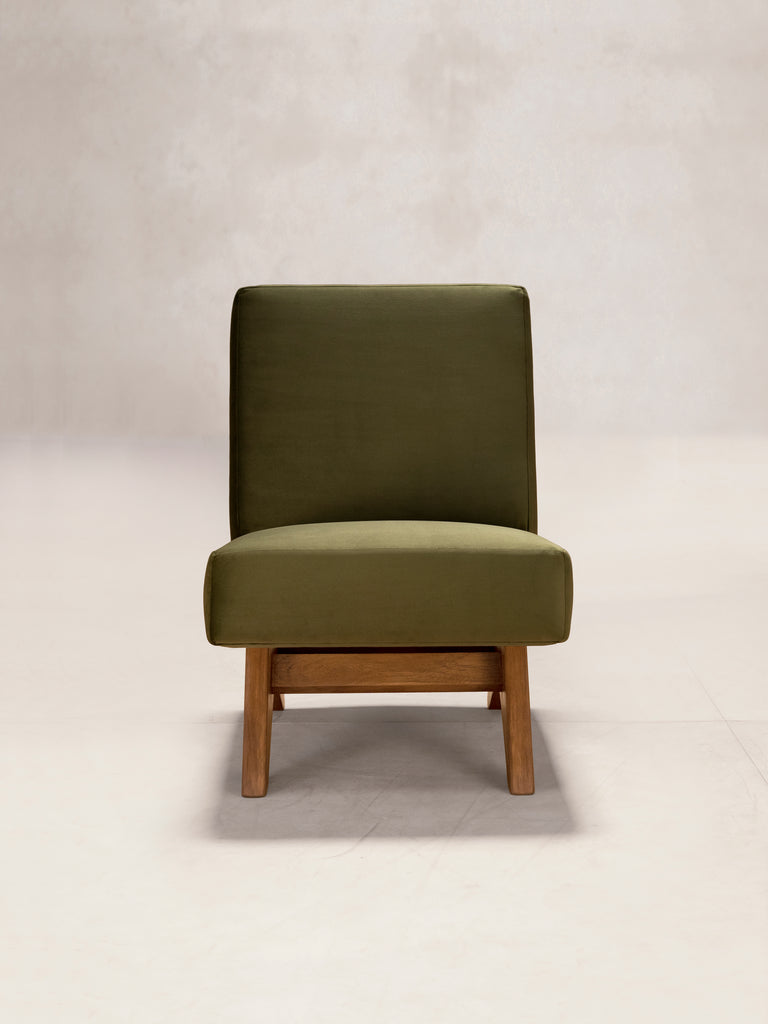 The Upholstered Armless Chair is a re-edition of the model created for building lobbies in Chandigarh in the 1950s. This re-edition is true to the dimensions and external form of the original design, with improvements made to the structural elements and quality of materials to create a chair that is built to last. The external leg and arm frames are made of teak wood, while the inner frame is made of pinewood. High quality premium polyurethane foam in a carefully calibrated combination of densities is used to create the perfect ergonomic seating comfort.