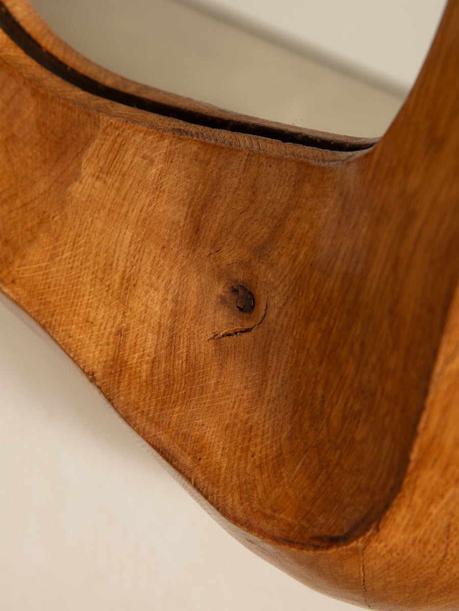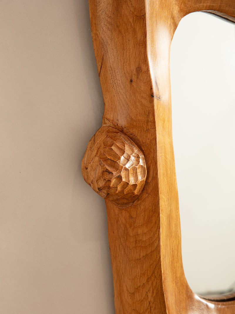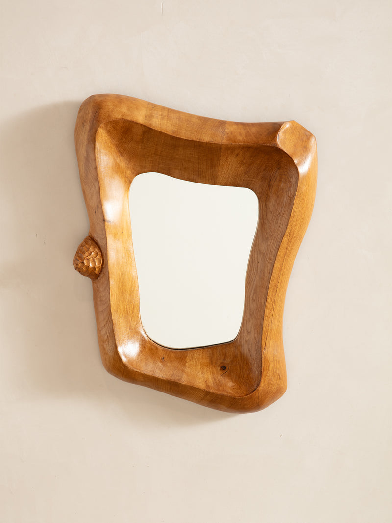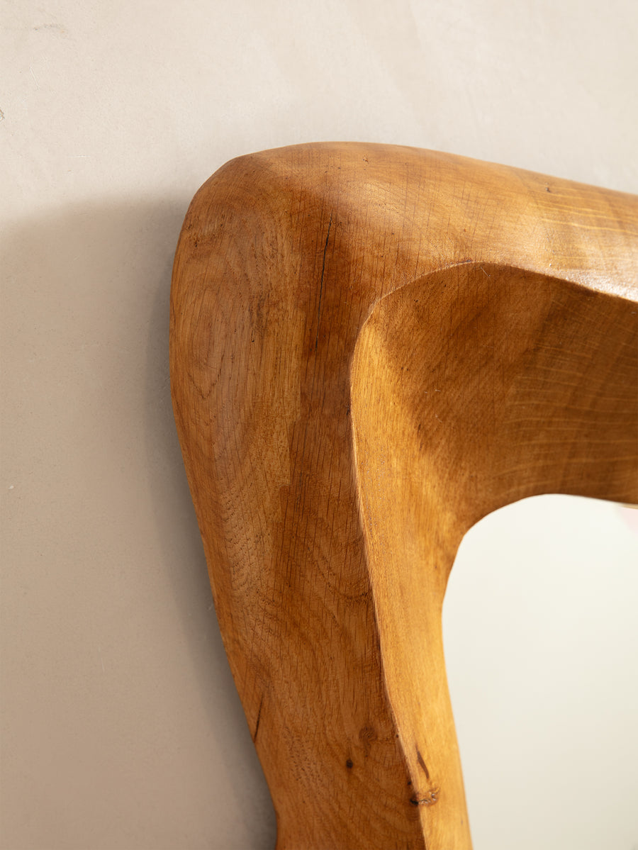 An organically shaped timber mirror that celebrates the beauty of natural form, reminiscent of 1970s French artisan design. Smoothly carved with soft, flowing lines, its sculptural frame brings warmth, texture, and a sense of artistry to the wall. The irregular silhouette and rich wood grain capture the spirit of hand-shaped craftsmanship - a timeless piece that bridges the raw elegance of nature with the refined sensibility of French design.