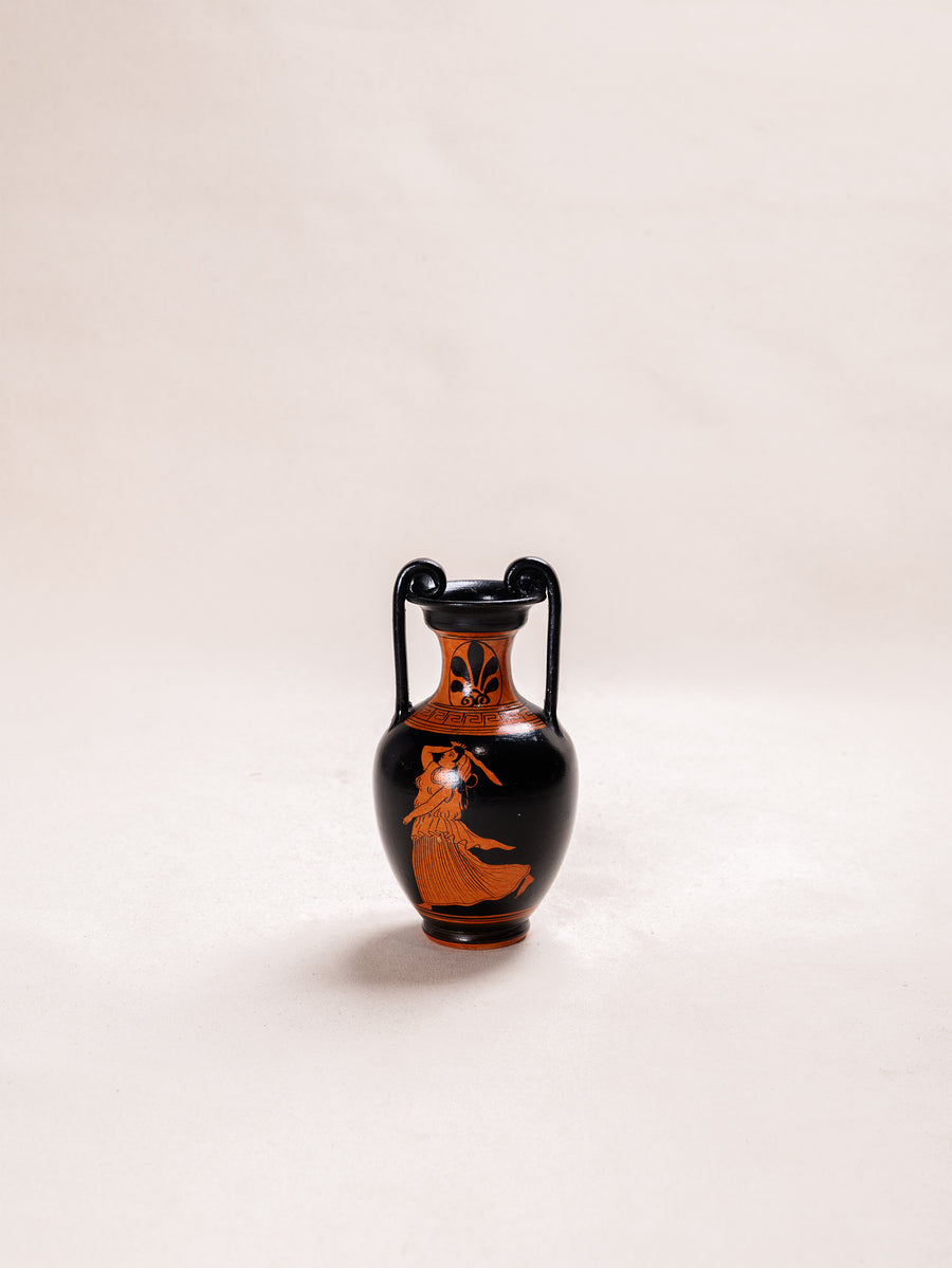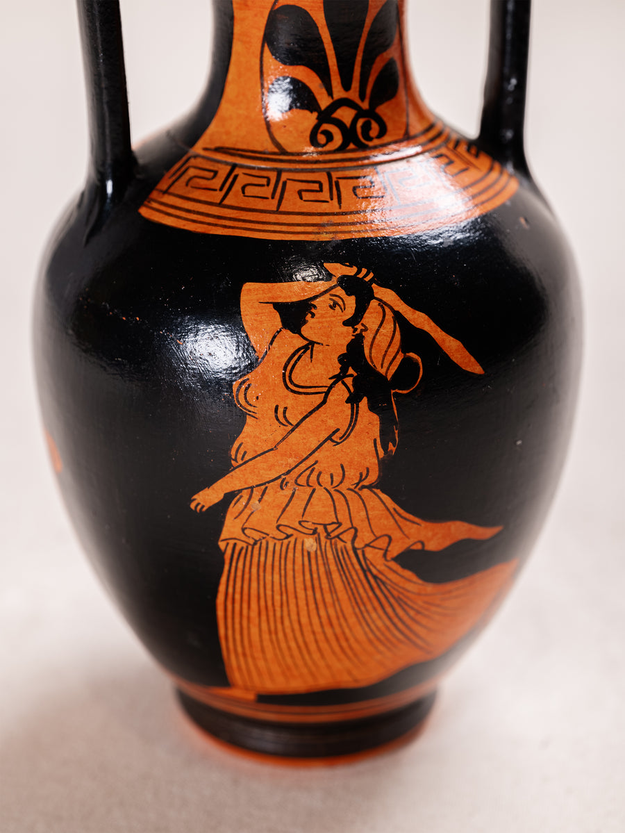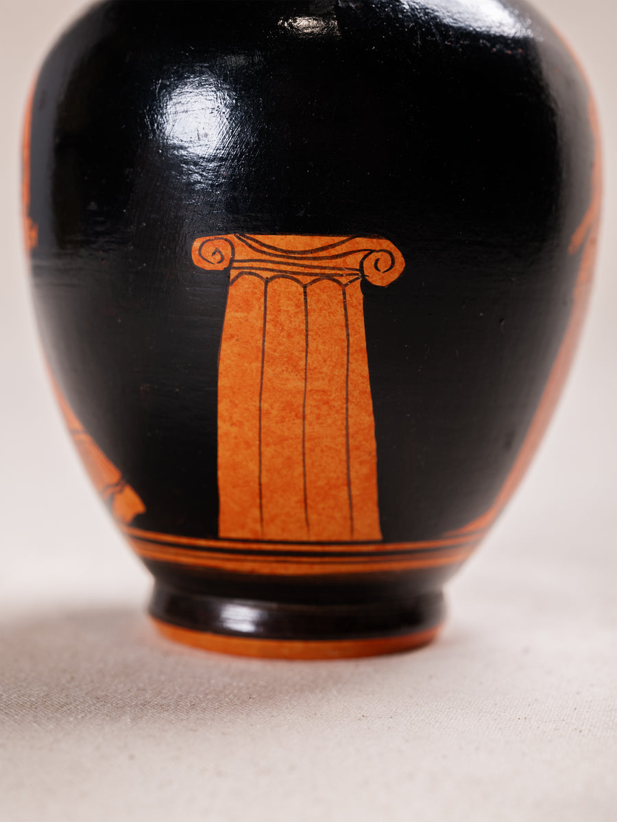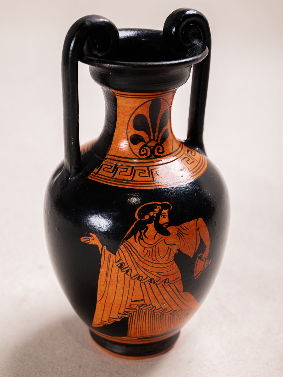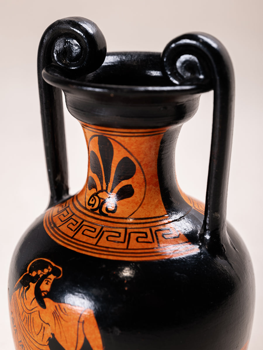 Sourced from Athens, this amphora vessel reflects the enduring ceramic heritage of Greece. Finished in a traditional black and terracotta palette, it features classical figural detailing inspired by ancient red figure pottery.