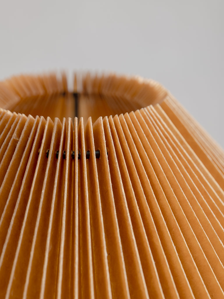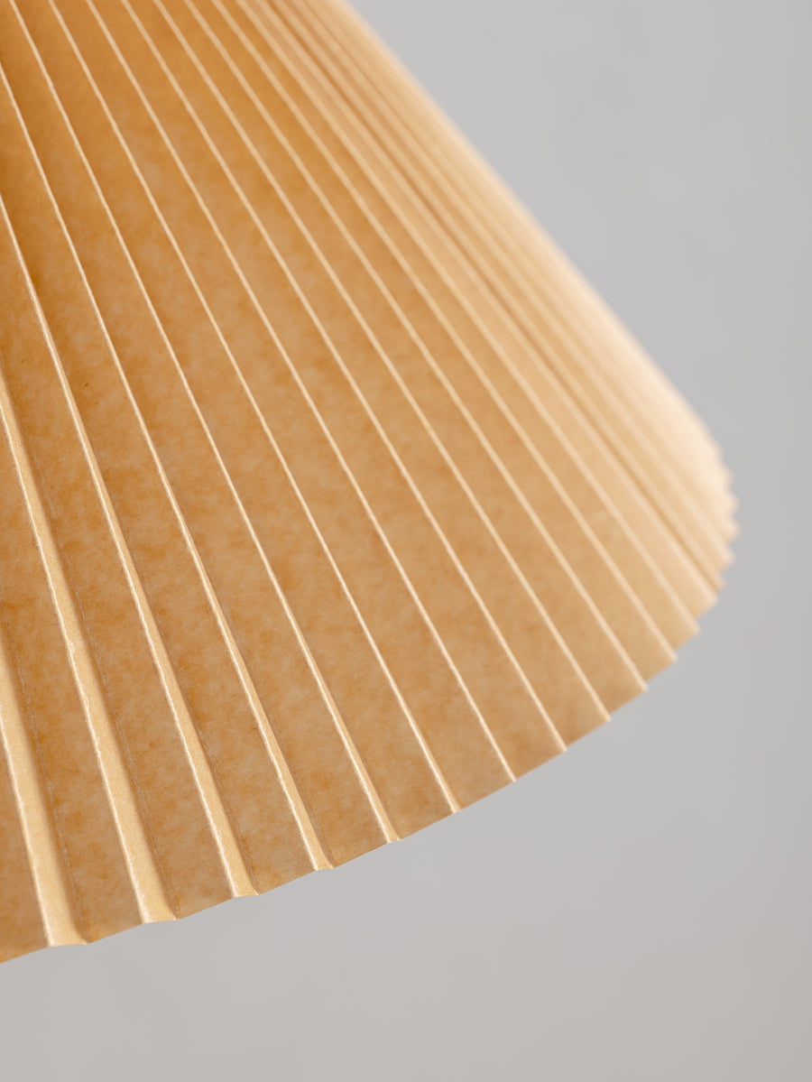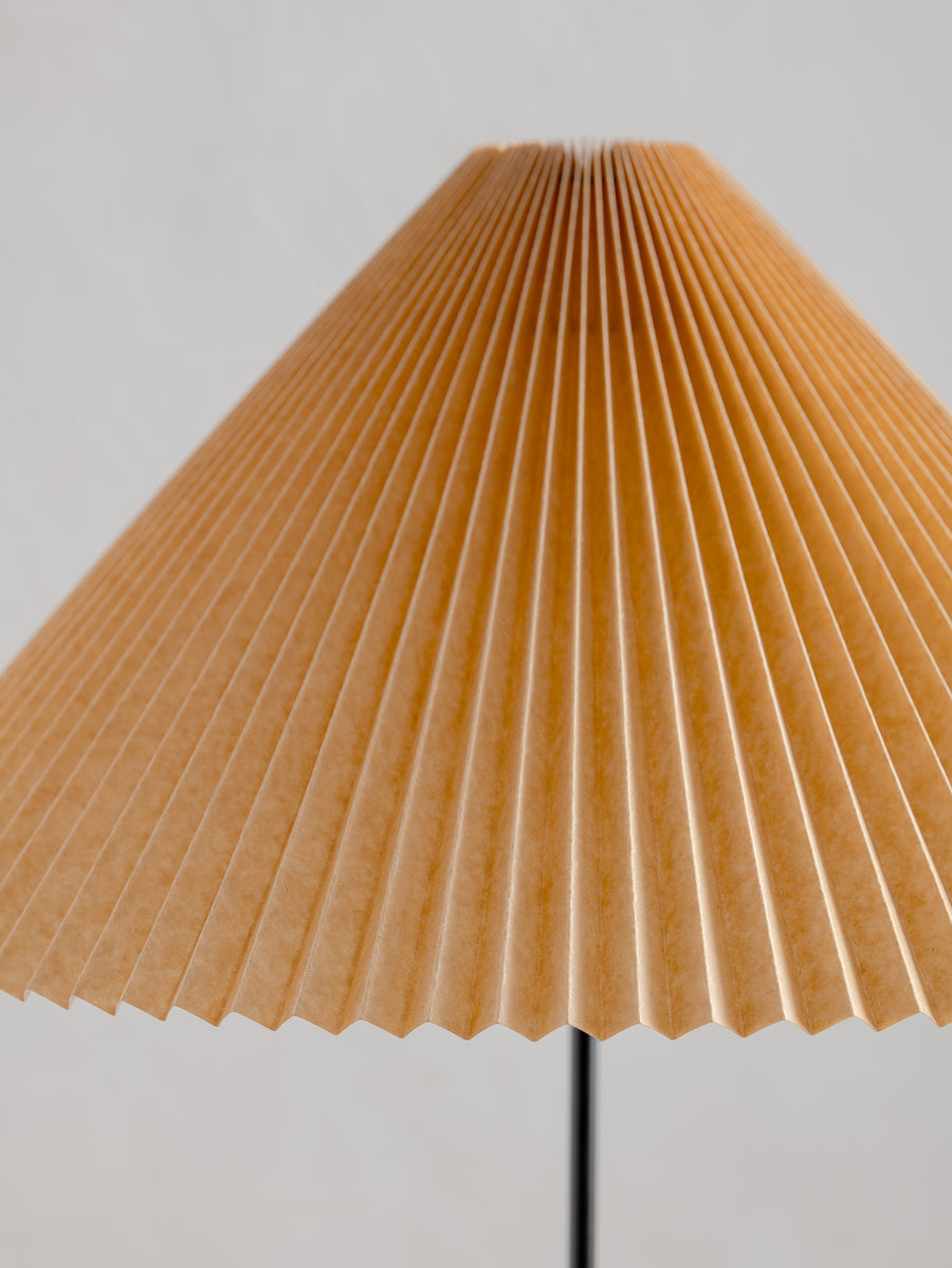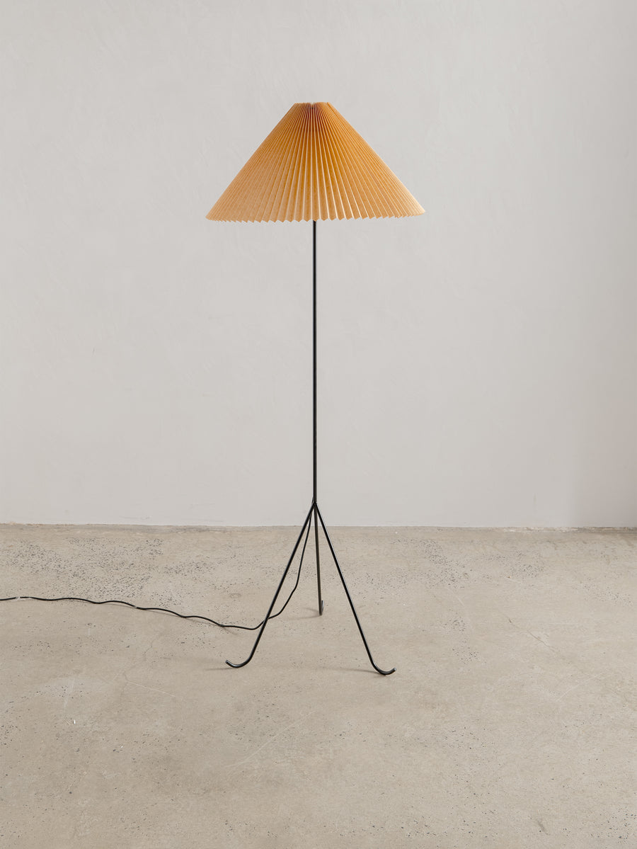 Geraldine Floor Lamp is a chic lamp featuring a distinctive pleated shade in a vibrant mustard hue. Its base, designed with elegant simplicity, consists of three slender black metal legs. The pleated textile shade in waxed paper not only adds texture but also casts a warm, inviting light throughout the room.