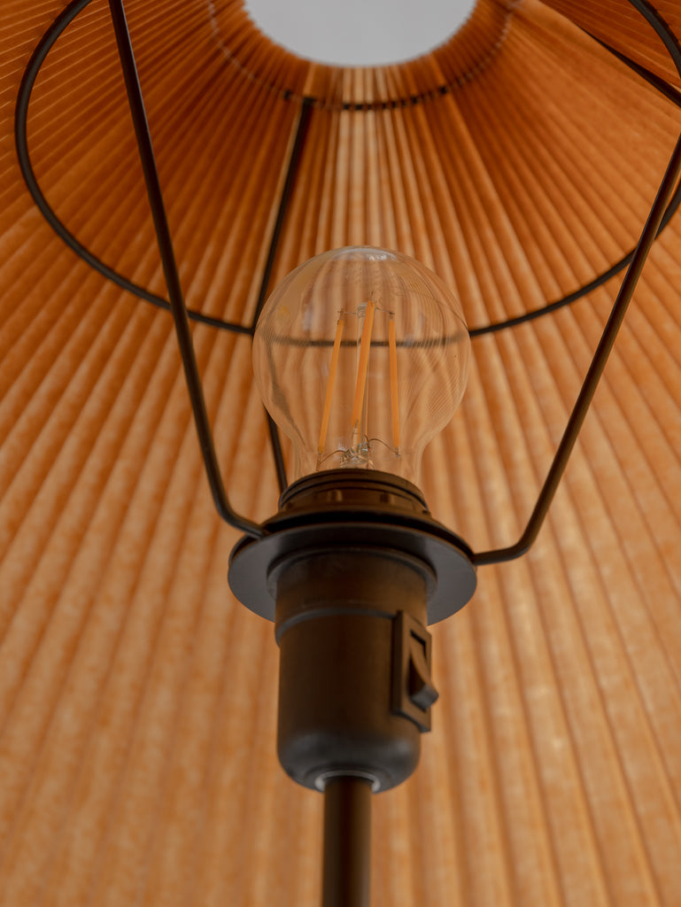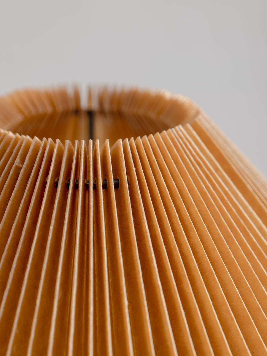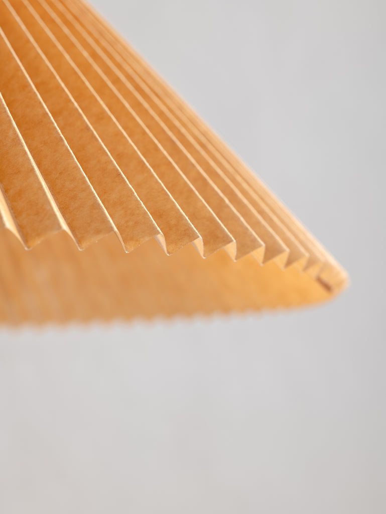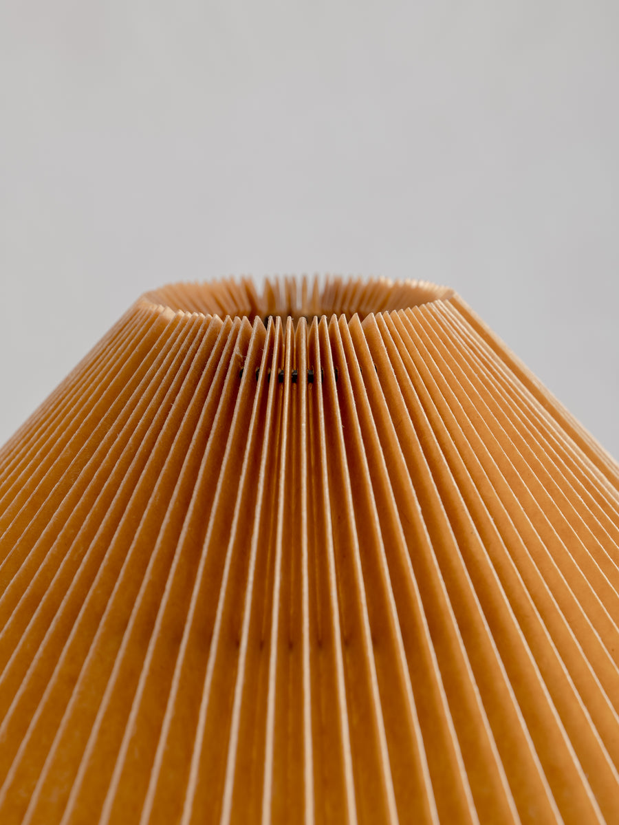 Geraldine Floor Lamp is a chic lamp featuring a distinctive pleated shade in a vibrant mustard hue. Its base, designed with elegant simplicity, consists of three slender black metal legs. The pleated textile shade in waxed paper not only adds texture but also casts a warm, inviting light throughout the room.