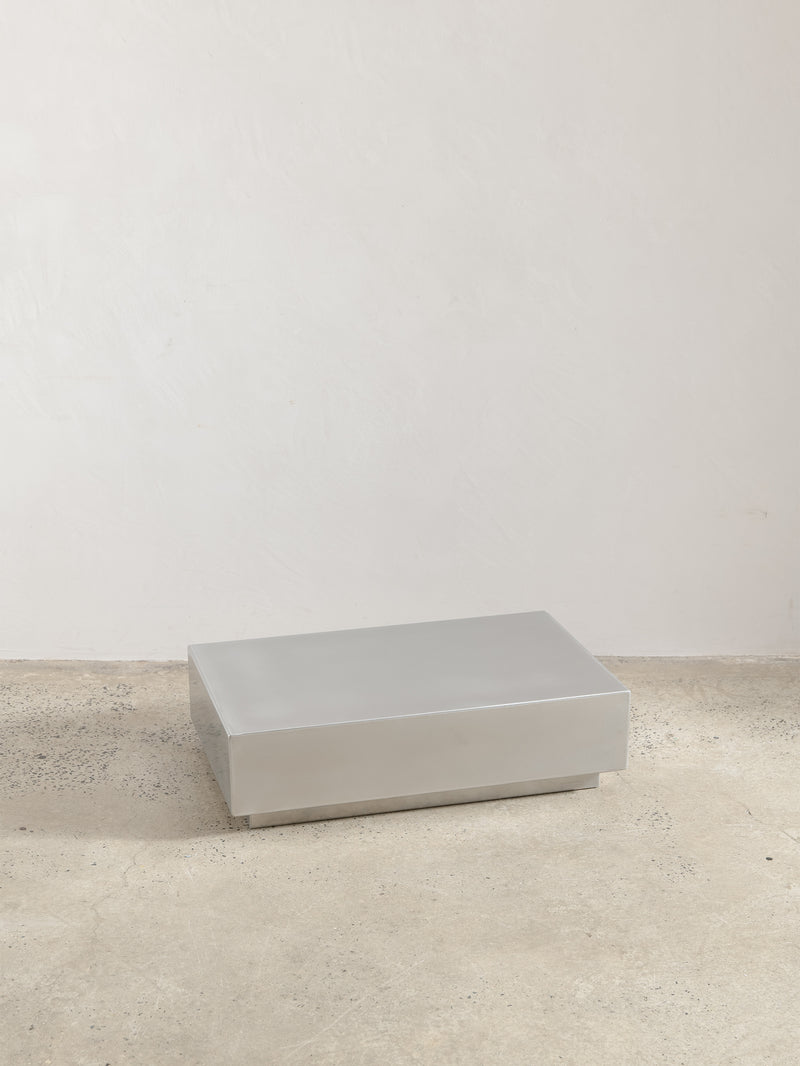 Low-line stainless steel coffee table inspired by the sleek modernist aesthetic of the 1970s, adding a touch of industrial elegance to your space.