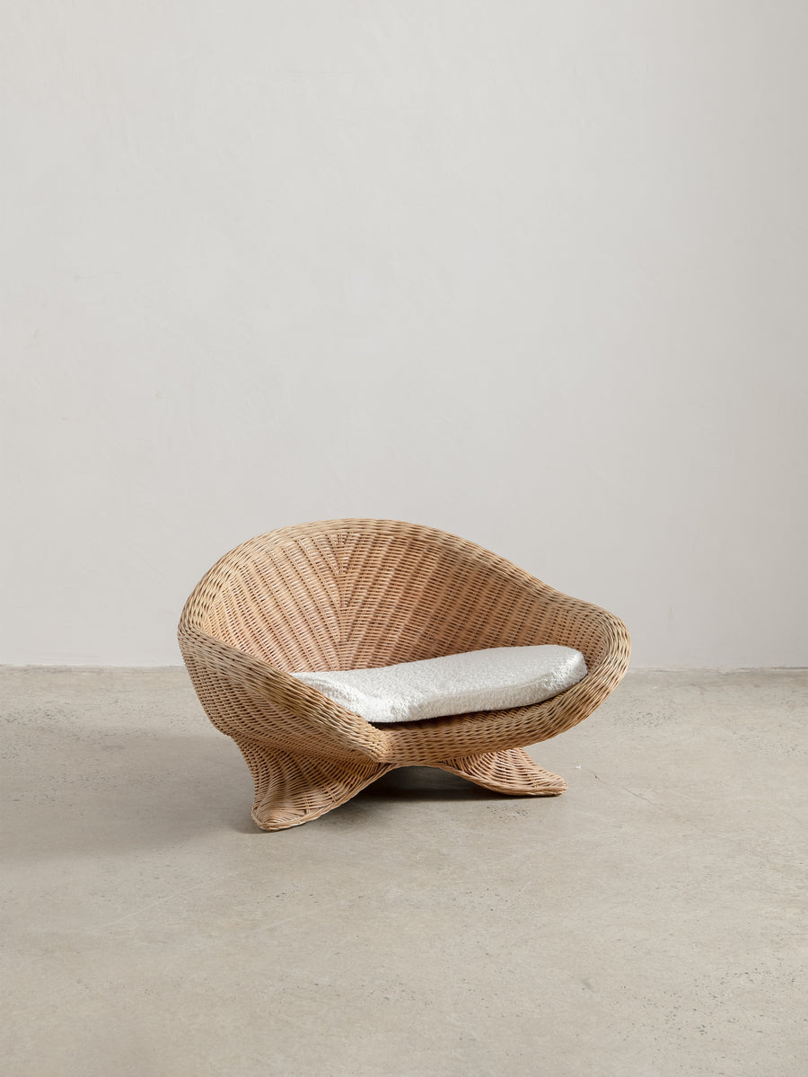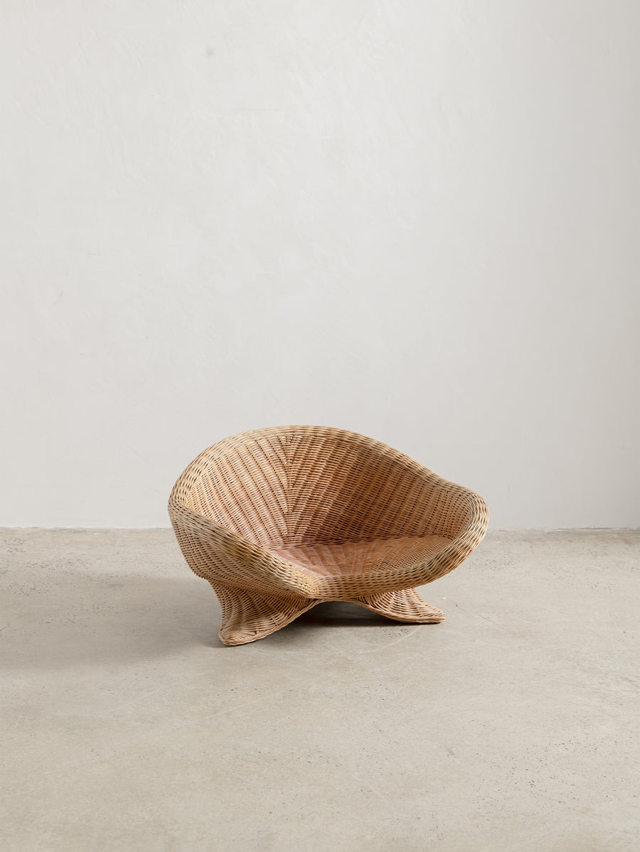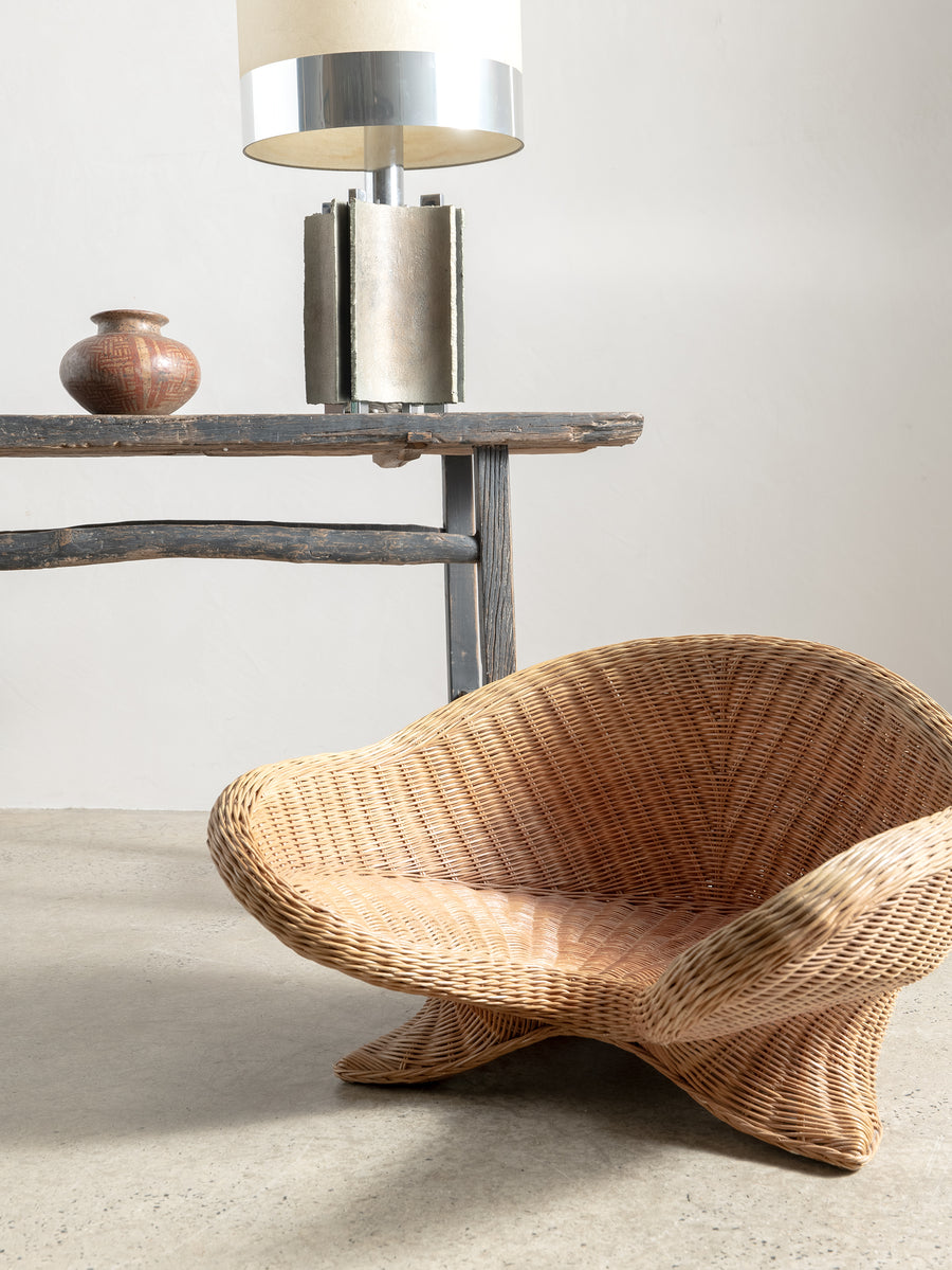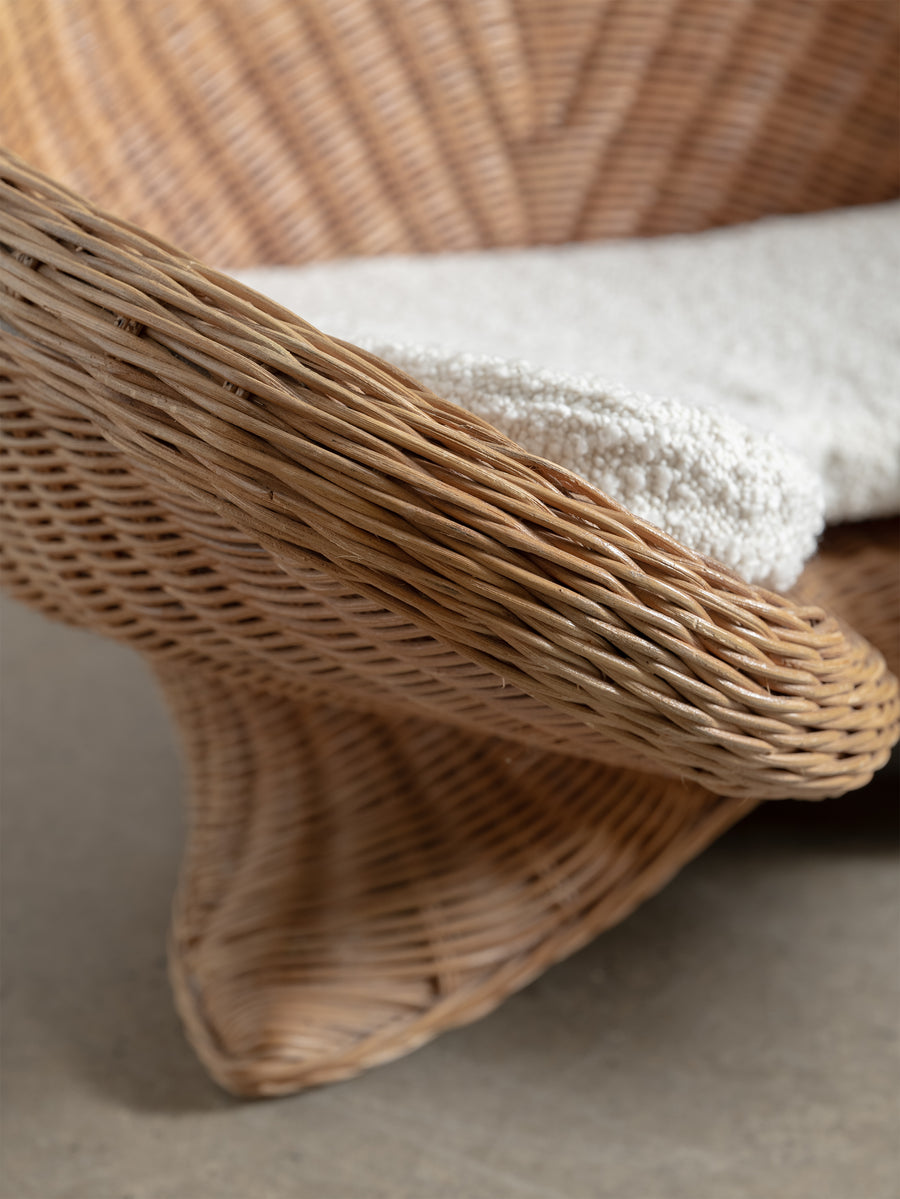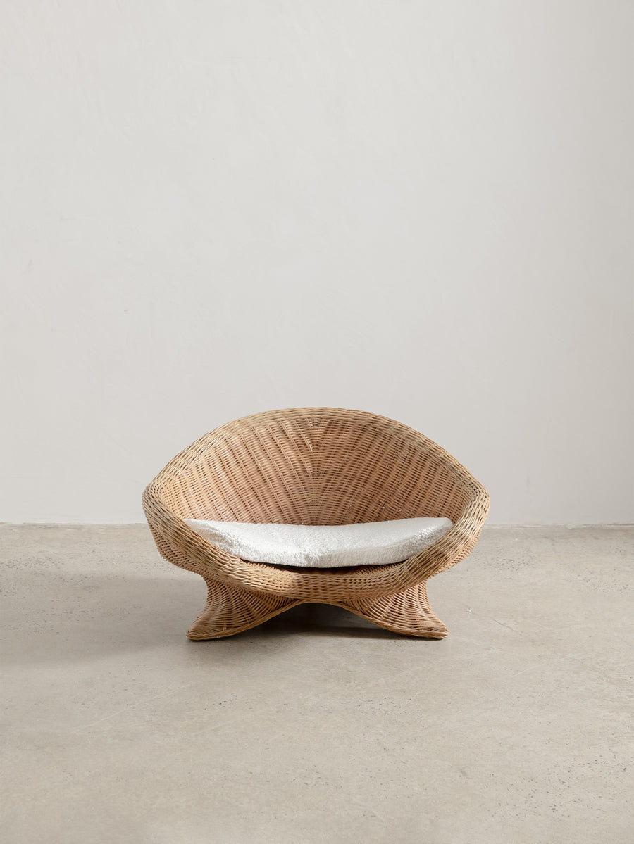 Low-set rattan chair by Vivai del Sud, a design combining the grandeur of Roman classicism and the clean sophistication of mid-century modernism.