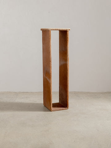 Elegant in its restraint, this vintage plinth is wrapped entirely in horse hide, lending a warm, tactile richness to its minimalist form. The rectangular silhouette with open sides reveals the craftsmanship of the era - precise stitching and natural patina that comes only with age. Both sculptural and functional, it stands beautifully as a pedestal for art or as an object of design in its own right.