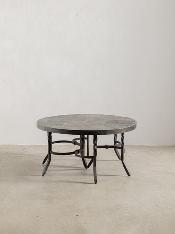 A sculptural 3-piece coffee table from the 1960s, crafted with a slate top and wrought iron base. The circular form is divided into three sections, each piece standing alone as a functional side table or joined together to form a striking round centrepiece. The twisted iron legs and curved stretchers bring strength and rhythm to the design, while the natural slate surface introduces a raw, textural beauty. Both versatile and timeless, this table embodies the refined balance of materiality and form.