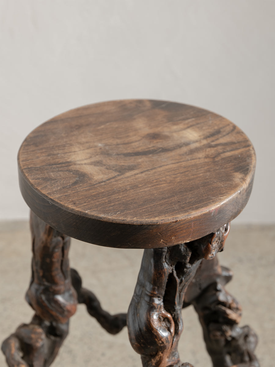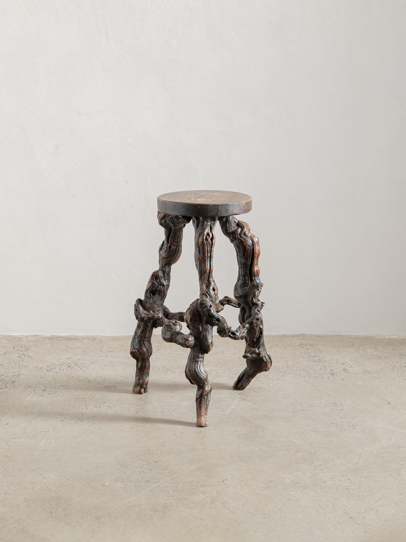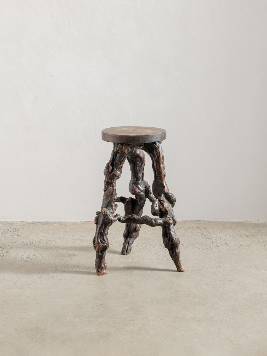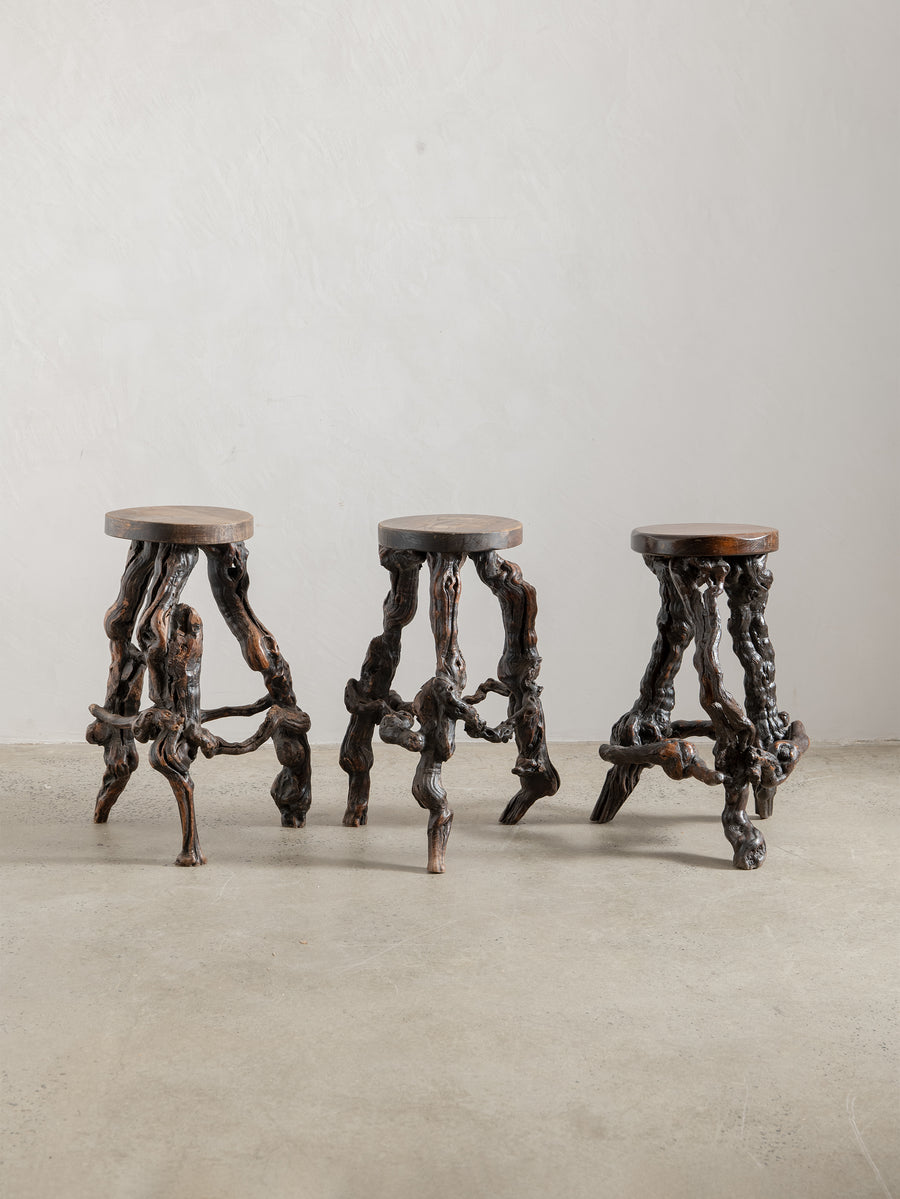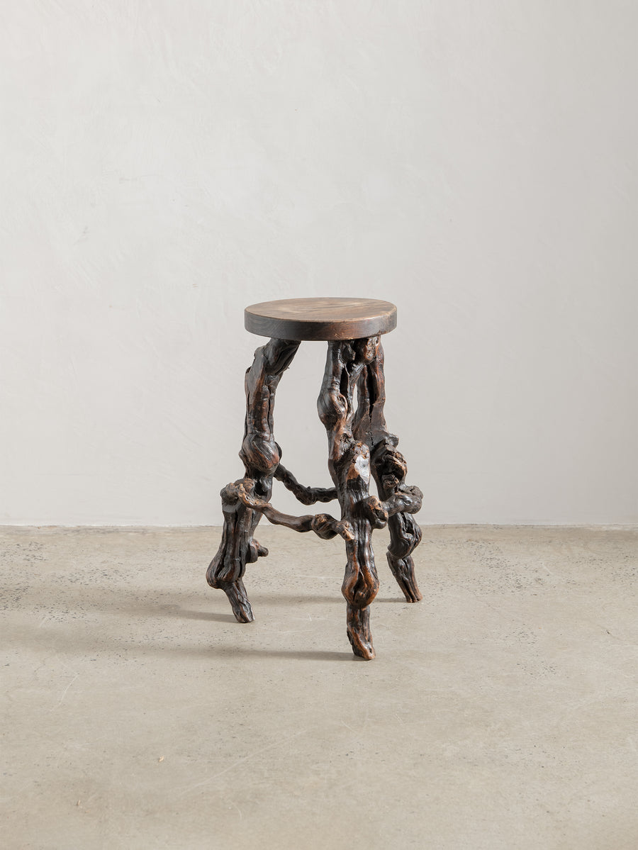 A striking 1970s timber stool that embodies the tension between organic form and brutalist design. Each piece is uniquely sculpted from solid wood, its twisted, root-like structure revealing the raw beauty of natural material shaped by hand. The irregular contours and richly textured surface bring depth and artistry to any space - equally suited as a counter stool, side table, or sculptural accent.