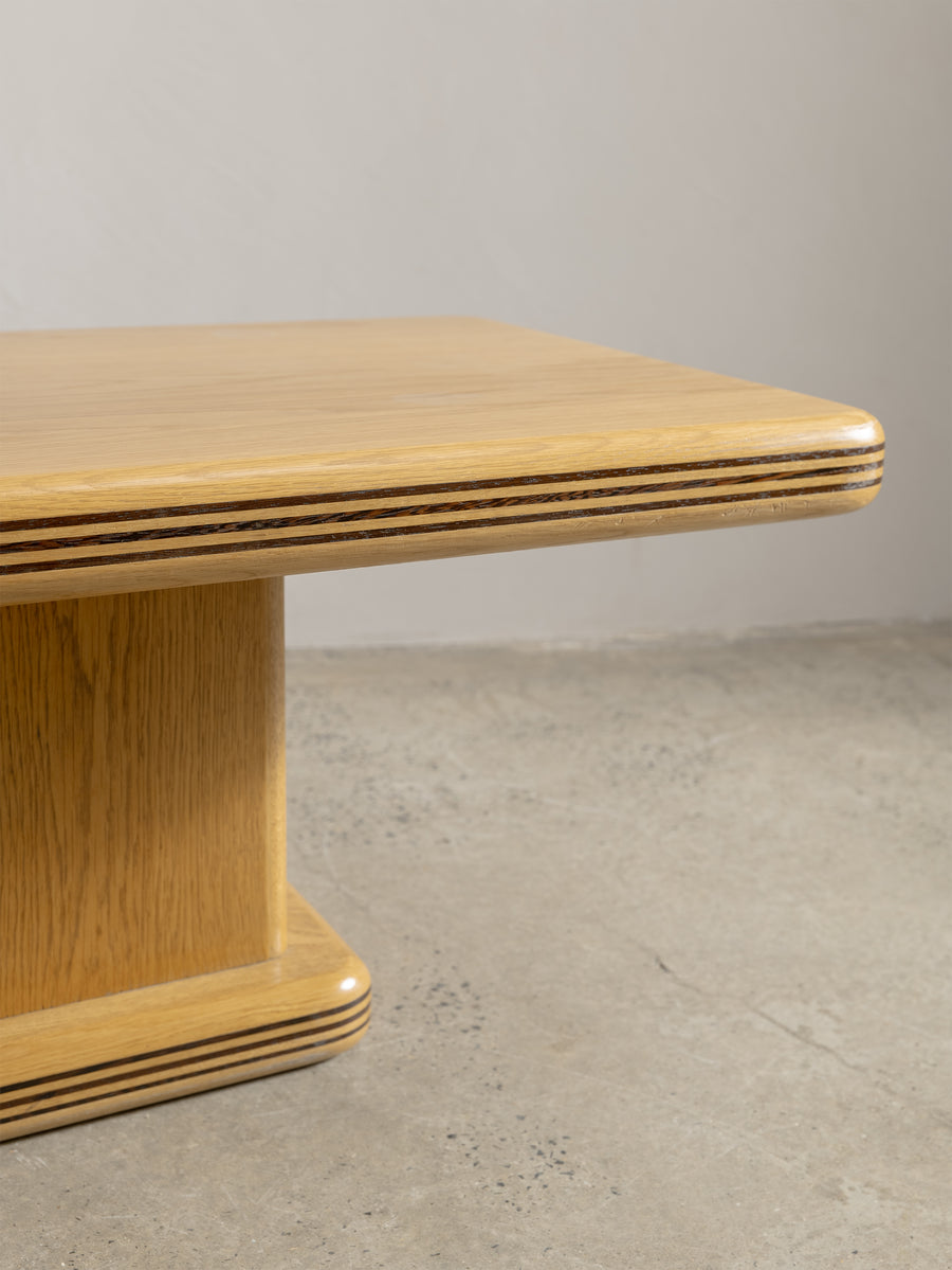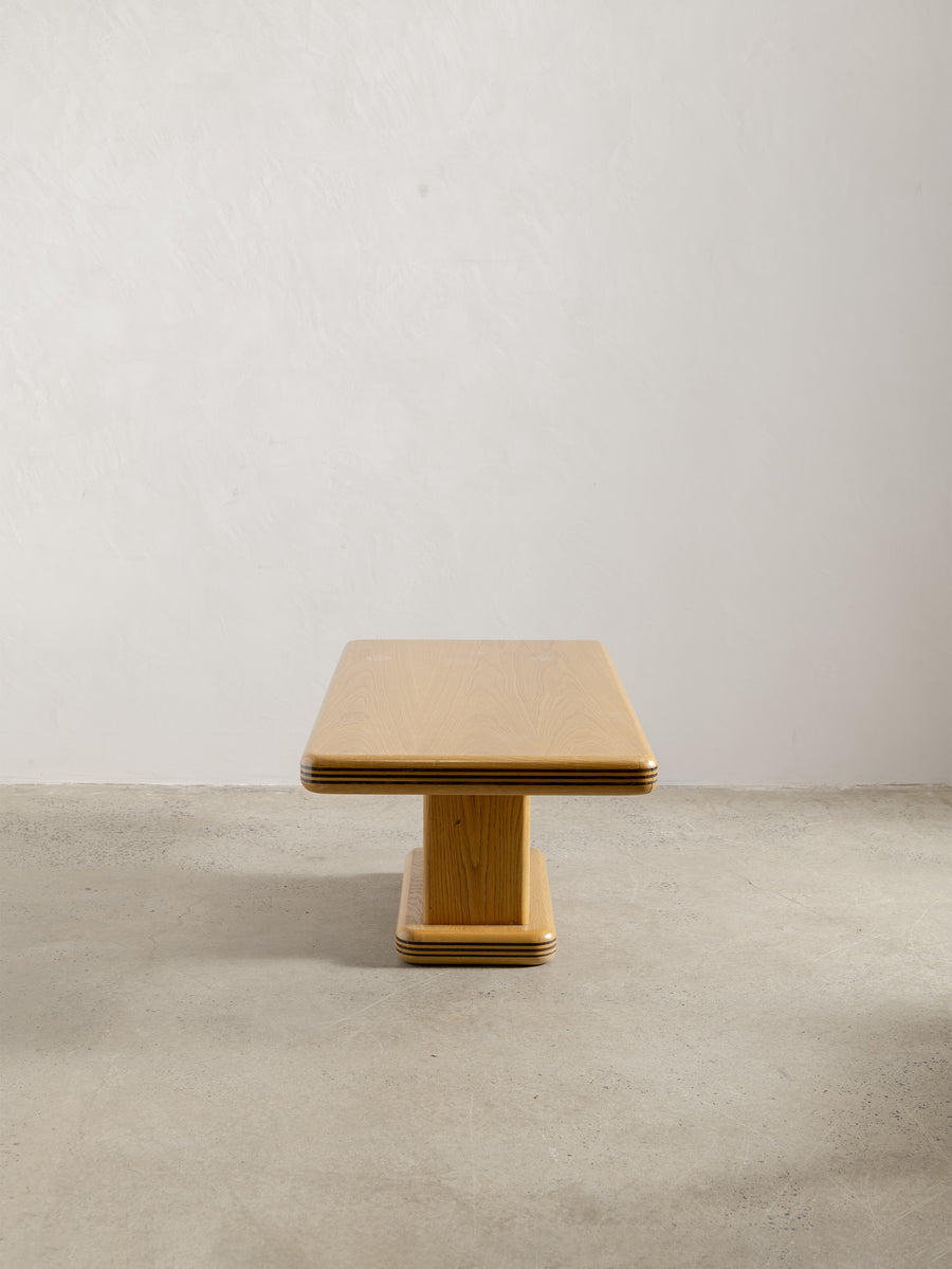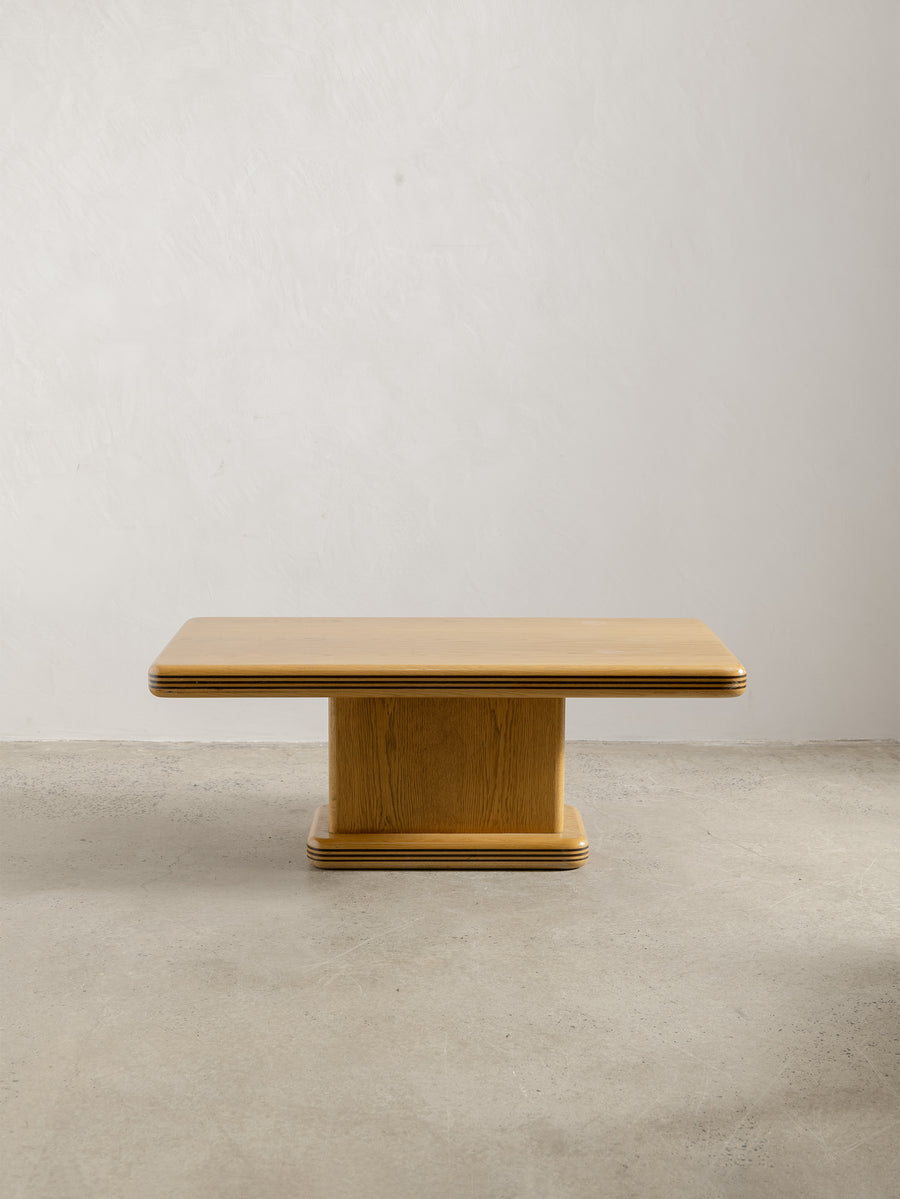 A refined 1980s coffee table characterised by its soft, architectural lines and minimalist form. The rectangular top rests on a pedestal base with rounded edges and layered detailing that give the piece a quiet sense of depth and proportion.