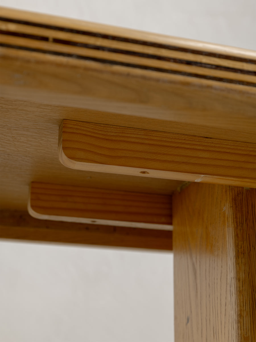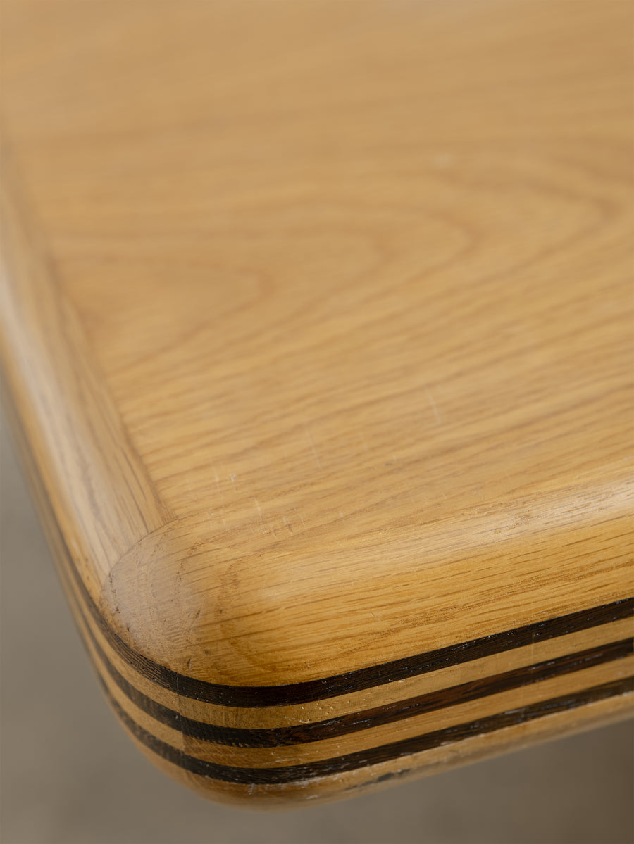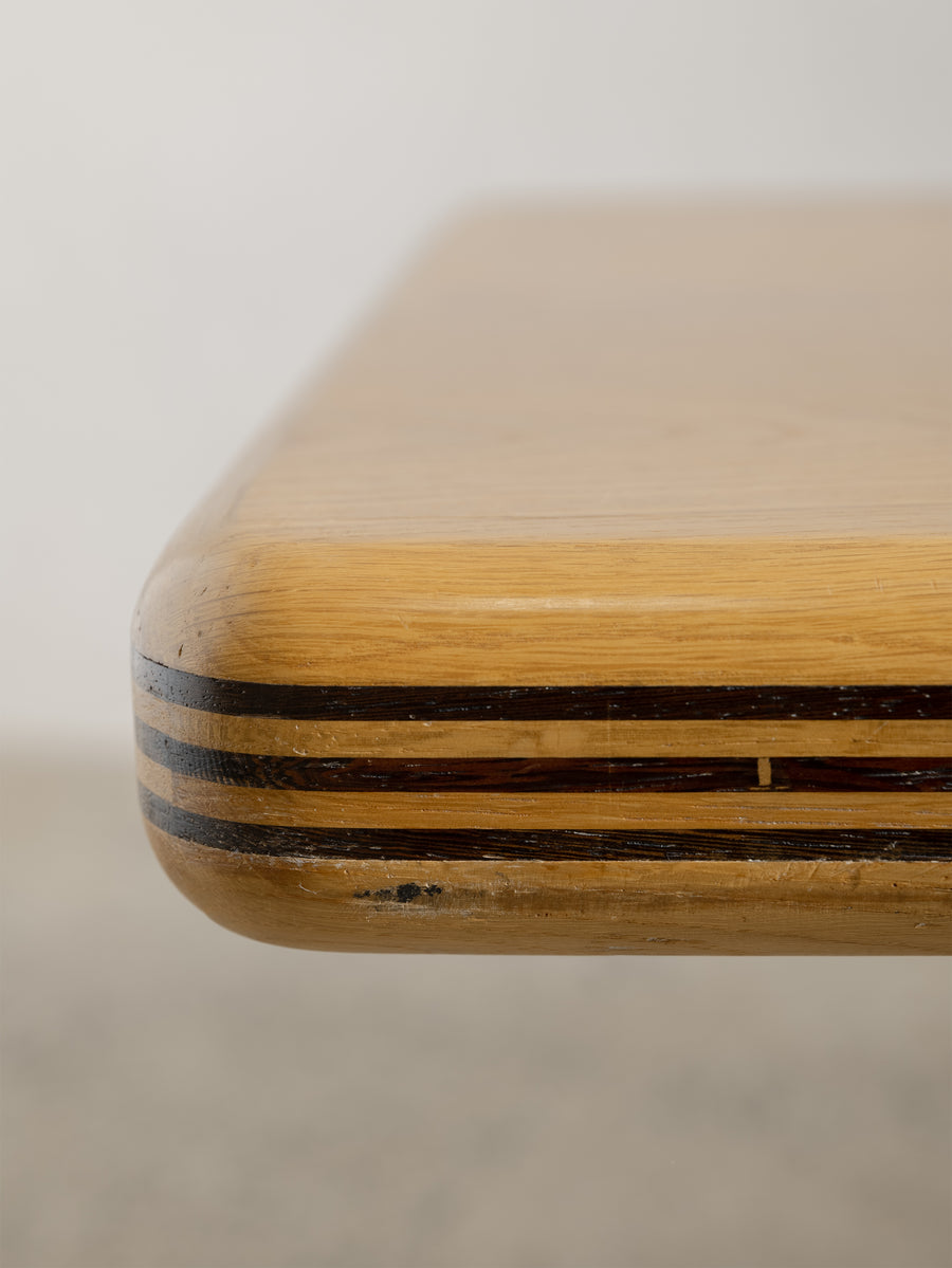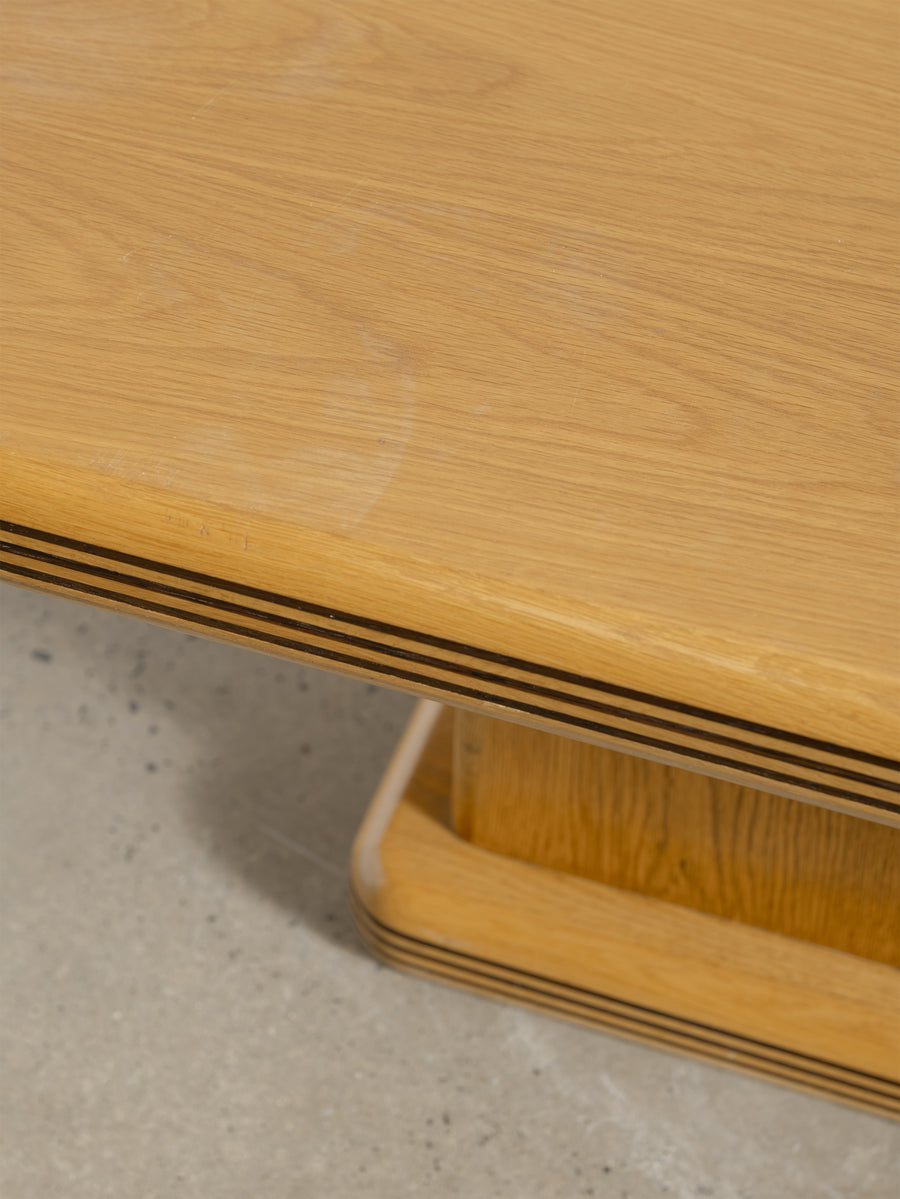 A refined 1980s coffee table characterised by its soft, architectural lines and minimalist form. The rectangular top rests on a pedestal base with rounded edges and layered detailing that give the piece a quiet sense of depth and proportion.