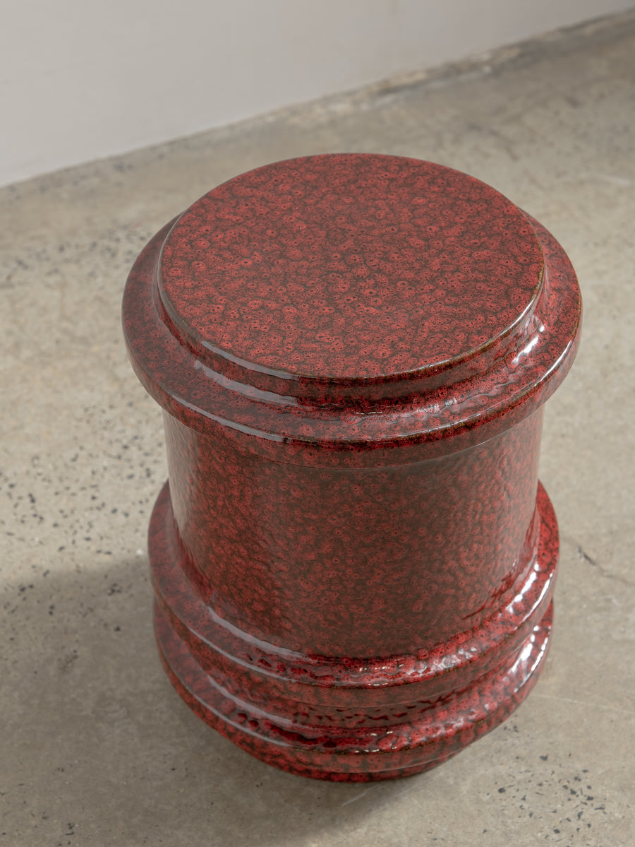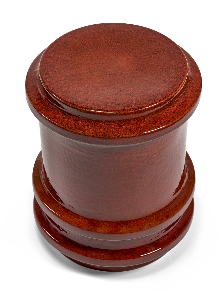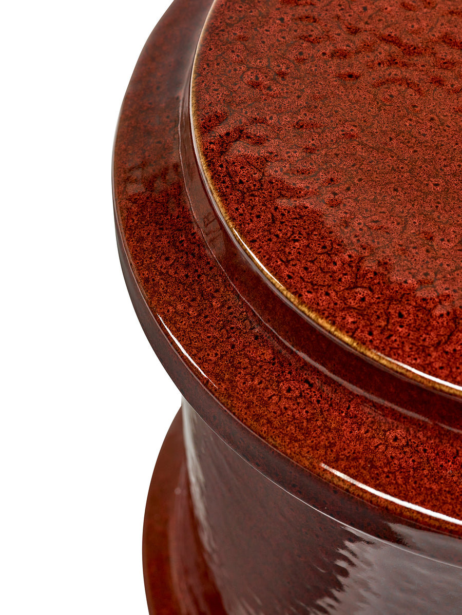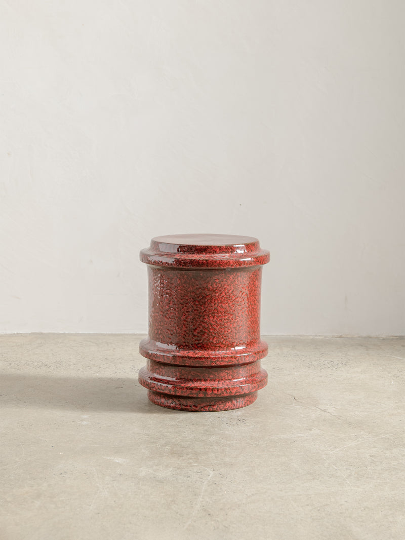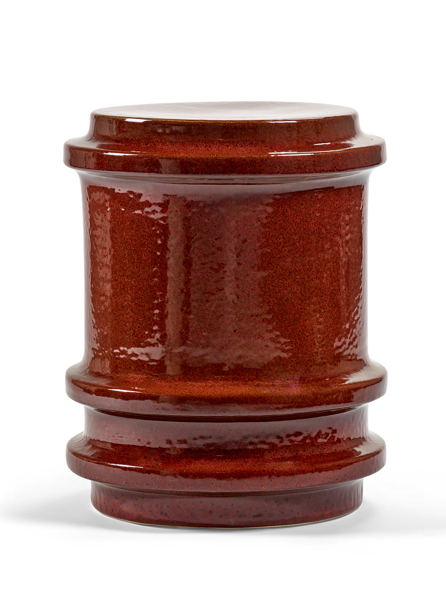 Made of glazed stoneware in a deep red, this side table or stool radiates heat. The vertical ridges add texture.