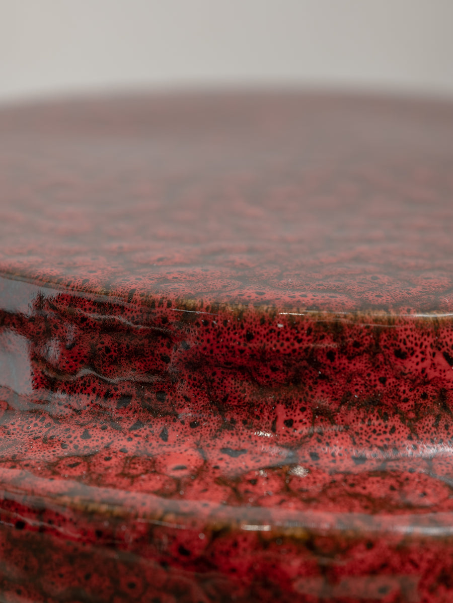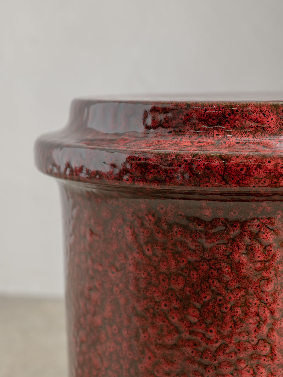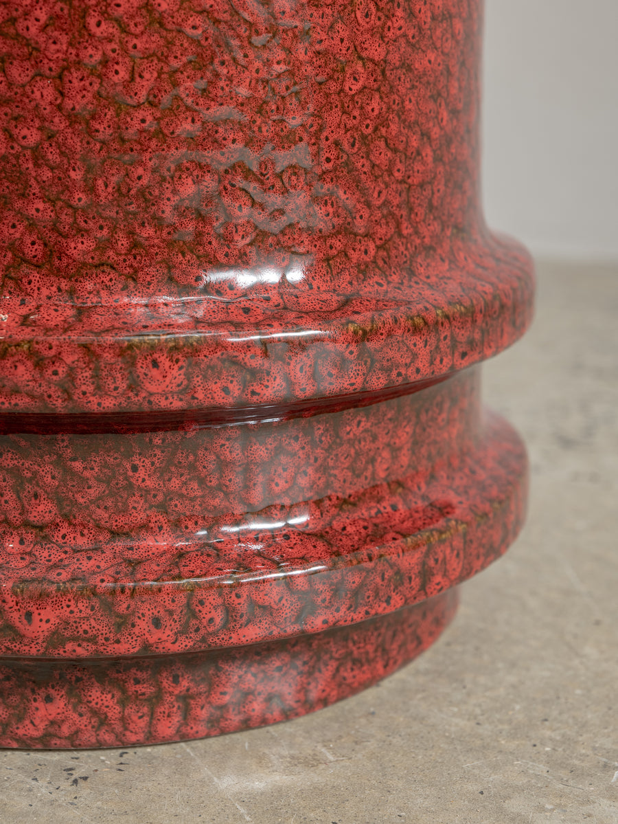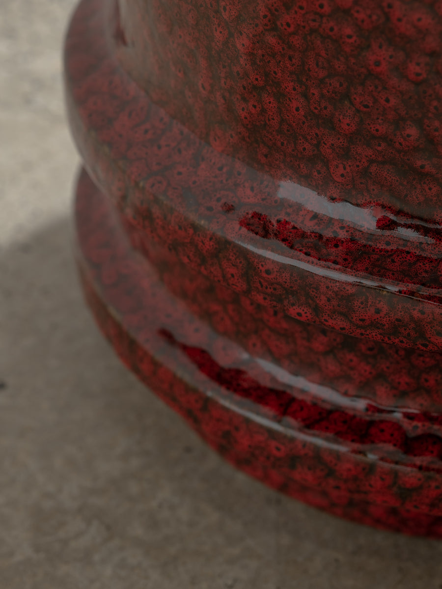Made of glazed stoneware in a deep red, this side table or stool radiates heat. The vertical ridges add texture.