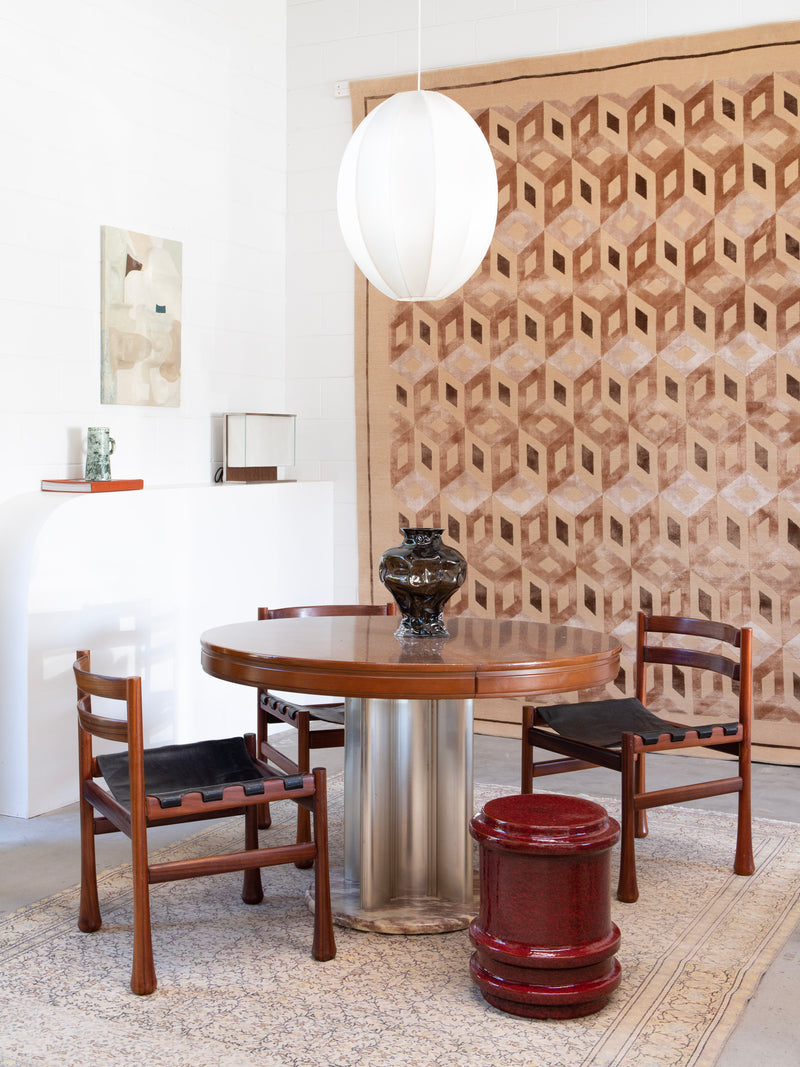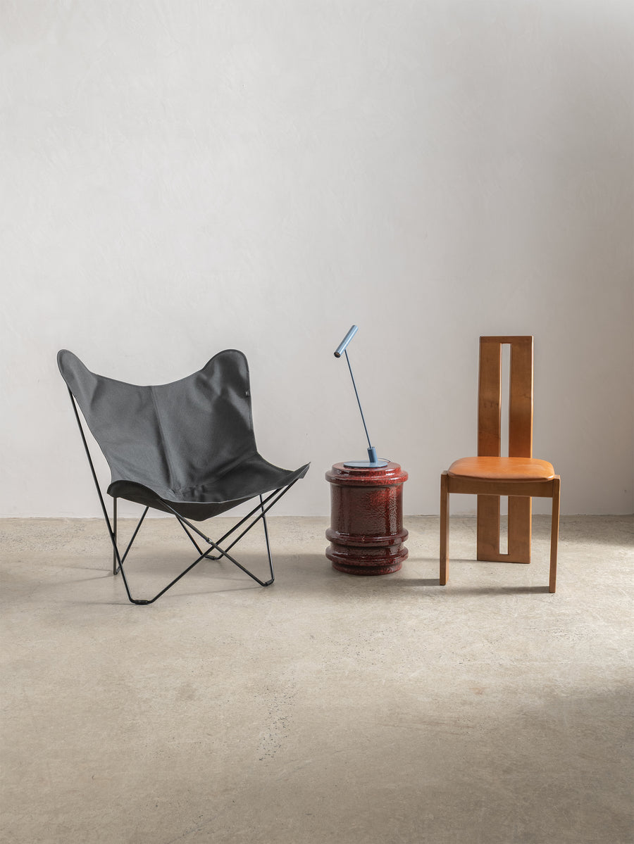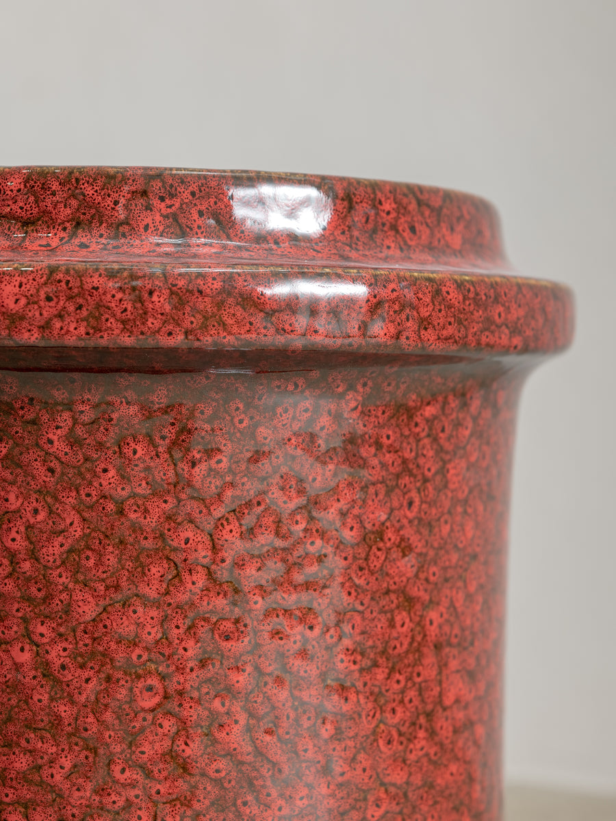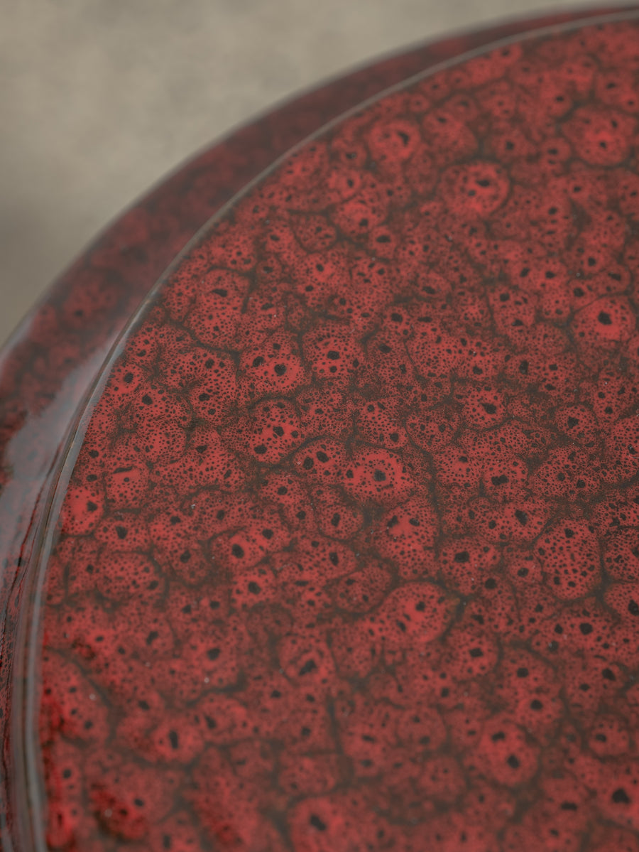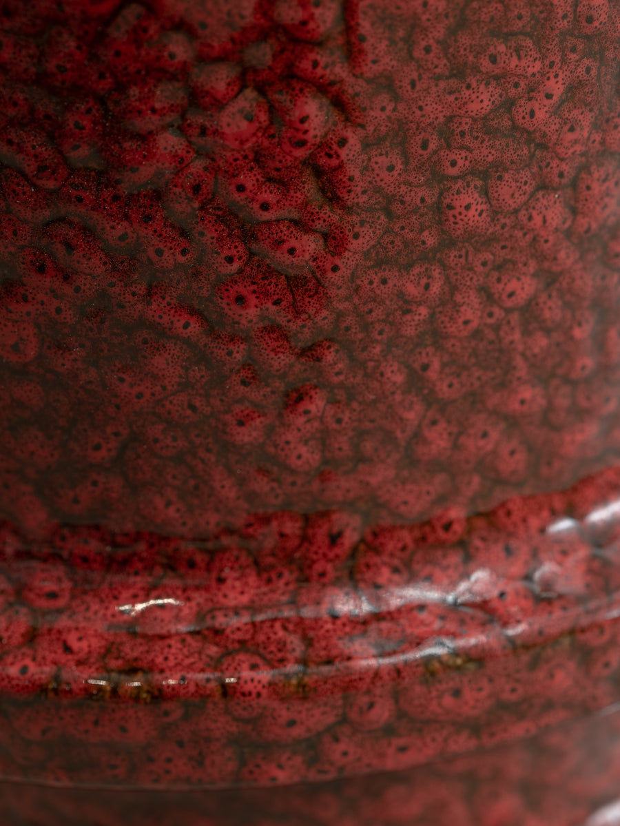 Made of glazed stoneware in a deep red, this side table or stool radiates heat. The vertical ridges add texture.