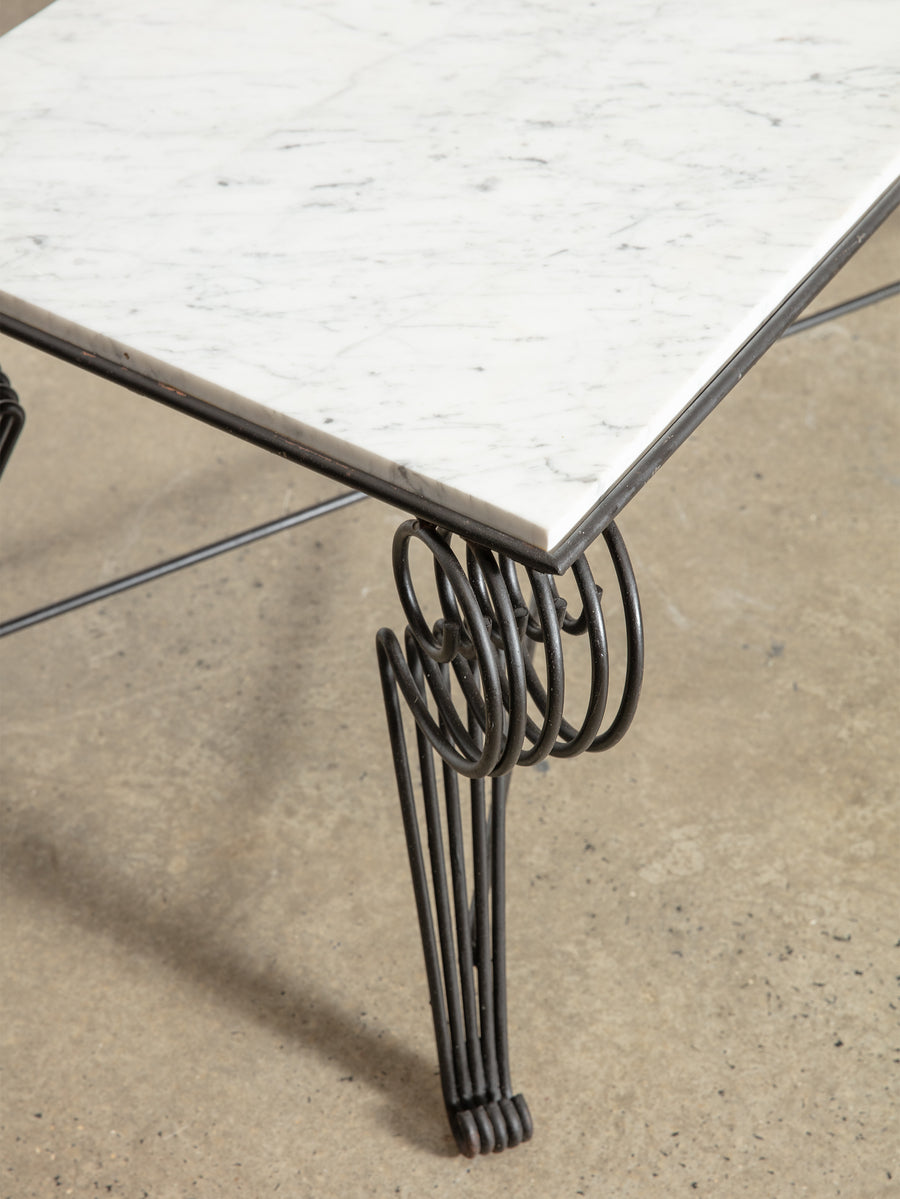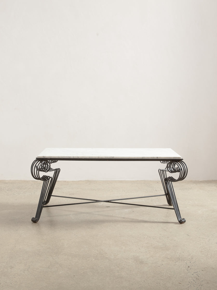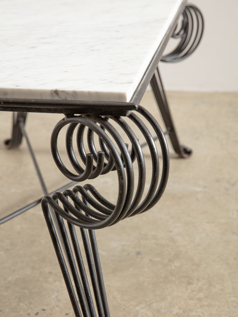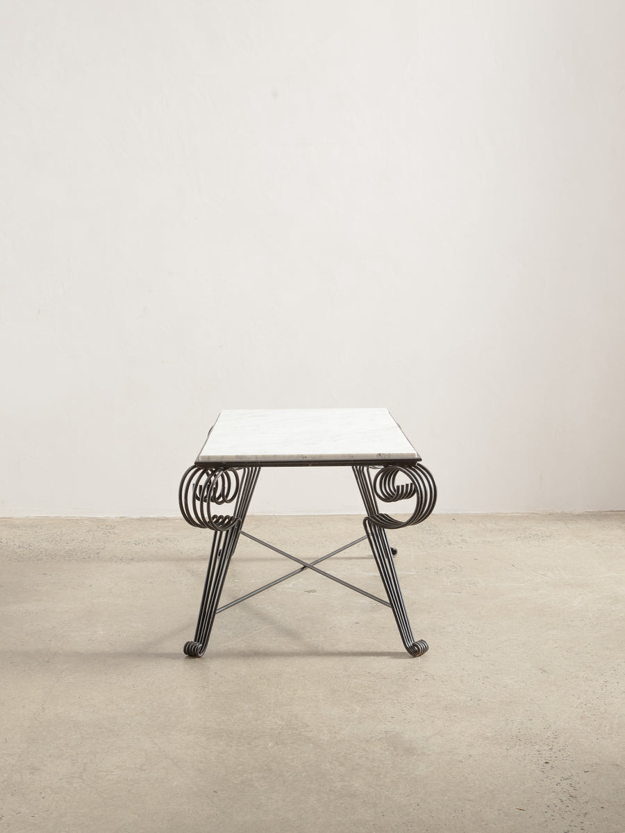 This 1950s coffee table pairs a refined white marble top with a sculptural wrought iron base. The legs sweep into bold scrolls, their decorative curves balanced by slender lines and cross-stretchers that bring strength and poise. Both practical and artistic, the table captures the elegance of European design from the period, where materiality and form were brought into harmony. Subtle variations in the marble surface and the aged iron finish enhance its vintage character and individuality.