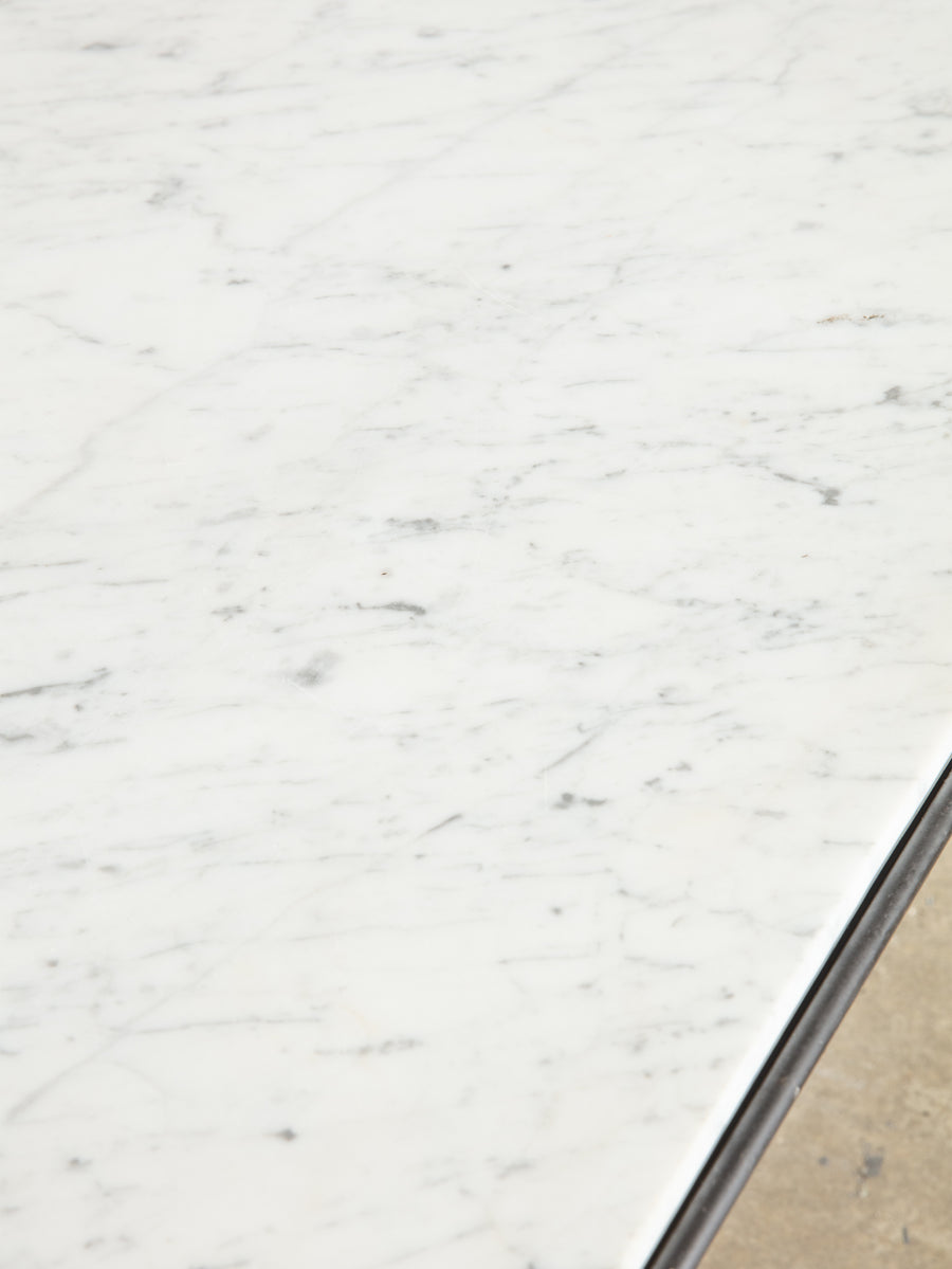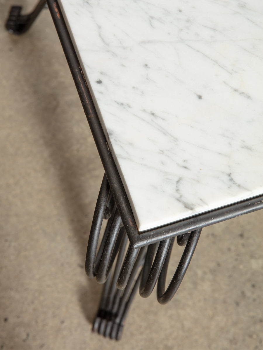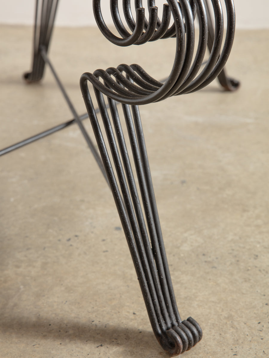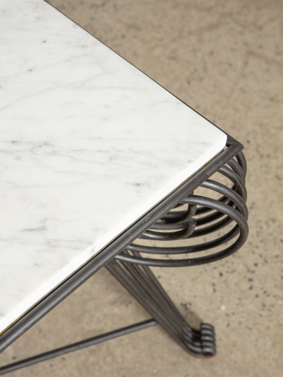 This 1950s coffee table pairs a refined white marble top with a sculptural wrought iron base. The legs sweep into bold scrolls, their decorative curves balanced by slender lines and cross-stretchers that bring strength and poise. Both practical and artistic, the table captures the elegance of European design from the period, where materiality and form were brought into harmony. Subtle variations in the marble surface and the aged iron finish enhance its vintage character and individuality.