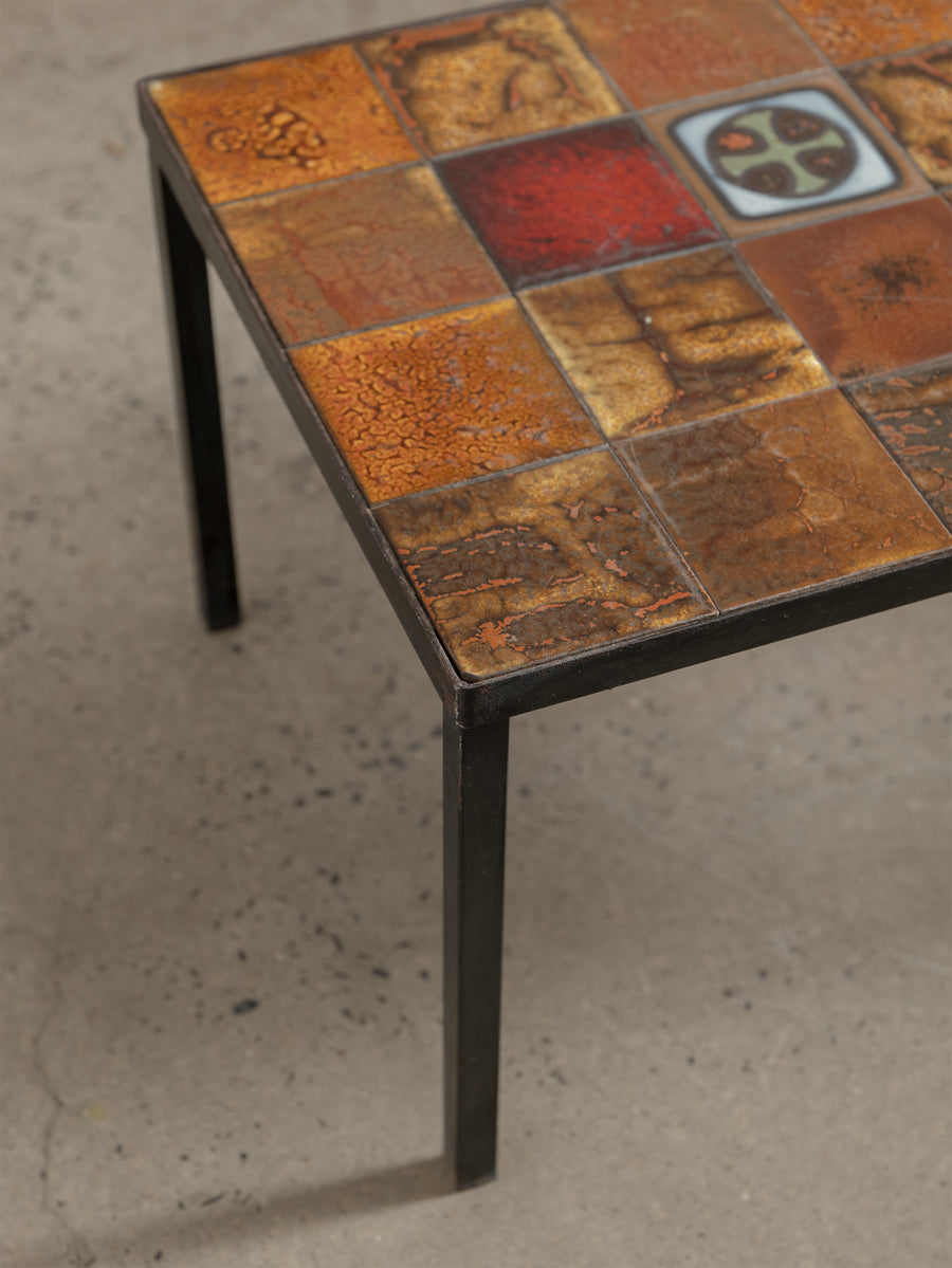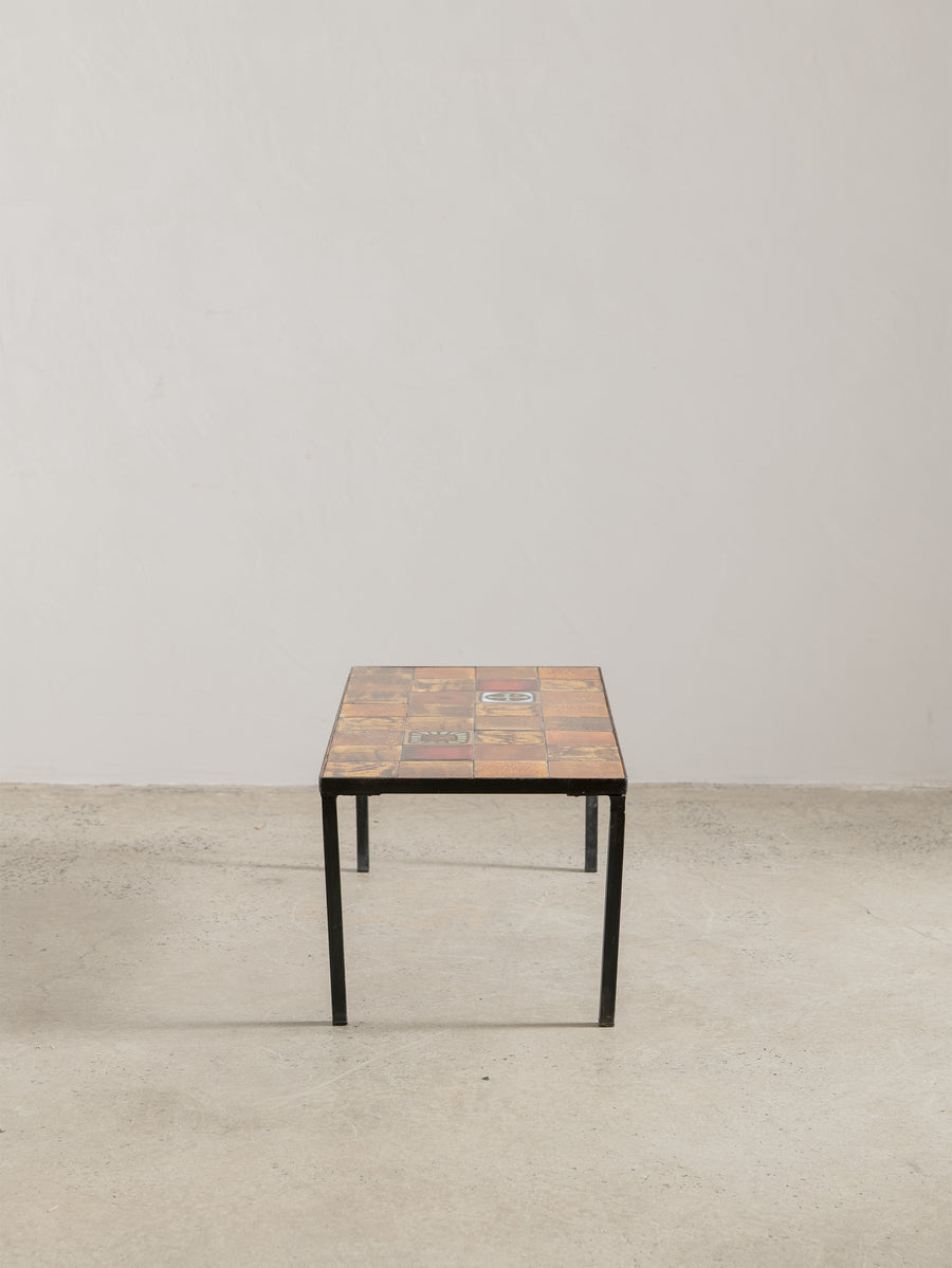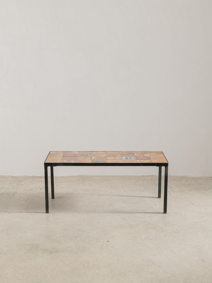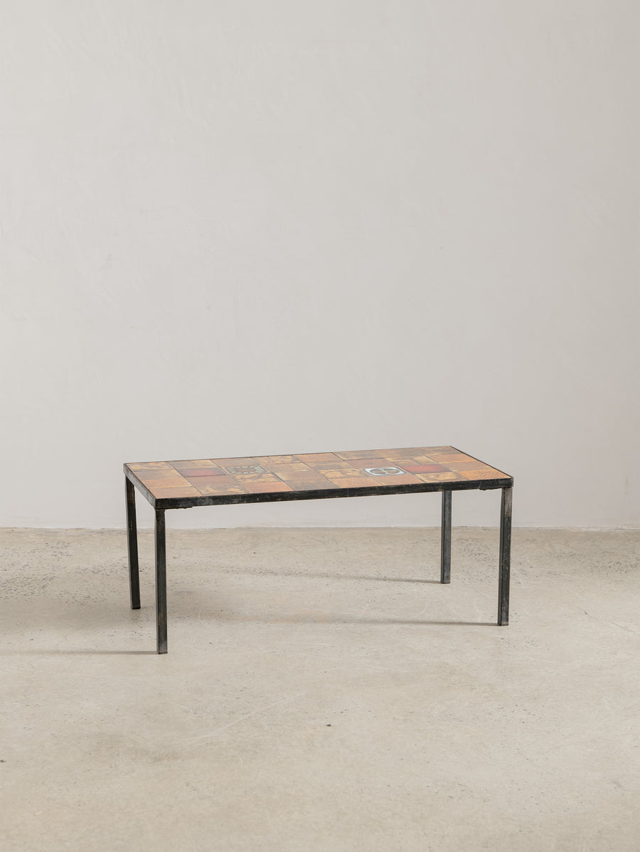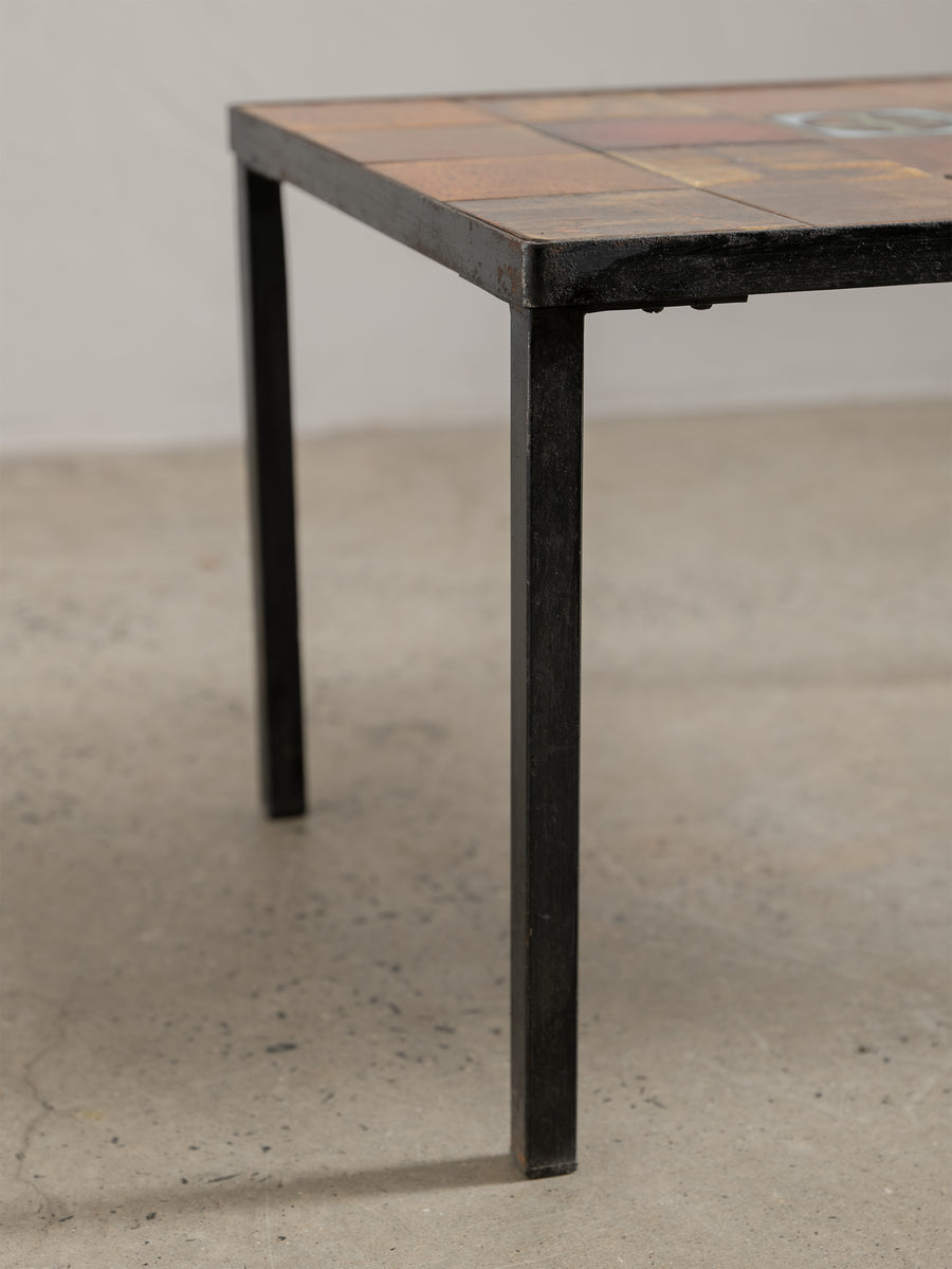 Mid-century ceramic and iron coffee table in the manner of Roger Capron, crafted in Vallauris, France. The tiled top features a striking mosaic of richly glazed earthenware squares in tones of ochre, rust, and terracotta, punctuated with a bold enamel motif. Resting on a slender blackened iron frame, this piece embodies the warmth and artistry of French Riviera design in the 1960s - expressive yet effortlessly refined.