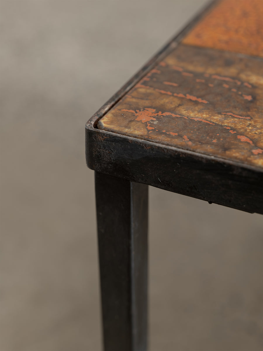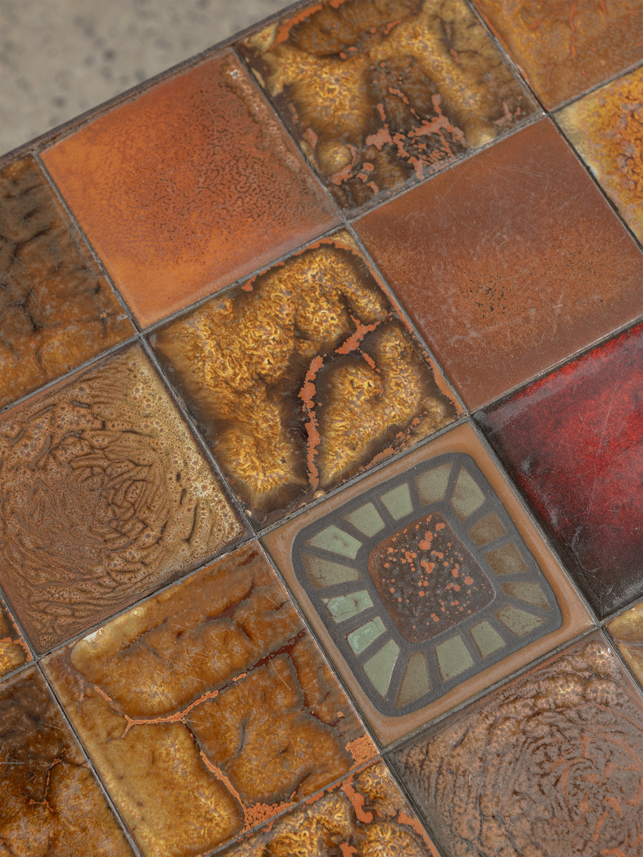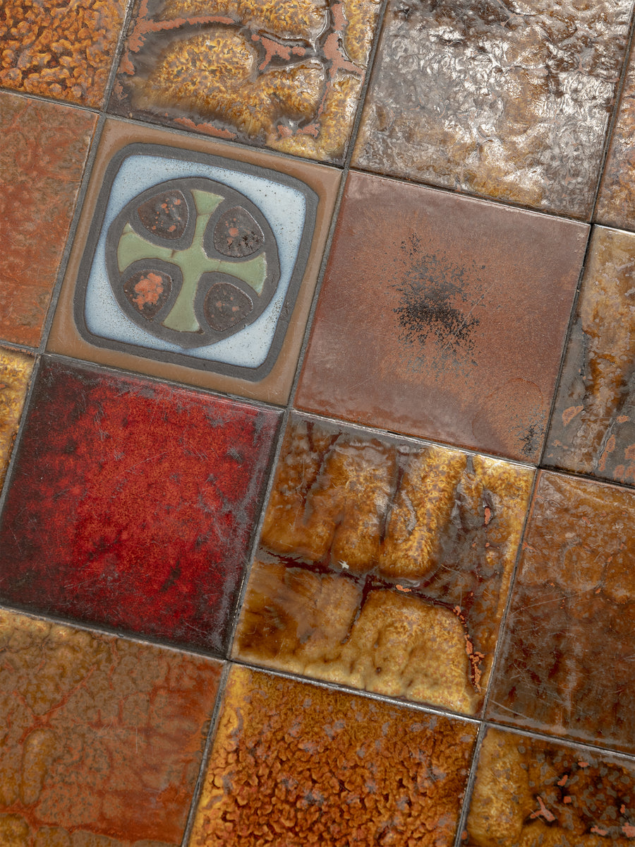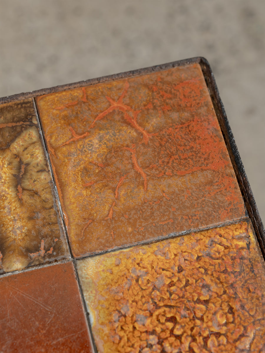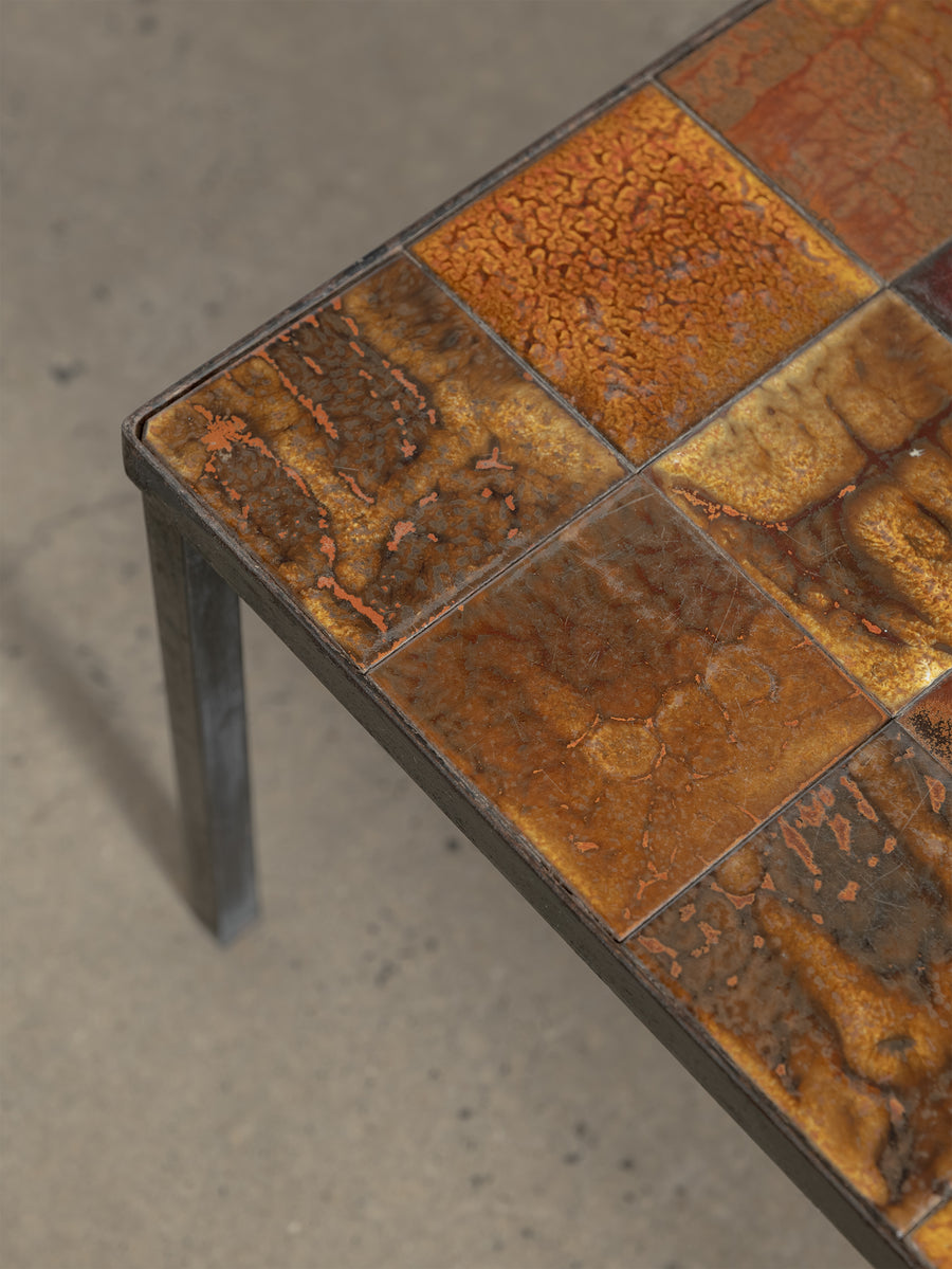 Mid-century ceramic and iron coffee table in the manner of Roger Capron, crafted in Vallauris, France. The tiled top features a striking mosaic of richly glazed earthenware squares in tones of ochre, rust, and terracotta, punctuated with a bold enamel motif. Resting on a slender blackened iron frame, this piece embodies the warmth and artistry of French Riviera design in the 1960s - expressive yet effortlessly refined.