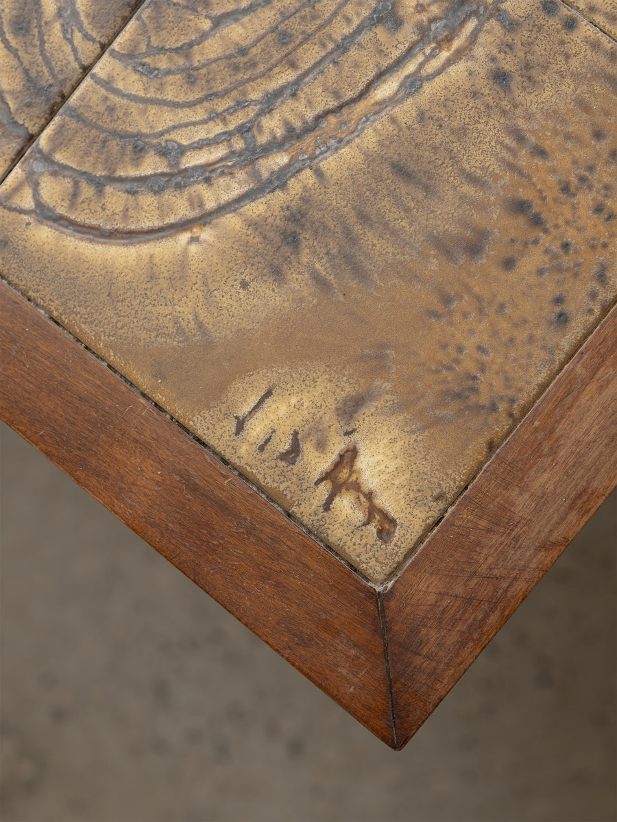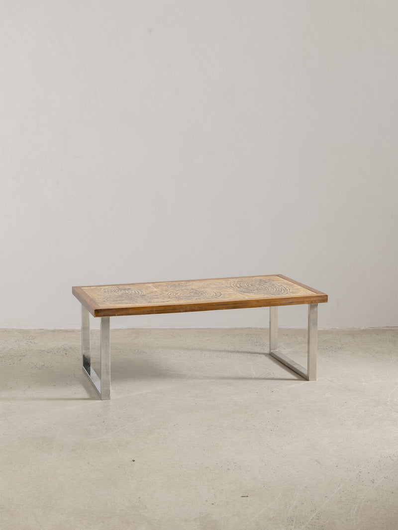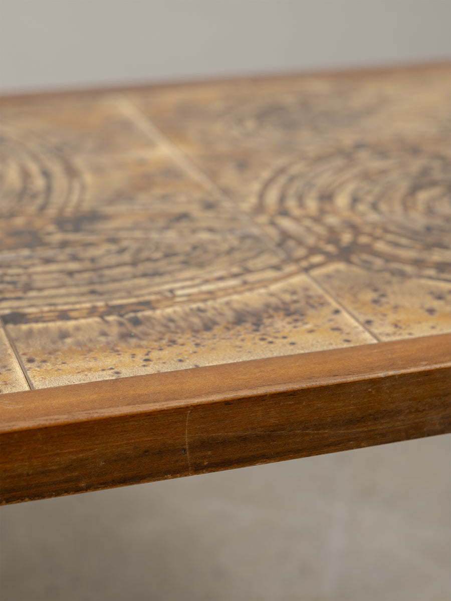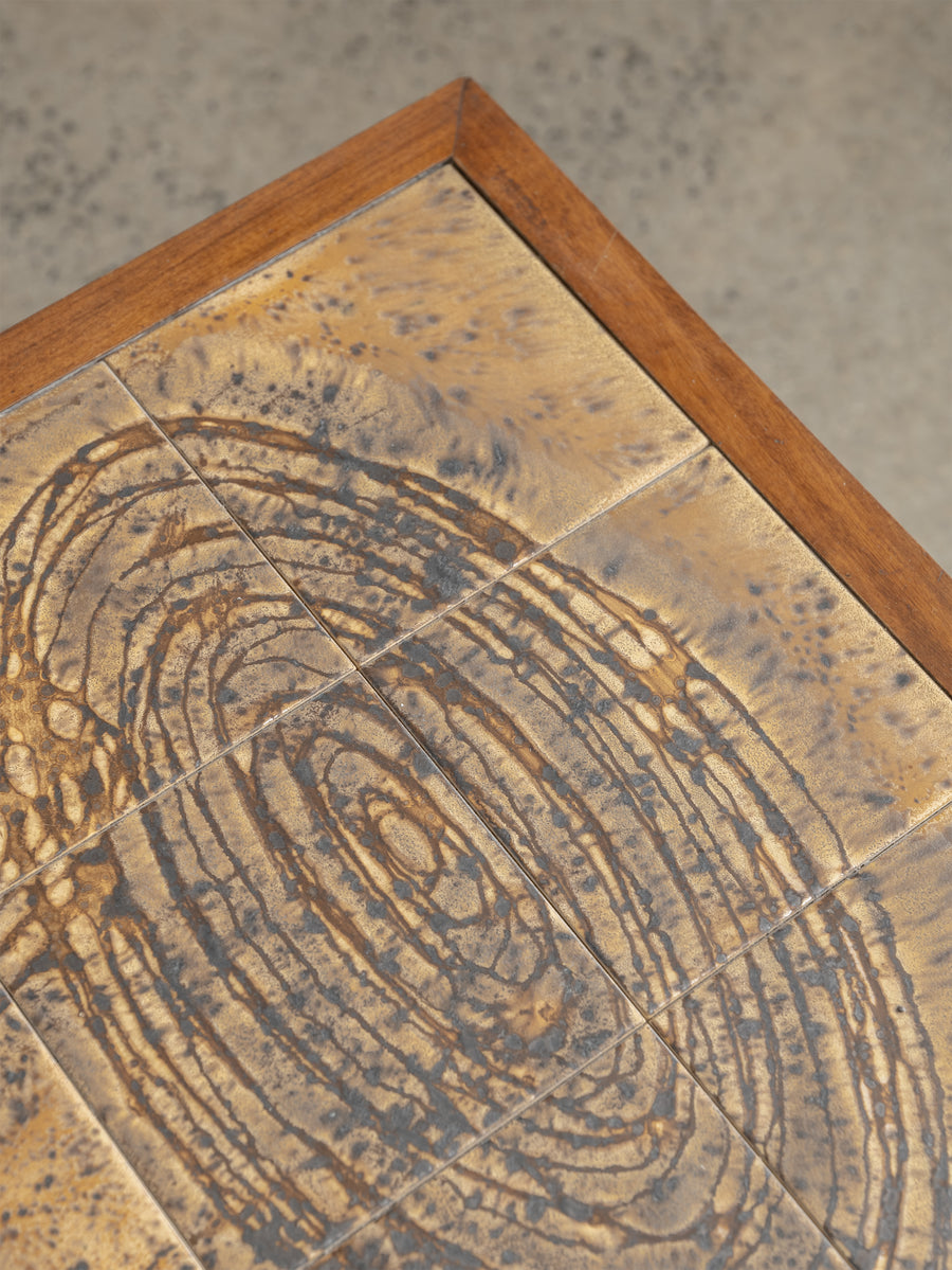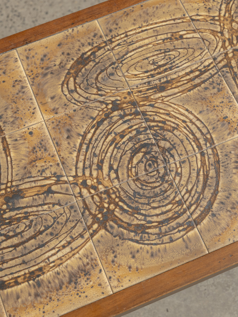 Wooden and ceramic coffee table by Jean D’Asti, created in Vallauris, France during the 1970s. The tiled surface features an abstract, hand-enameled design in earthy tones of beige, brown, and black — characteristic of D’Asti’s rustic yet sophisticated style. Resting on a solid wood frame with polished metal legs, the piece captures the spirit of the French Riviera’s ceramic movement, where art and function meet in perfect balance.