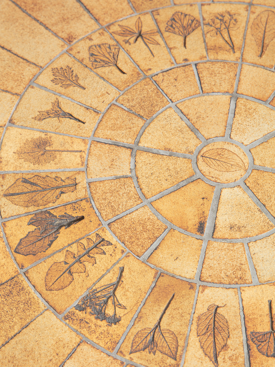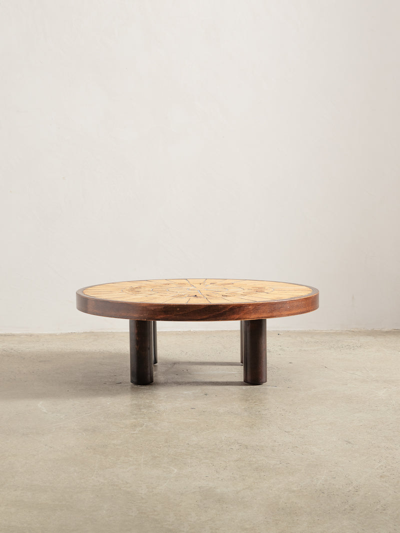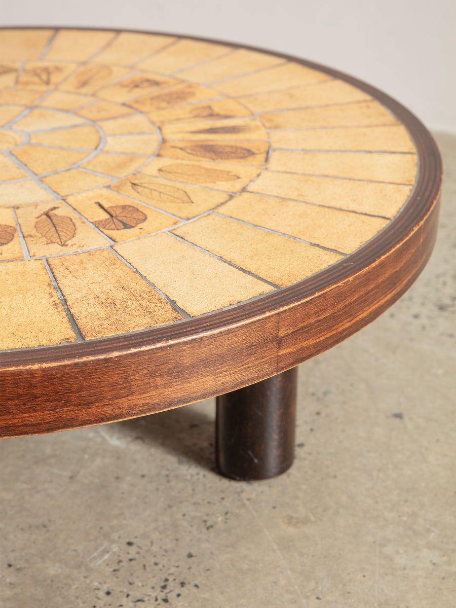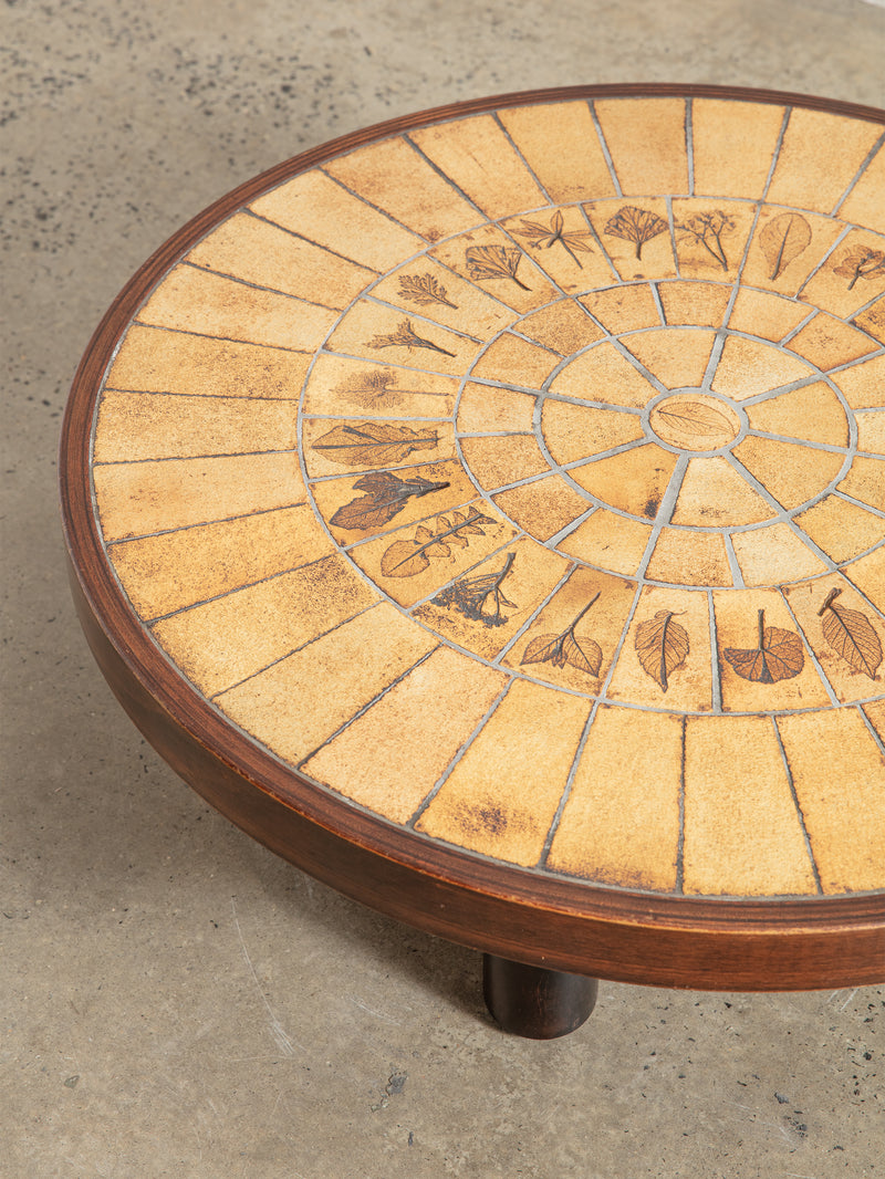 A low ceramic coffee table by French designer Roger Capron, circa 1960s. Handcrafted with studio craft precision, the circular tiled top is decorated with impressed herbs and botanical motifs, capturing Capron’s signature dialogue between nature and form.