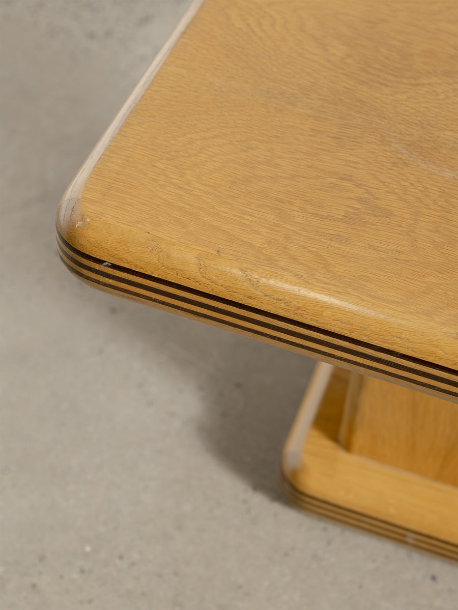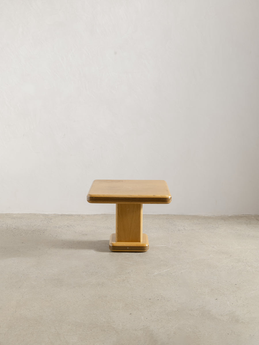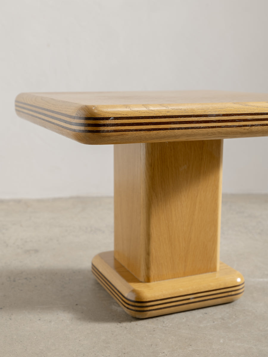 A refined 1980s coffee table characterised by its soft, architectural lines and minimalist form. The rectangular top rests on a pedestal base with rounded edges and layered detailing that give the piece a quiet sense of depth and proportion.