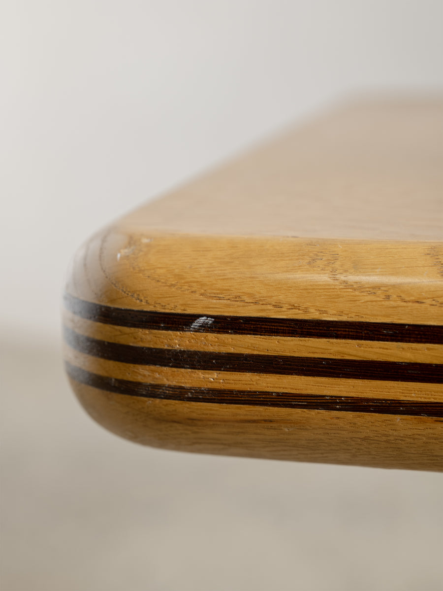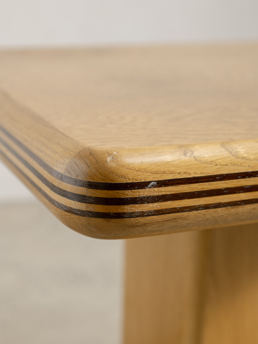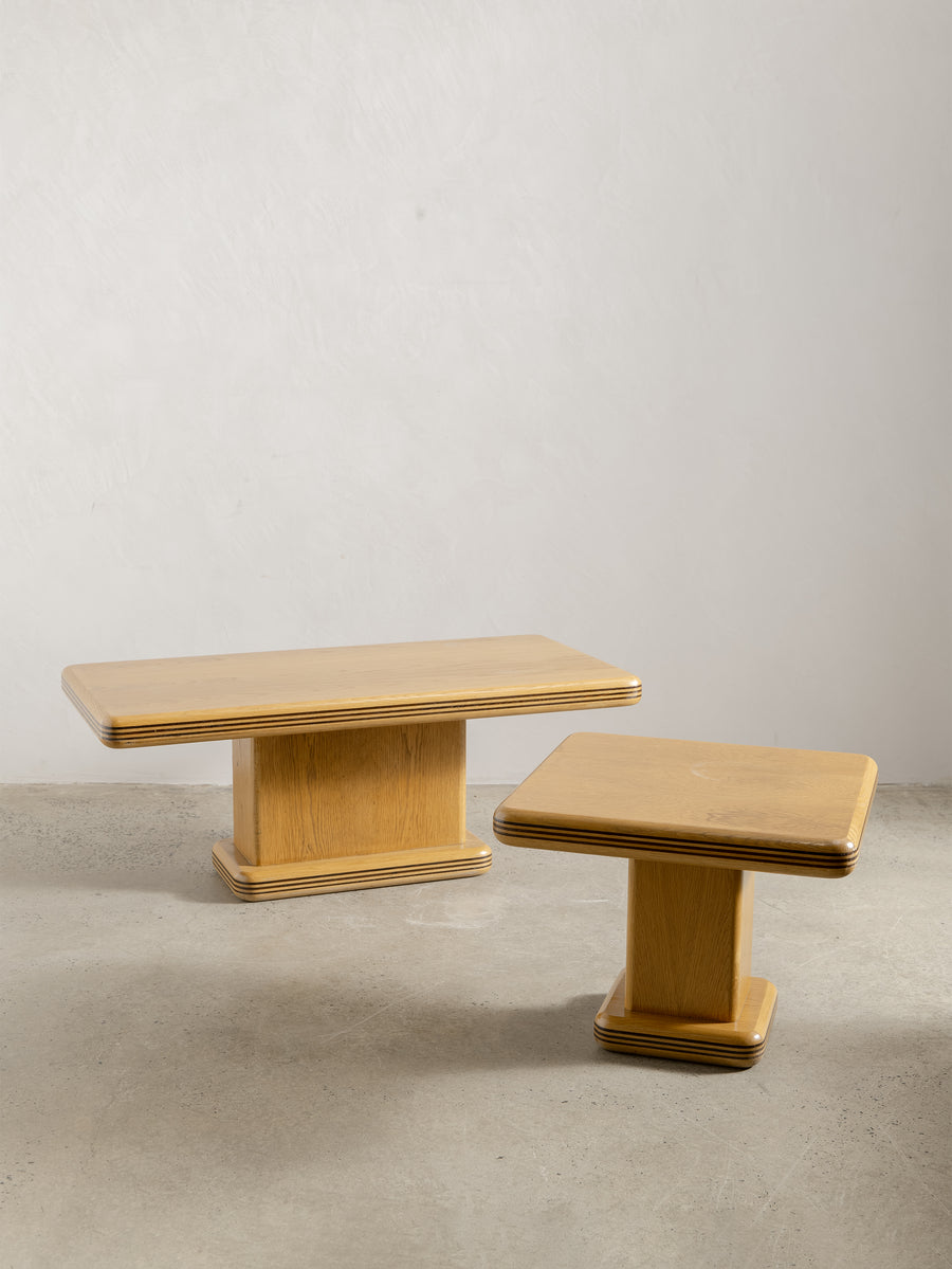 A refined 1980s coffee table characterised by its soft, architectural lines and minimalist form. The rectangular top rests on a pedestal base with rounded edges and layered detailing that give the piece a quiet sense of depth and proportion.