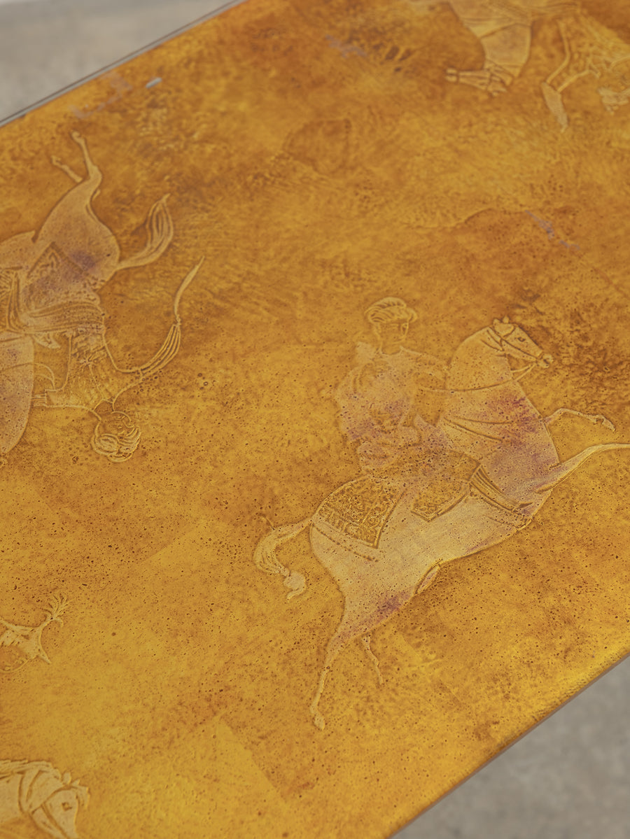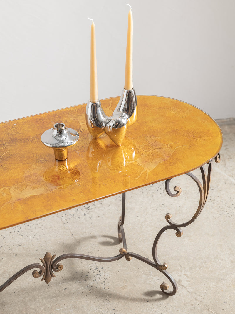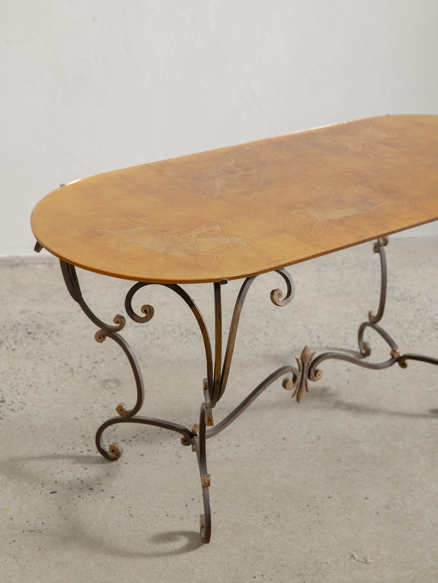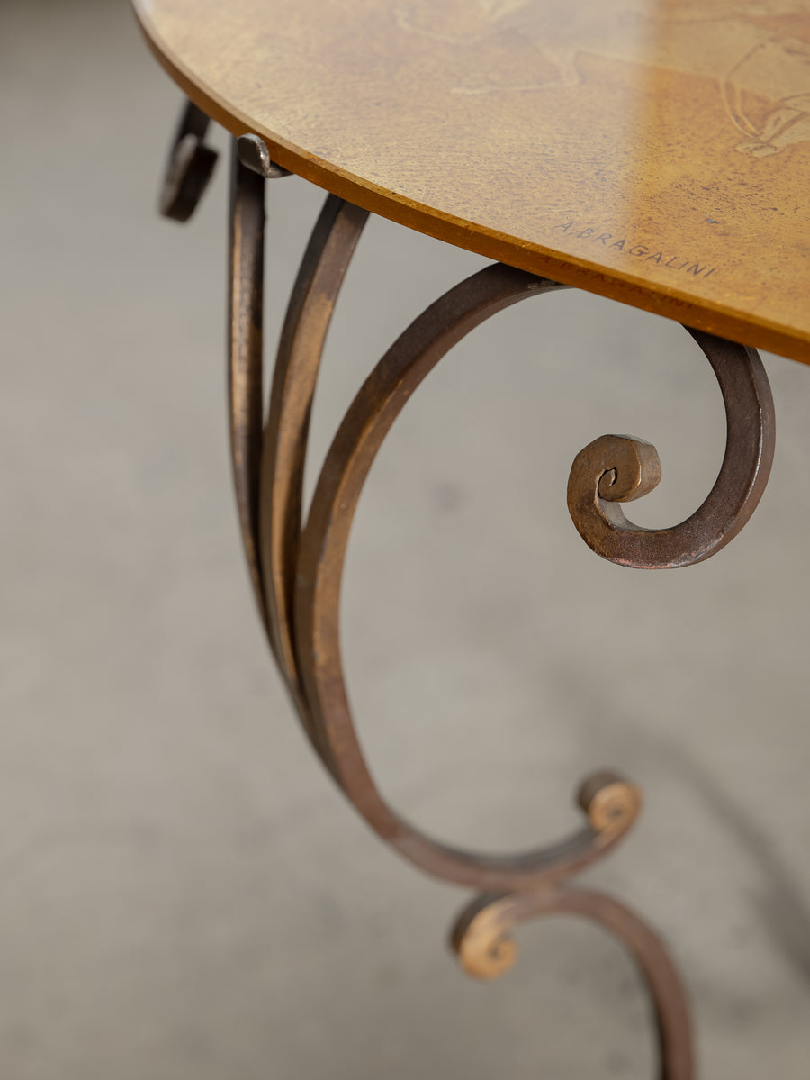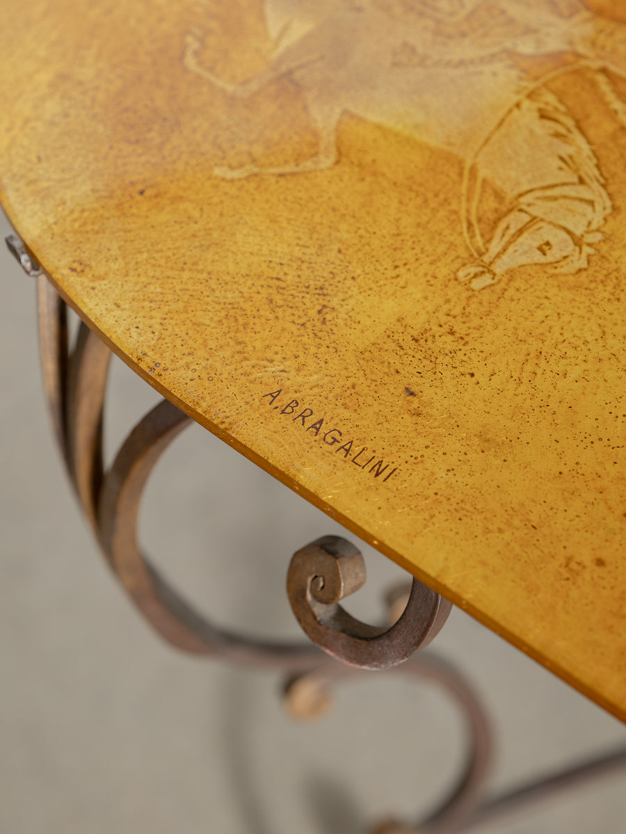 A rare collector’s piece by Angelo Bragalini, this coffee table captures the expressive detail of mid-century Italian design. The hand-painted glass top features a golden backdrop with dynamic scenes of Turkish horsemen in motion - each figure etched with delicate precision. Set on a sculptural wrought iron base, its scrolling curves are finished with subtle gilded accents that echo the tones of the top. Signed by the artist and presented in excellent vintage condition, this is a striking statement of craftsmanship, history, and form.