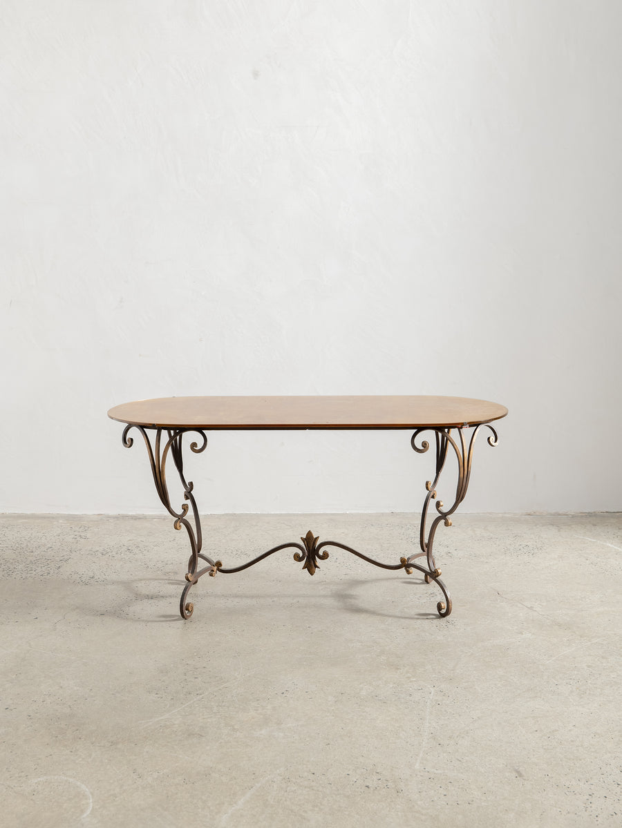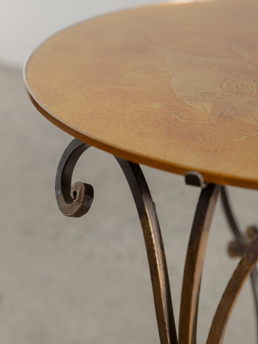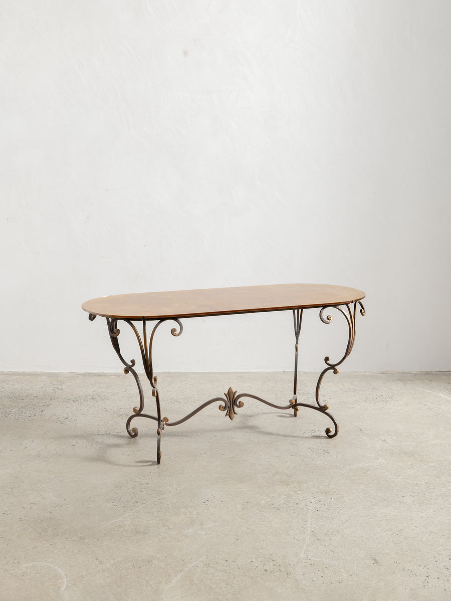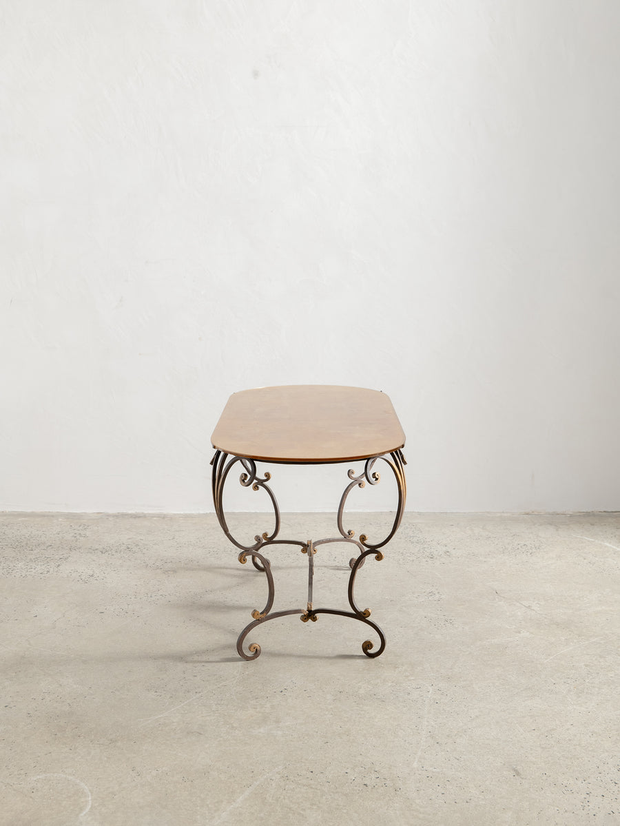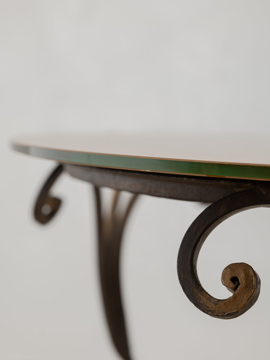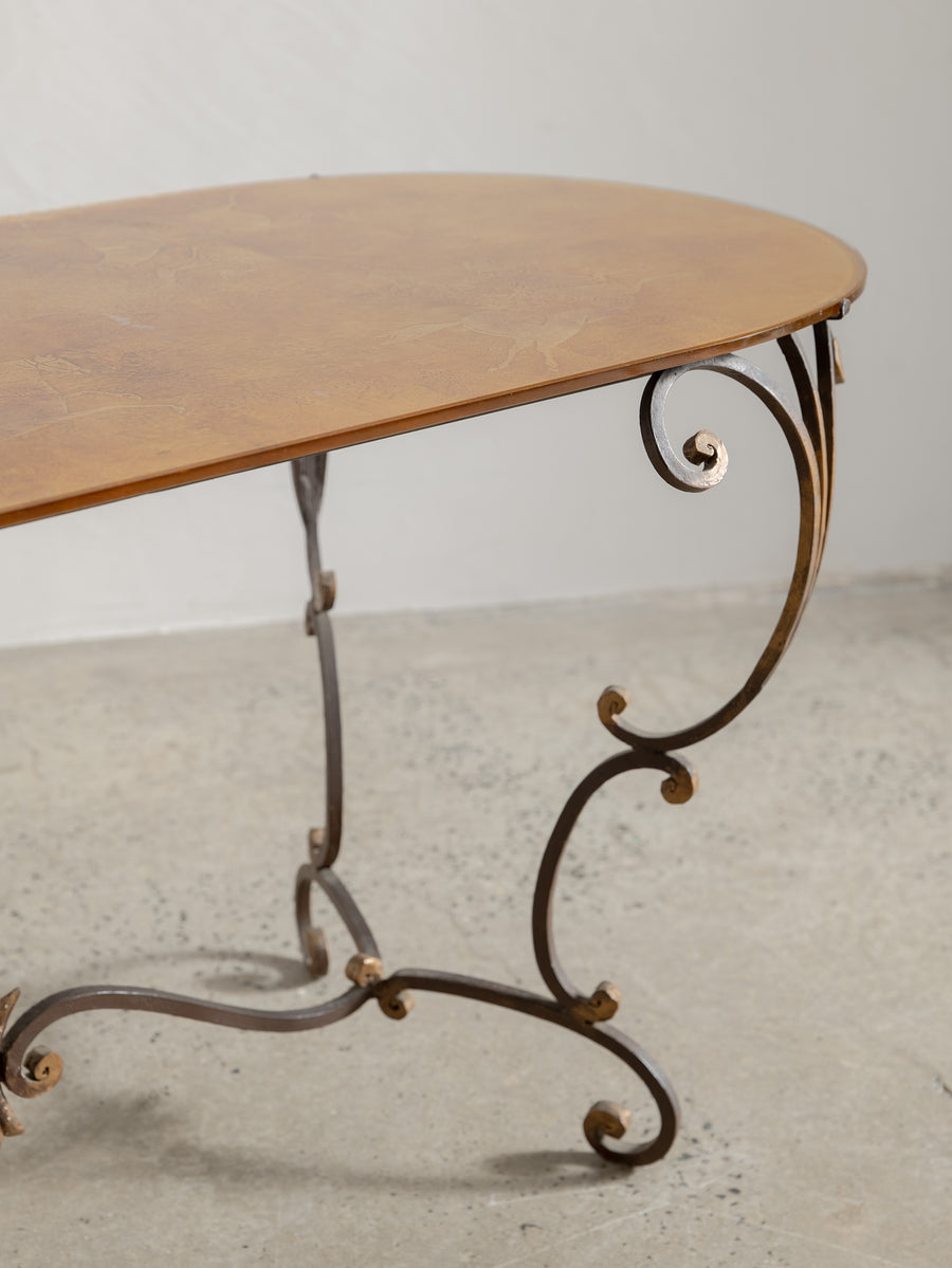 A rare collector’s piece by Angelo Bragalini, this coffee table captures the expressive detail of mid-century Italian design. The hand-painted glass top features a golden backdrop with dynamic scenes of Turkish horsemen in motion - each figure etched with delicate precision. Set on a sculptural wrought iron base, its scrolling curves are finished with subtle gilded accents that echo the tones of the top. Signed by the artist and presented in excellent vintage condition, this is a striking statement of craftsmanship, history, and form.