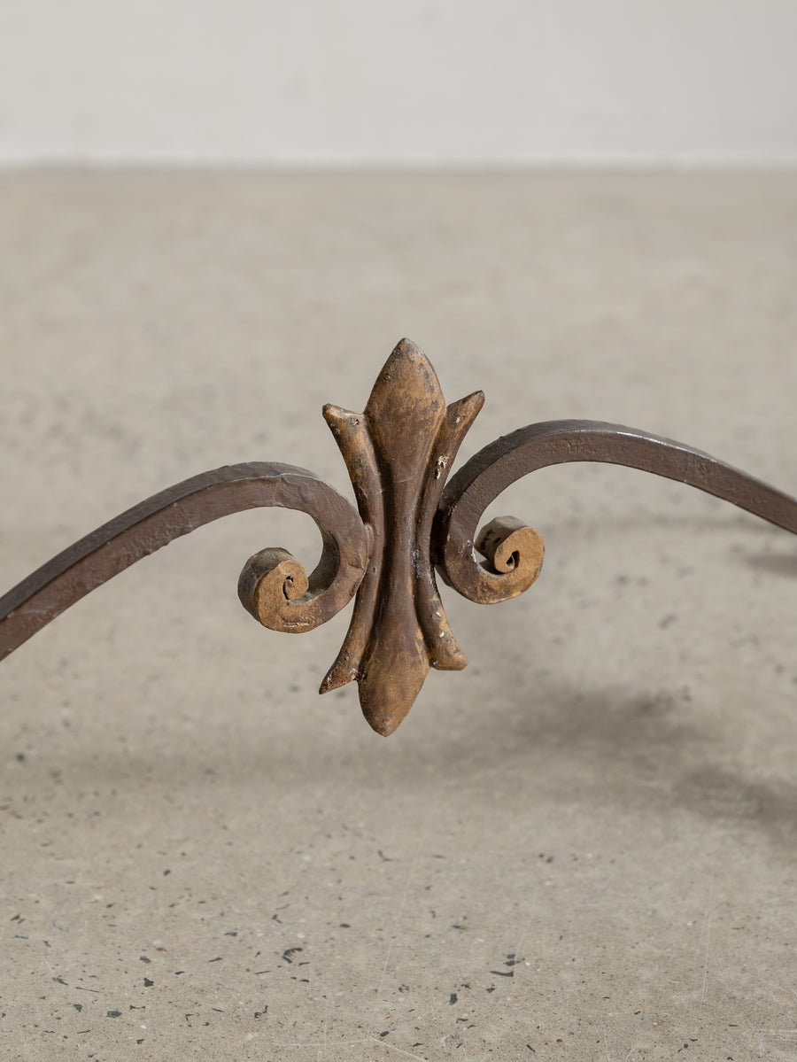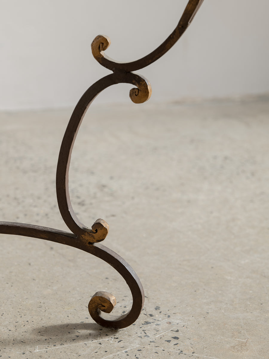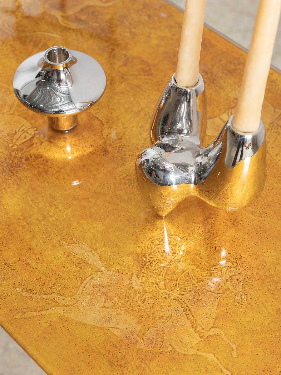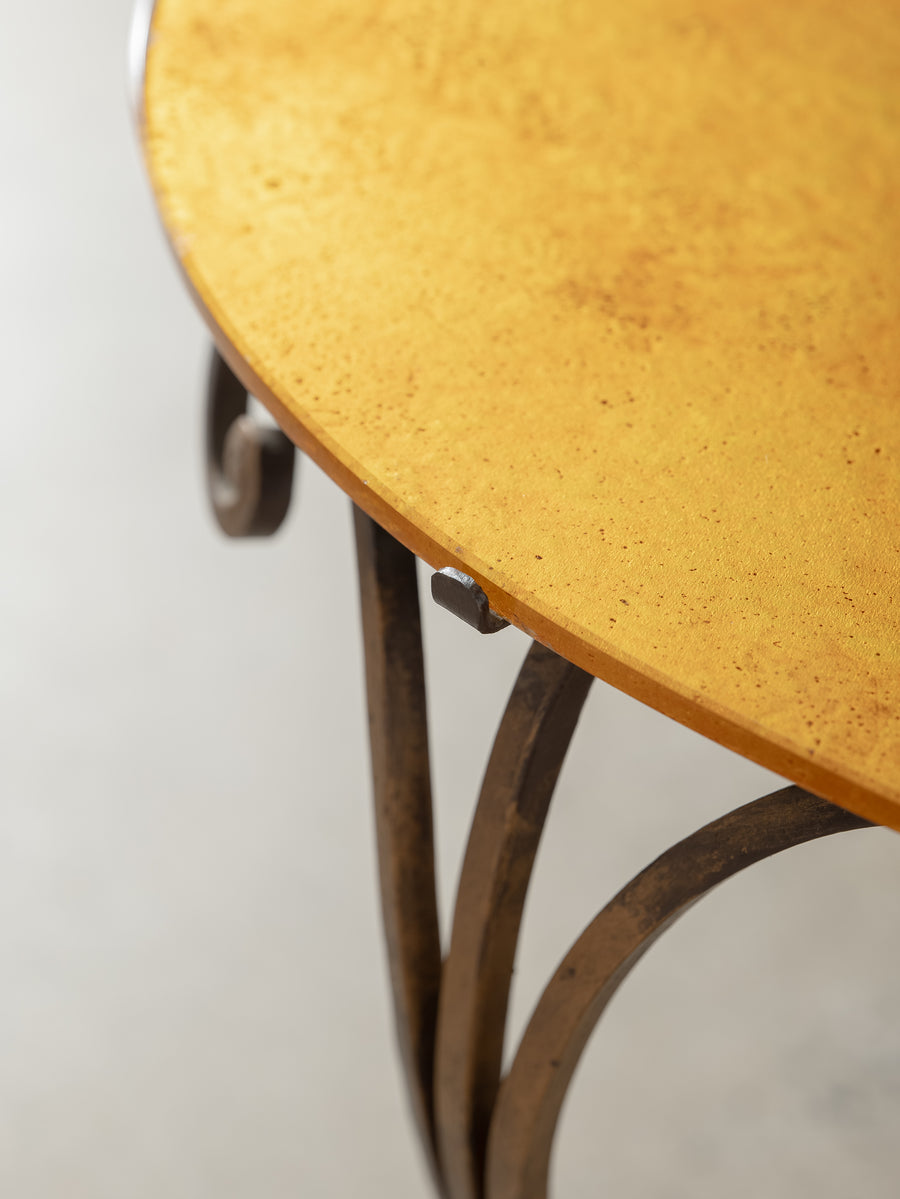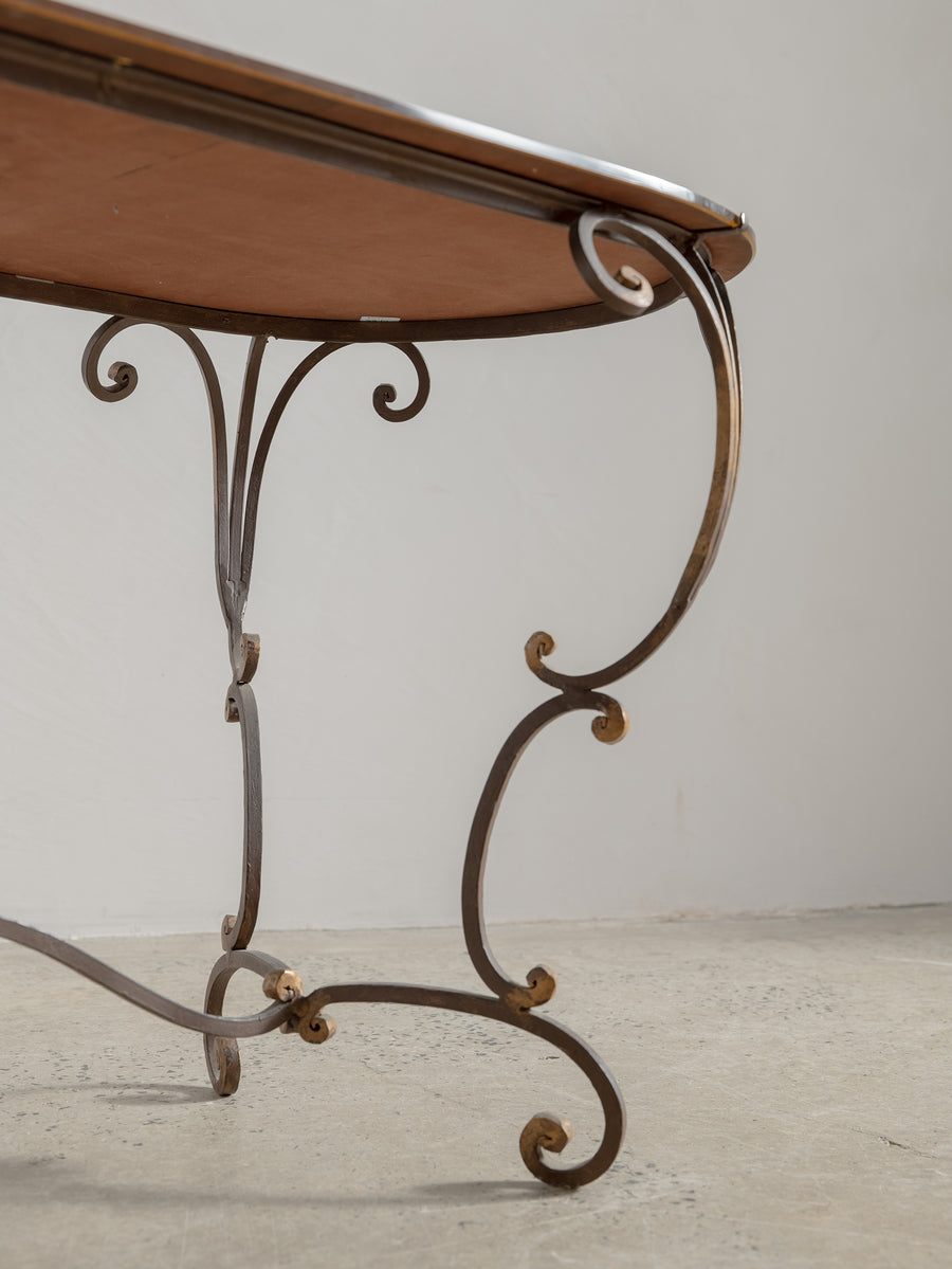 A rare collector’s piece by Angelo Bragalini, this coffee table captures the expressive detail of mid-century Italian design. The hand-painted glass top features a golden backdrop with dynamic scenes of Turkish horsemen in motion - each figure etched with delicate precision. Set on a sculptural wrought iron base, its scrolling curves are finished with subtle gilded accents that echo the tones of the top. Signed by the artist and presented in excellent vintage condition, this is a striking statement of craftsmanship, history, and form.