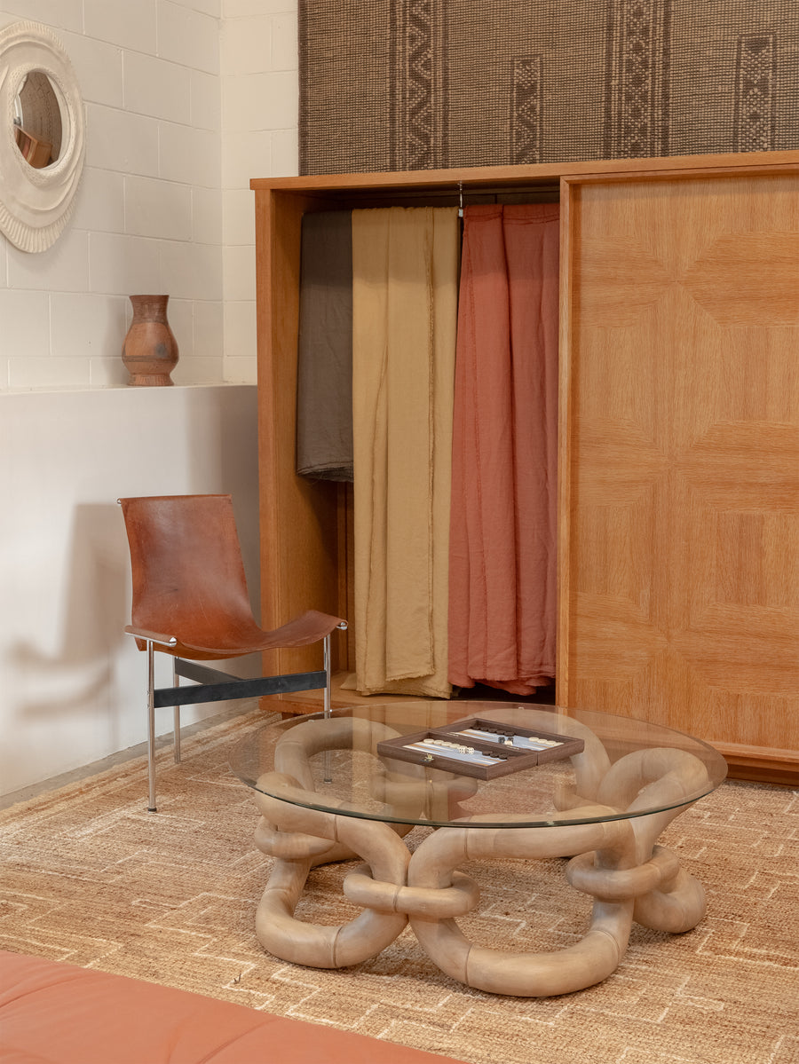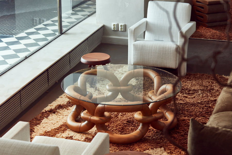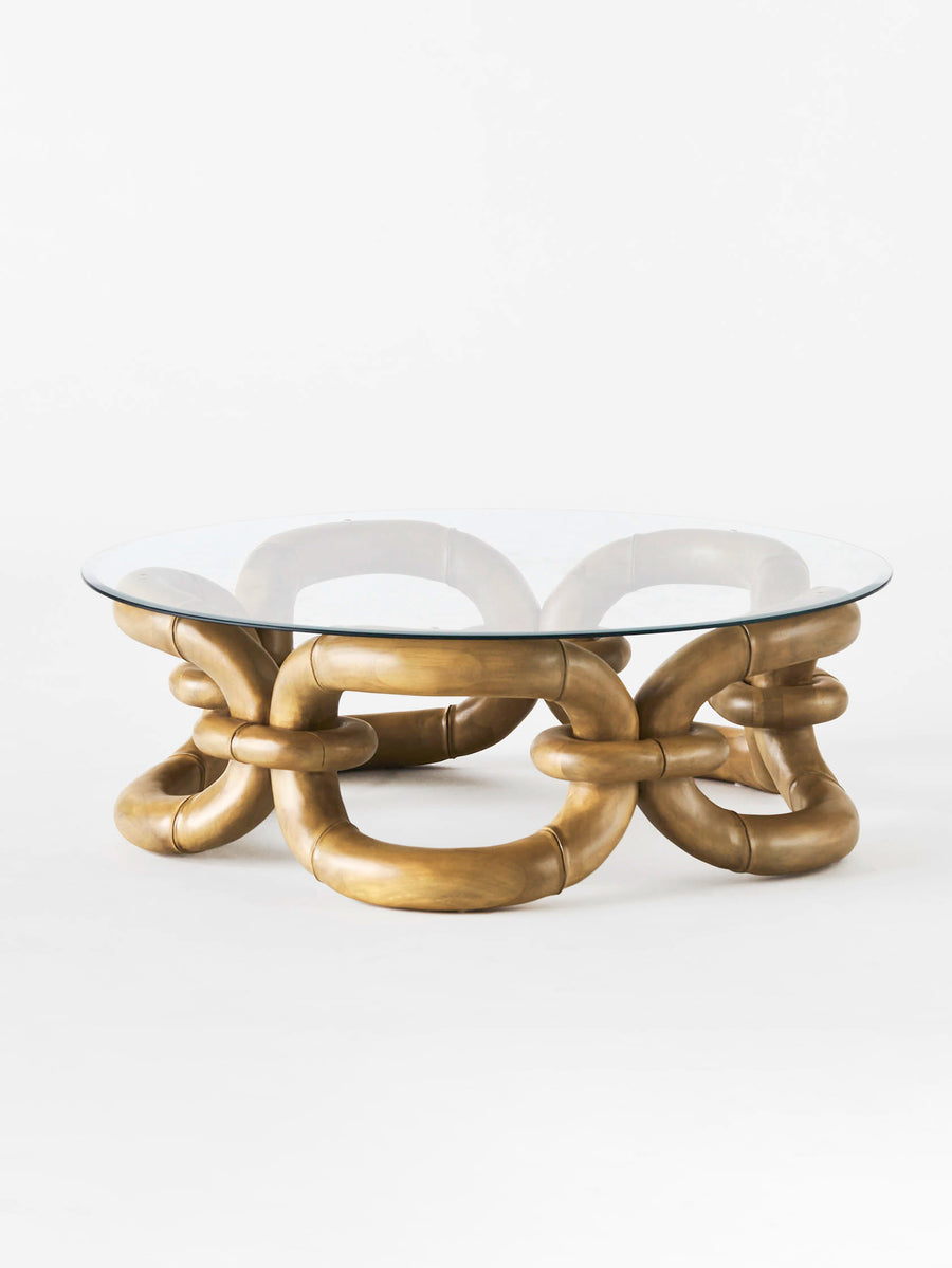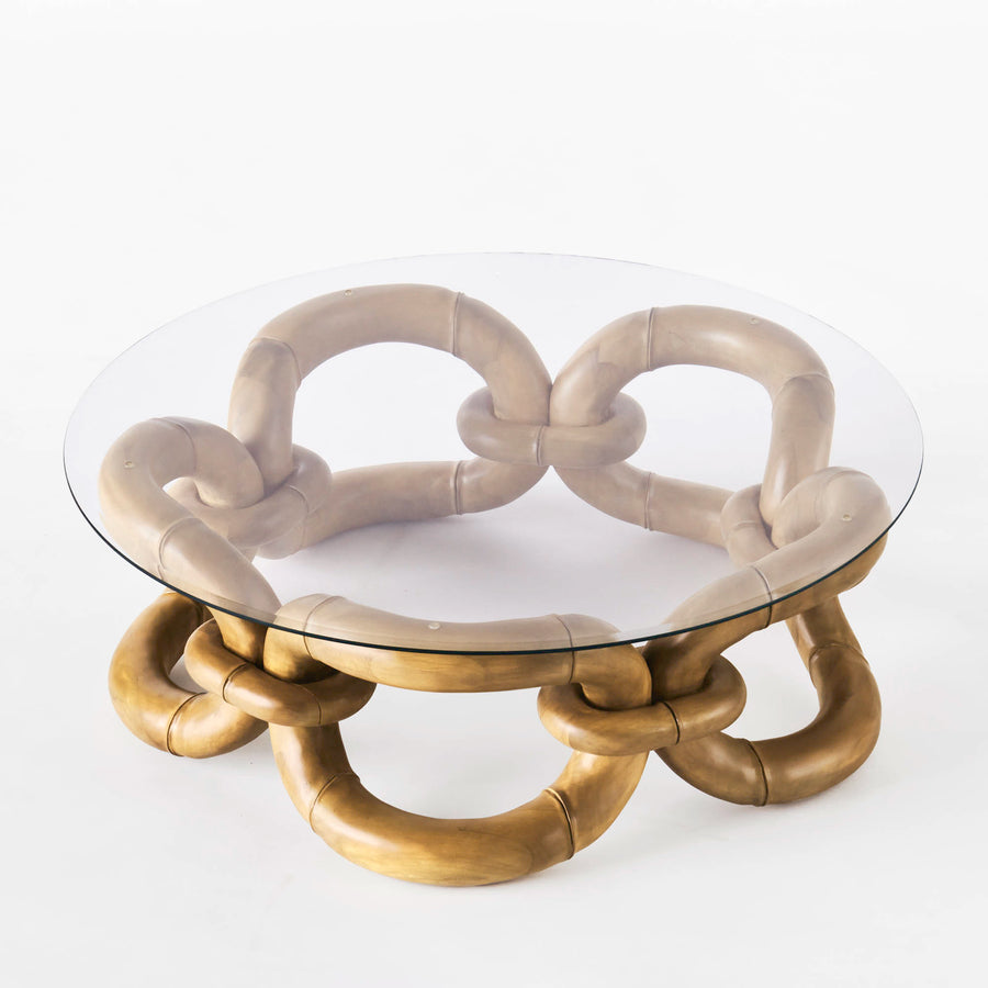 The Bamboo Bracelet Sofa Table features a hand carved wooden base reminiscent of a vintage gold bracelet discovered in a flea market. Made from cultivated Mahogany, this frame has been stained and hand painted, and paired with a tempered glass top.