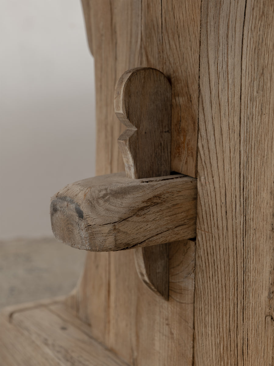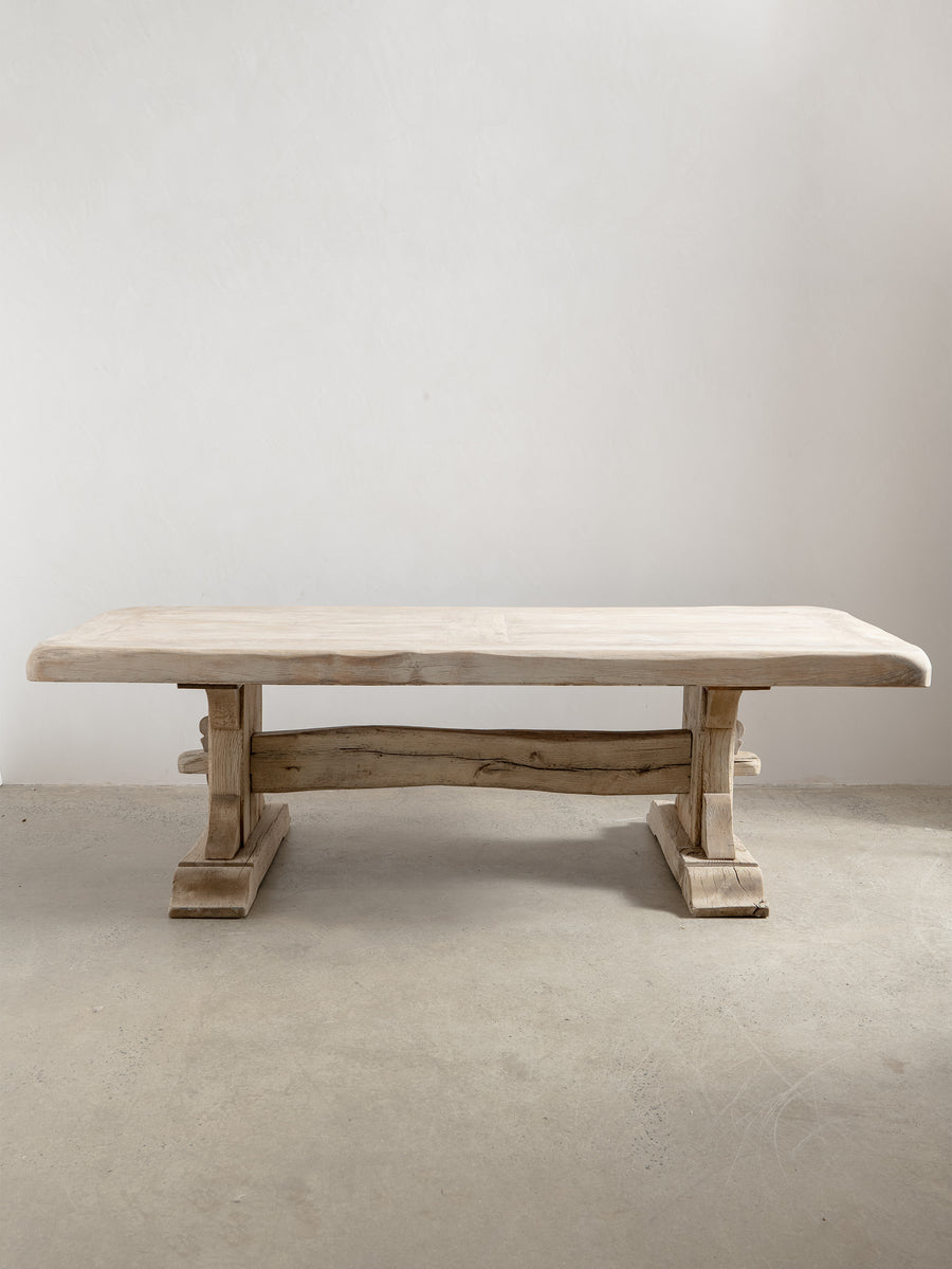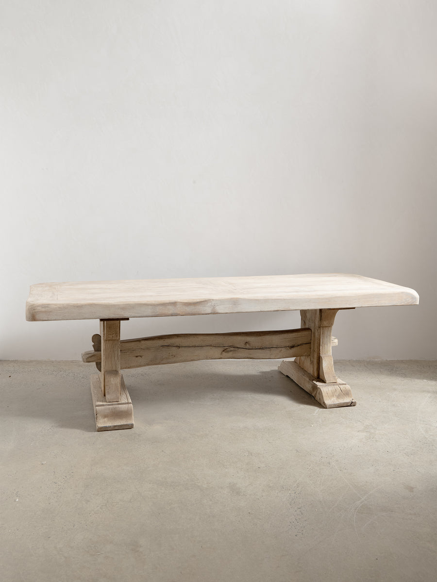 A large French oak farmhouse table with a super solid top, sturdy legs and cross beam support. Early 20th century in origin, it has been carefully stripped back to reveal the raw beauty of the timber, leaving a soft, tactile finish that highlights its natural grain and timeworn character. Both generous and grounding in scale, this piece carries the quiet strength of farmhouse craftsmanship while offering a timeless, versatile centrepiece for the dining space.