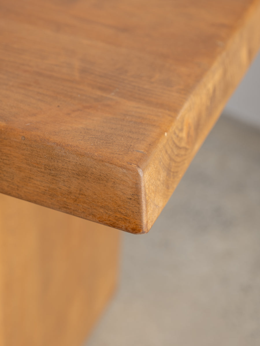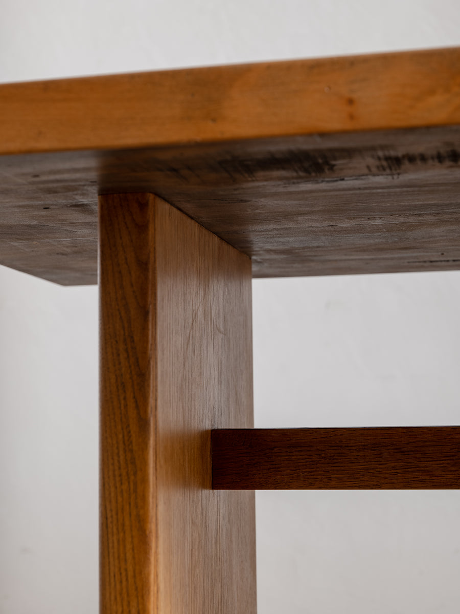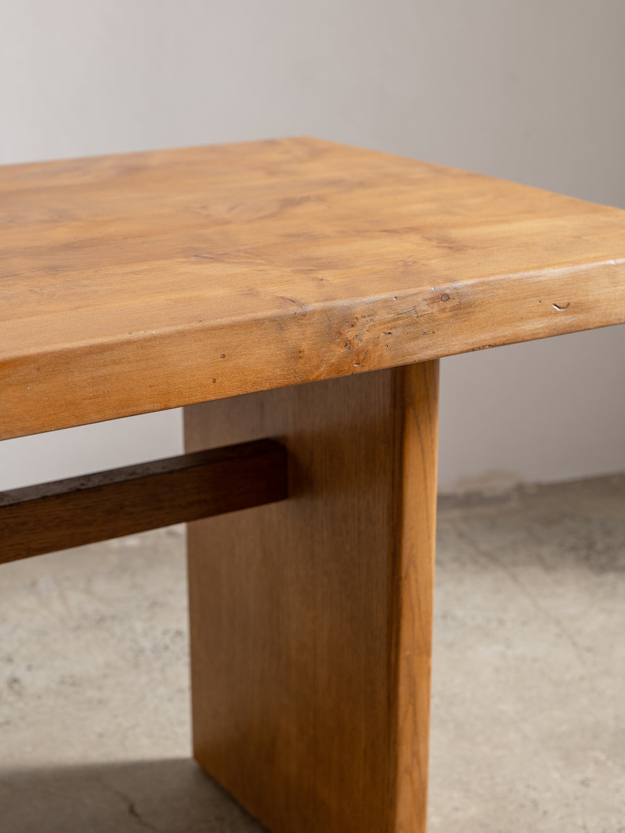 Rooted in the timeless craftsmanship of Pierre Chapo, this 1950s French oak dining table balances form and function with quiet confidence. Its solid rectangular top rests on two sculptural feet, joined by a thoughtfully spaced stretcher that adds both stability and lightness. The warmth of aged oak enhances its honest, architectural lines—an enduring piece that embodies the quiet strength of considered design.