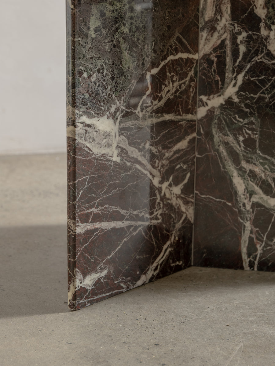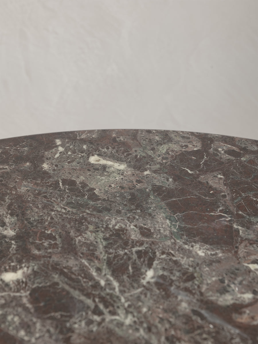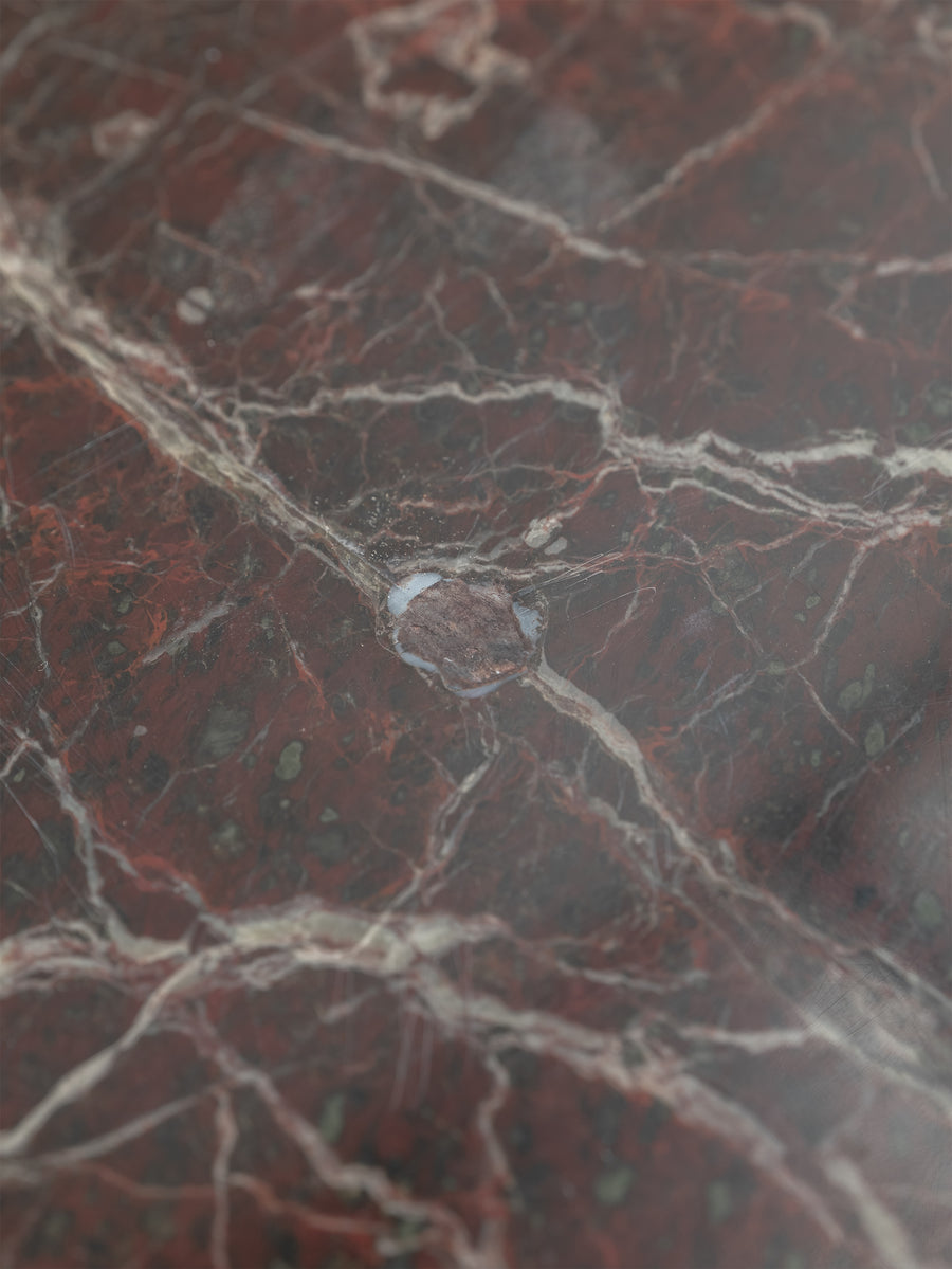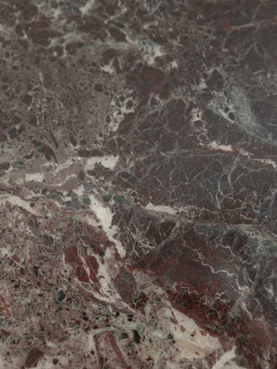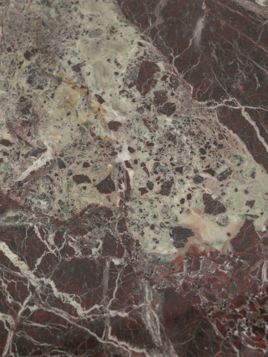 Defined by its rich Rosso Levanto marble, this round dining table showcases deep burgundy hues animated by veins of green, cherry-red, and fine white spidering. The polished surface offers clarity and depth into the stone’s grain, highlighting the drama of its natural composition. Sculptural yet refined, the piece captures the enduring elegance of Italian marble craftsmanship.