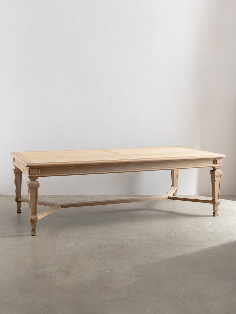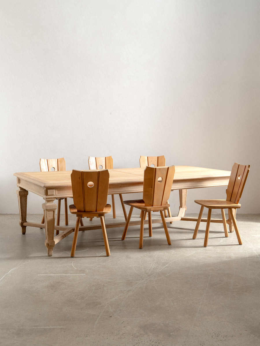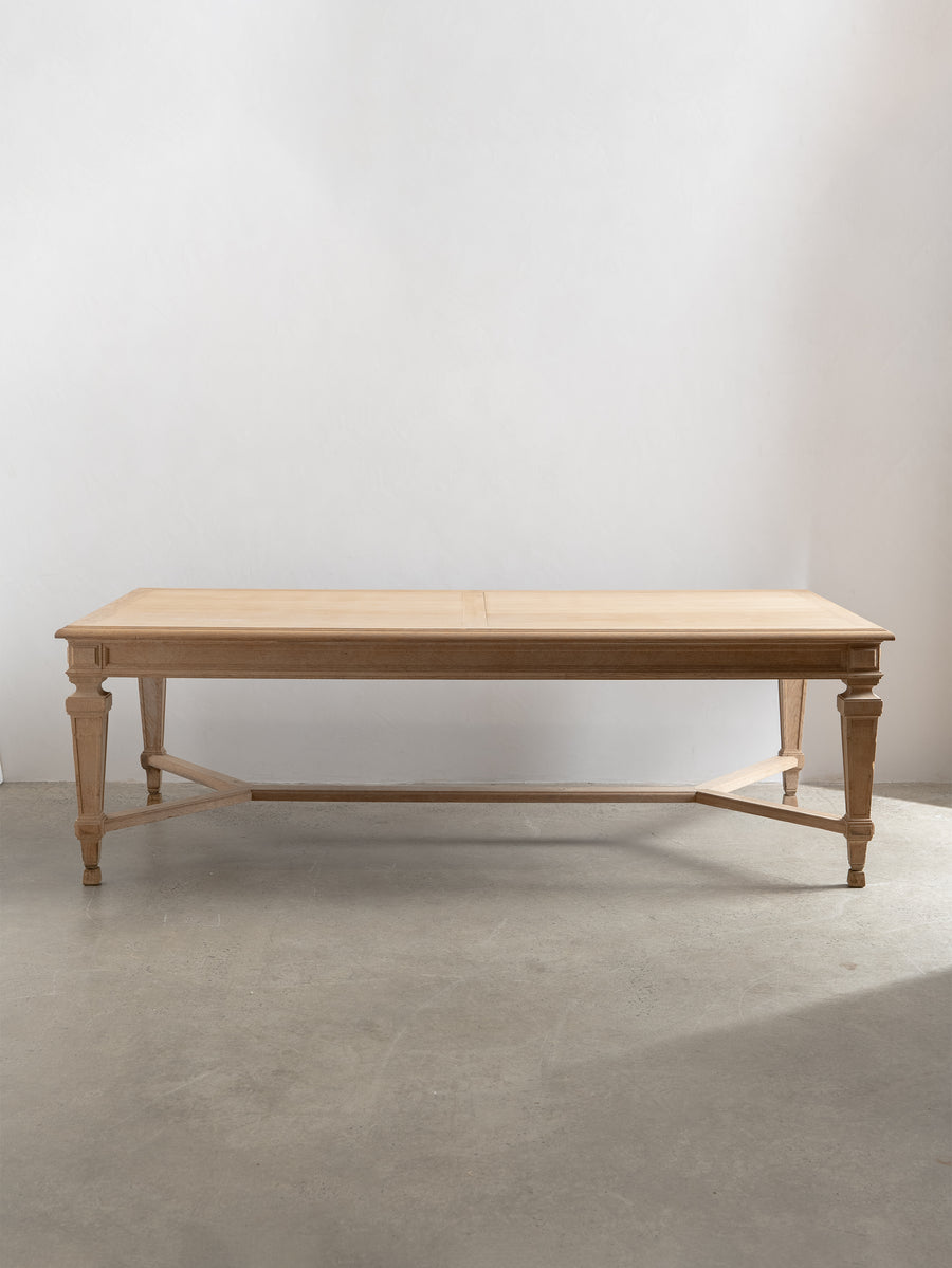 Originally crafted for the Banque de France, this stately oak dining table speaks to a legacy of utility and quiet grandeur. Its substantial top and faceted legs are carved from solid oak, showcasing the warmth and integrity of traditional French joinery. A water-repellent finish has been applied to protect the surface while preserving the timber’s natural texture and patina.