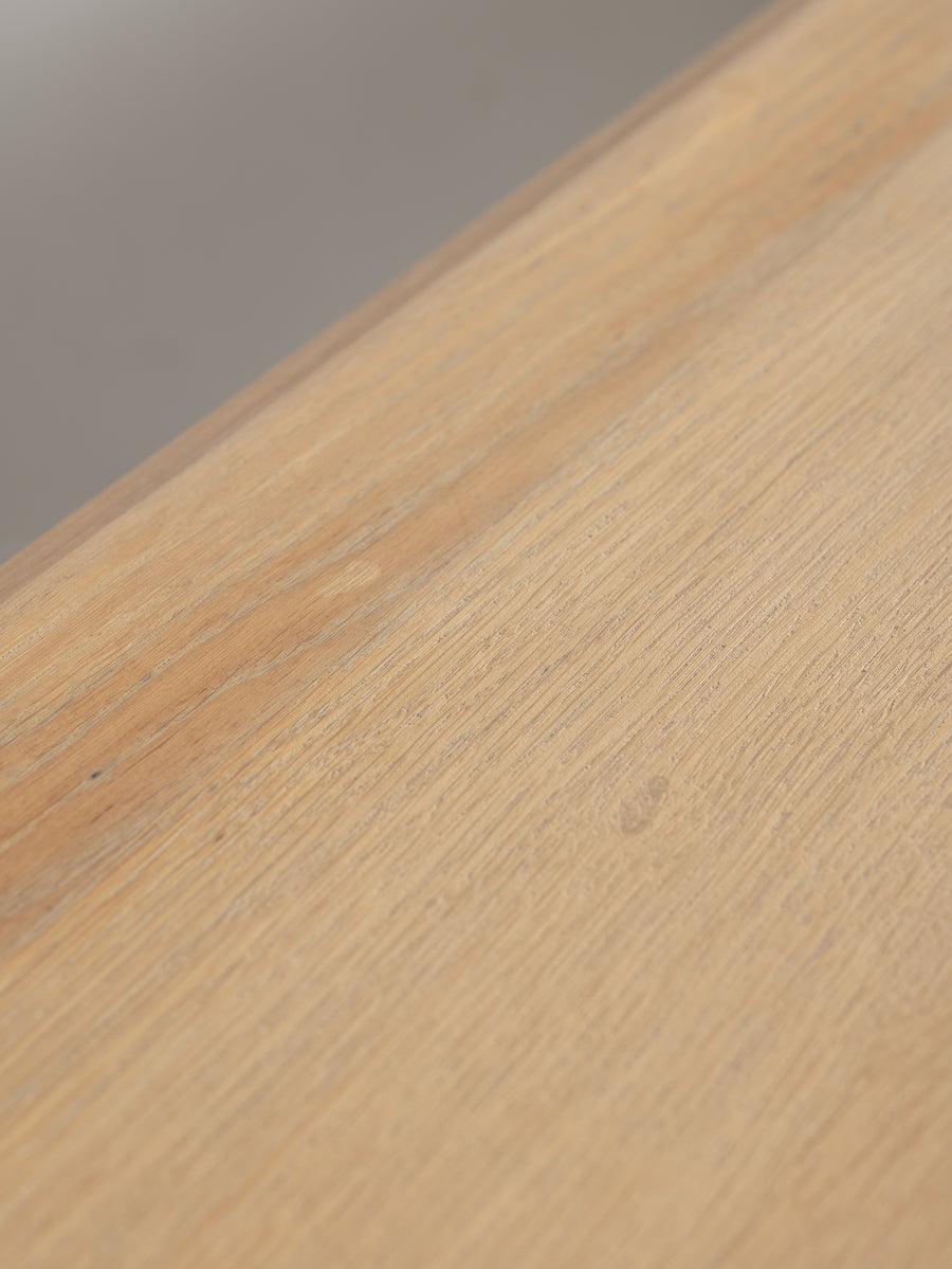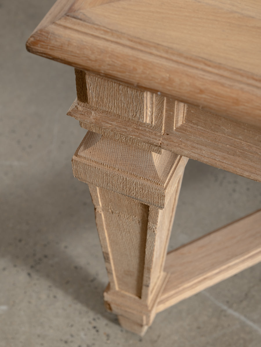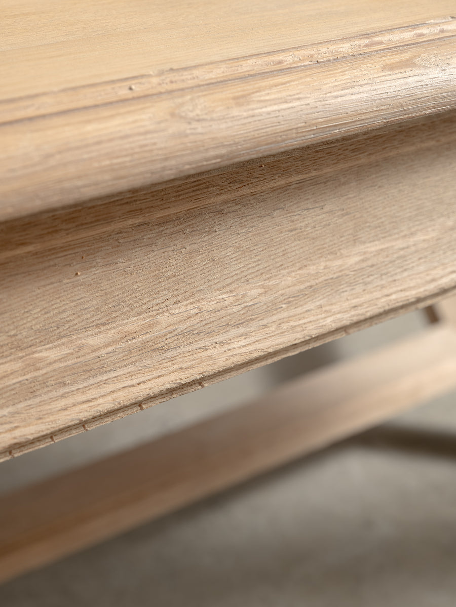 Originally crafted for the Banque de France, this stately oak dining table speaks to a legacy of utility and quiet grandeur. Its substantial top and faceted legs are carved from solid oak, showcasing the warmth and integrity of traditional French joinery. A water-repellent finish has been applied to protect the surface while preserving the timber’s natural texture and patina.