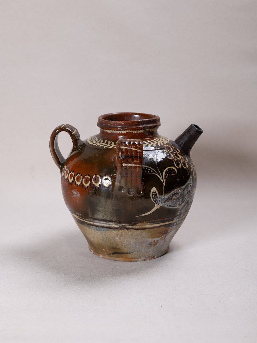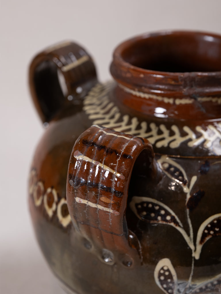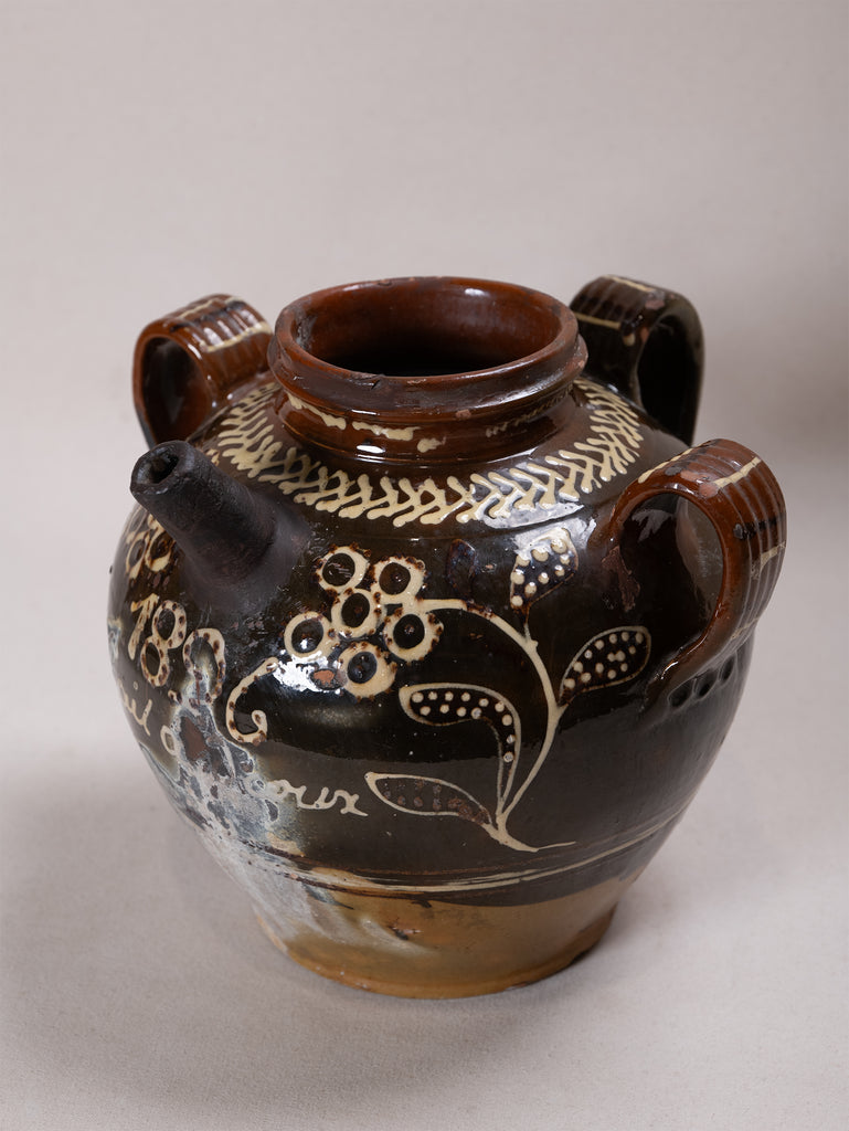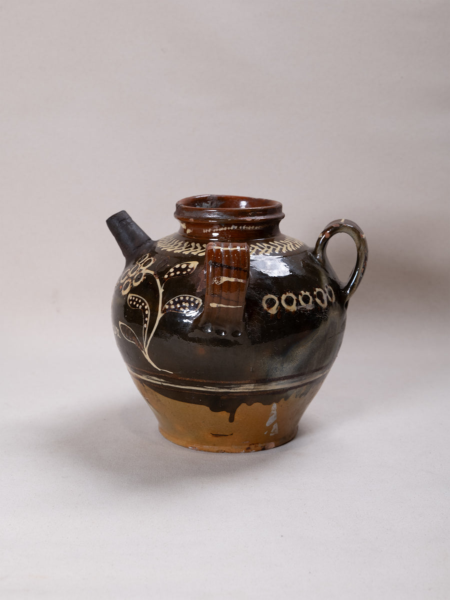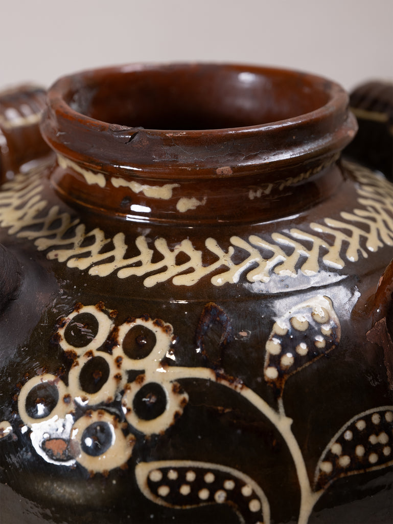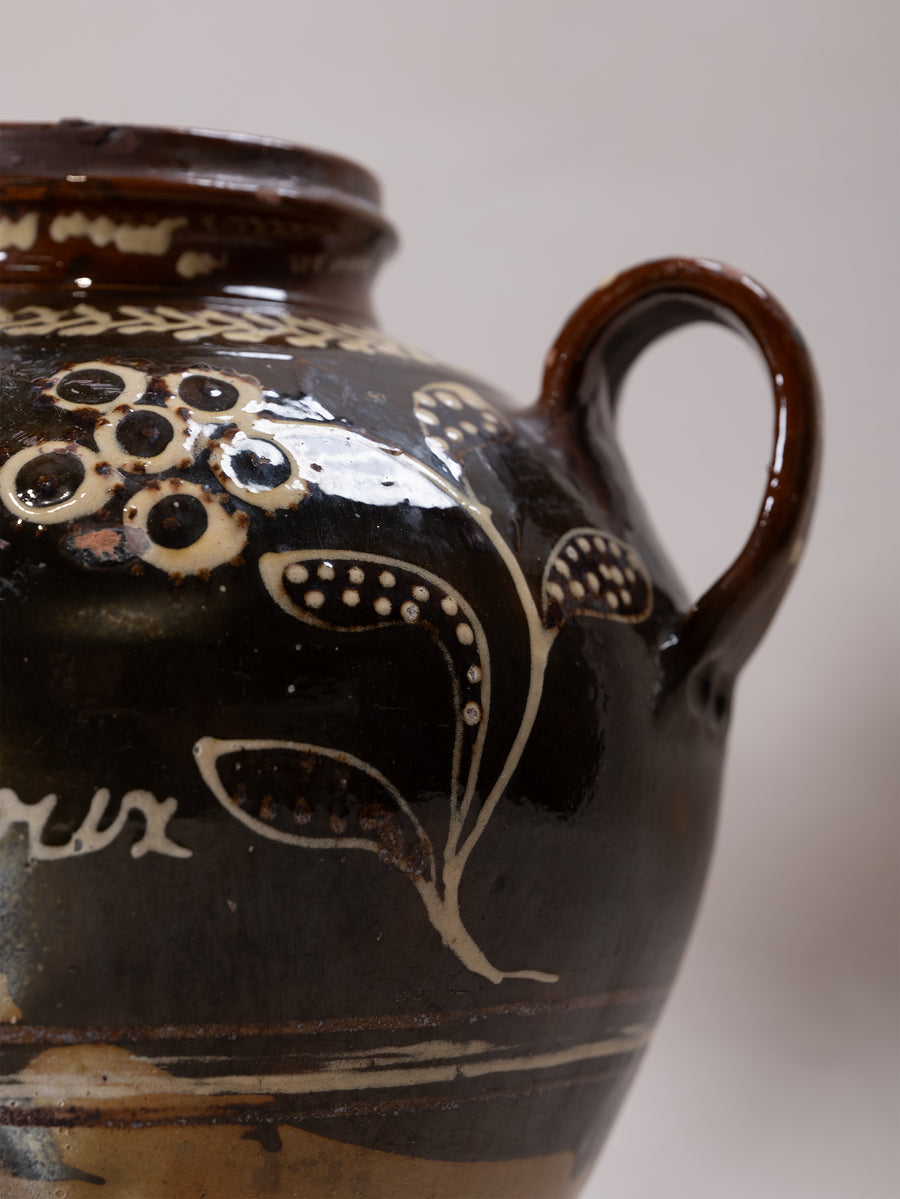 A beautiful example of 19th-century craftsmanship, this ceramic urn features intricate hand-painted floral and foliate motifs in earthy tones. Its expressive glaze, aged surface, and gentle patina reveal the passage of time, lending it a rustic authenticity and warmth. Both decorative and full of history, it brings an old-world charm to modern interiors.