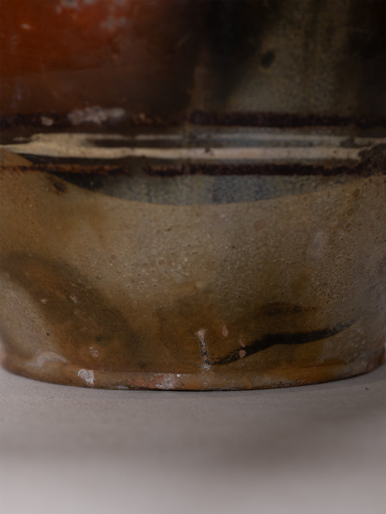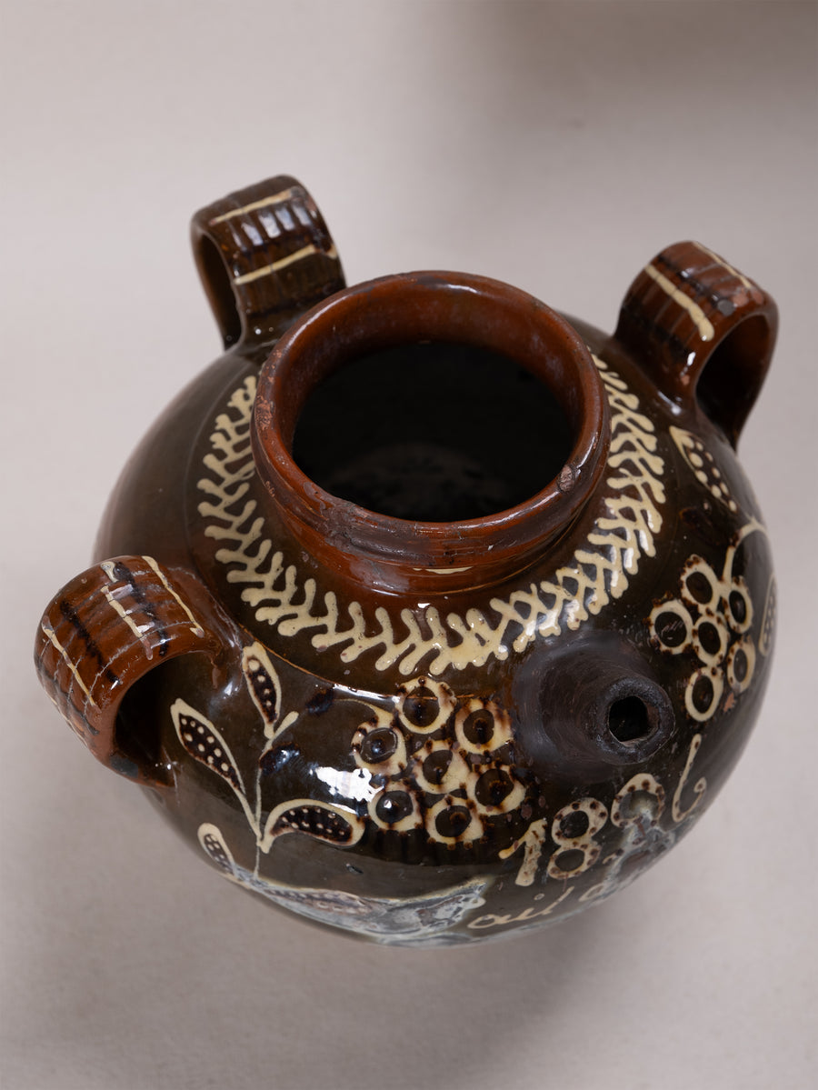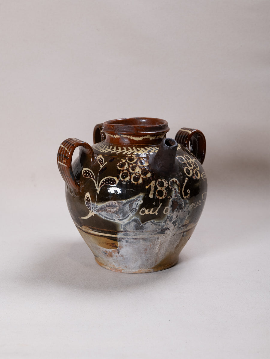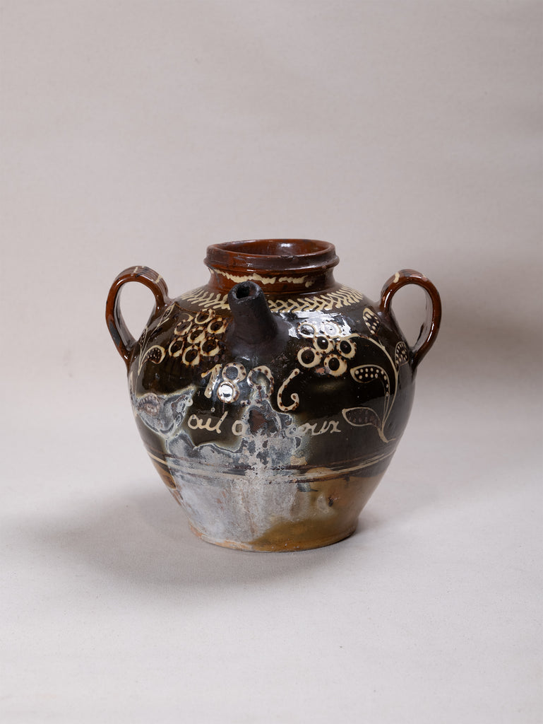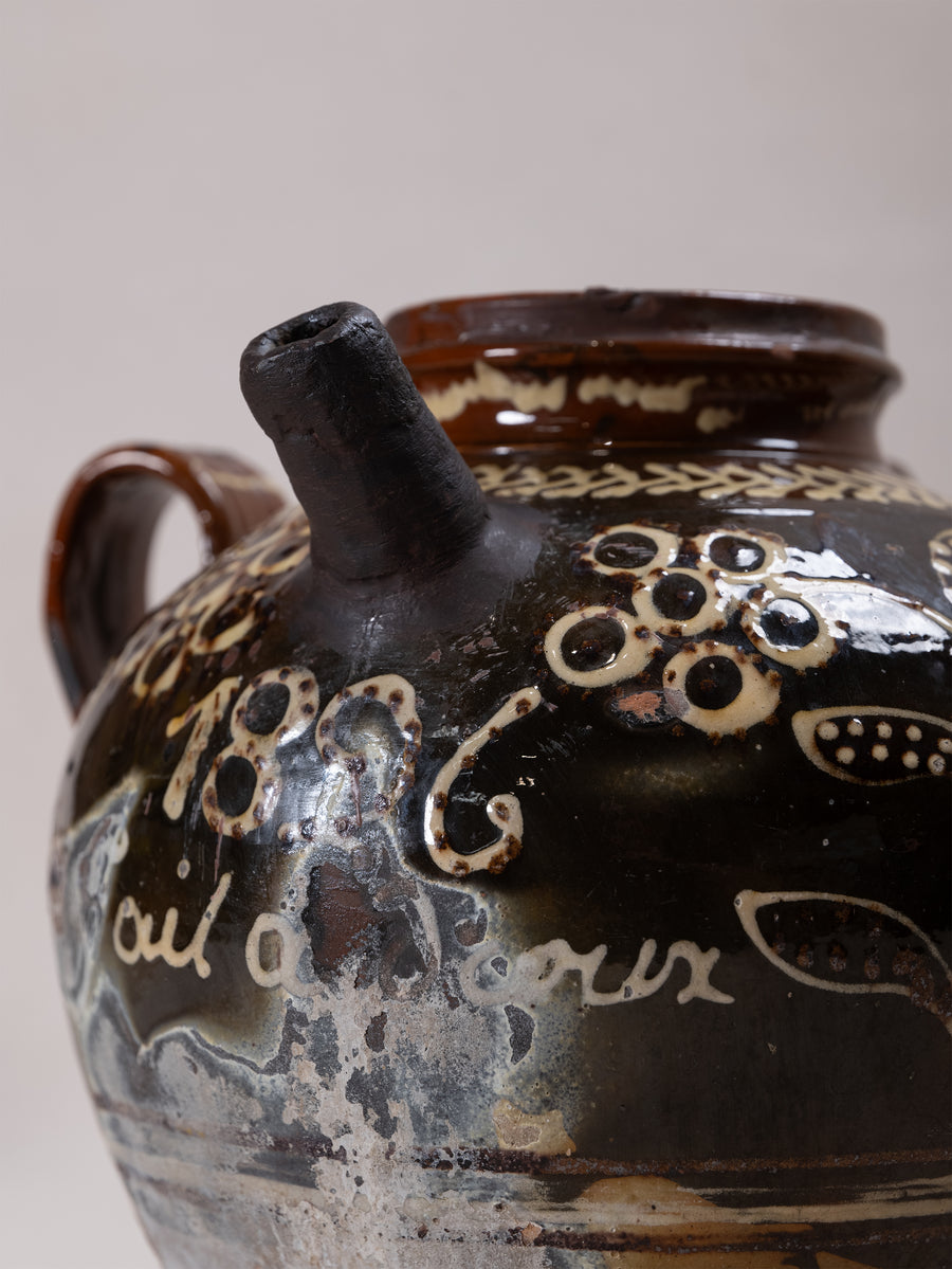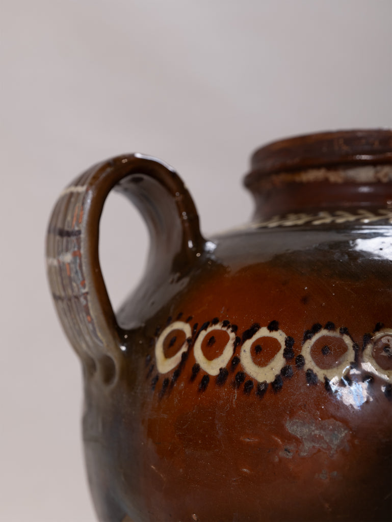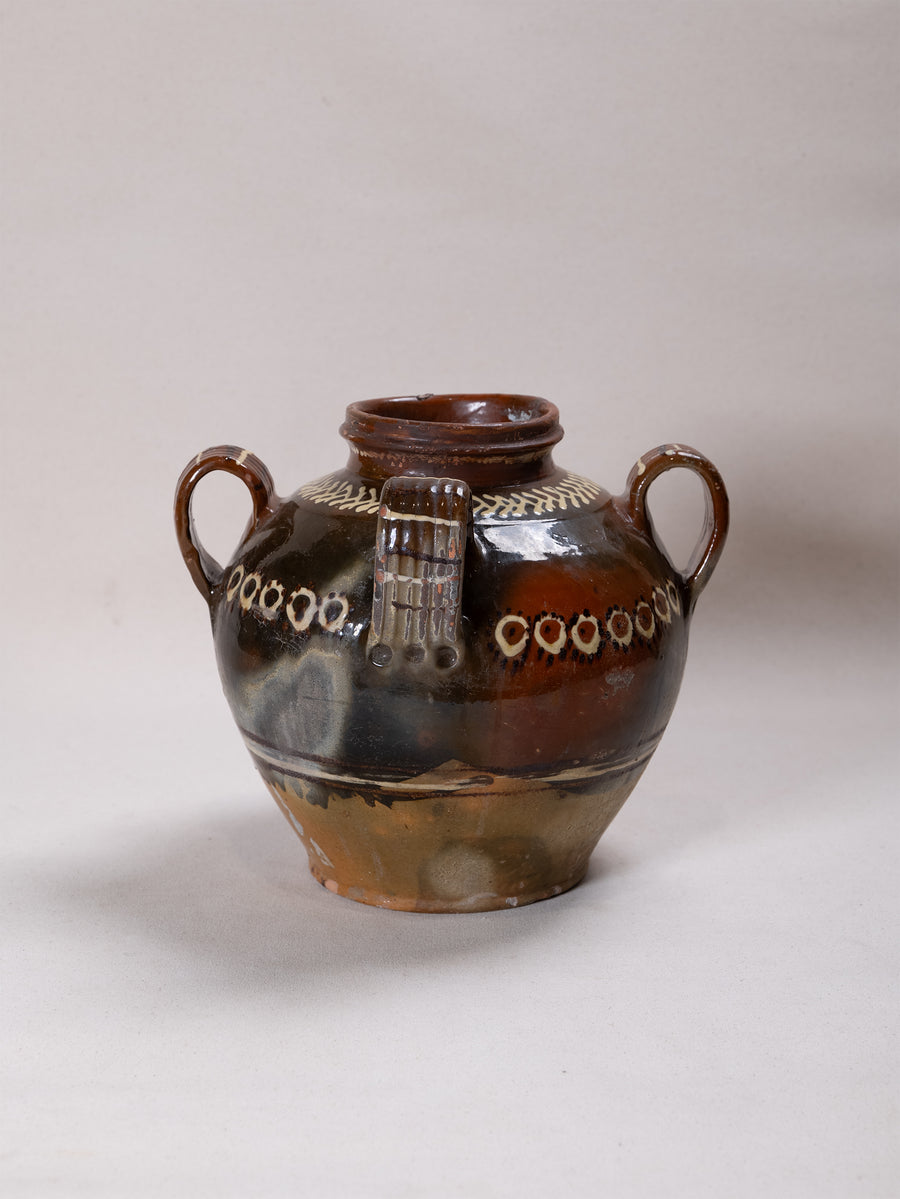 A beautiful example of 19th-century craftsmanship, this ceramic urn features intricate hand-painted floral and foliate motifs in earthy tones. Its expressive glaze, aged surface, and gentle patina reveal the passage of time, lending it a rustic authenticity and warmth. Both decorative and full of history, it brings an old-world charm to modern interiors.