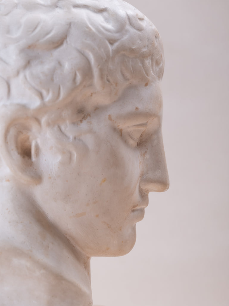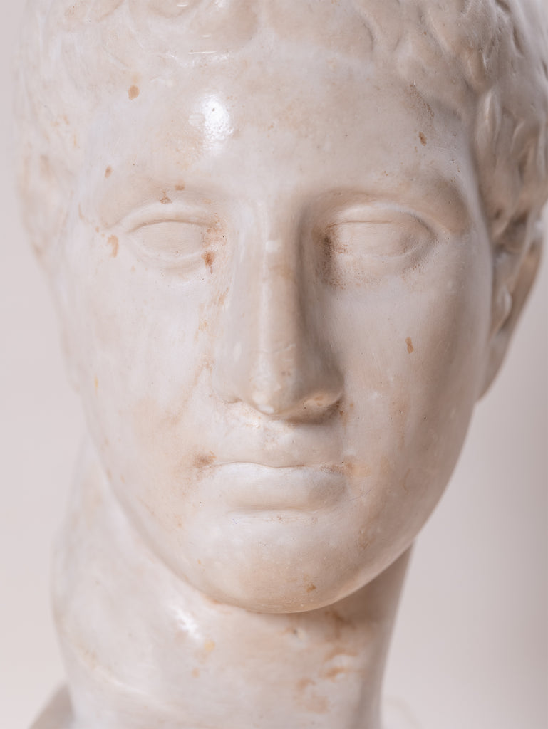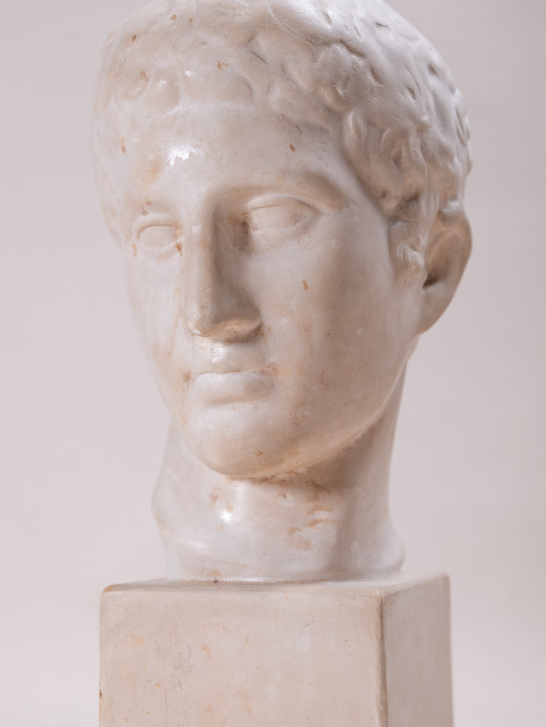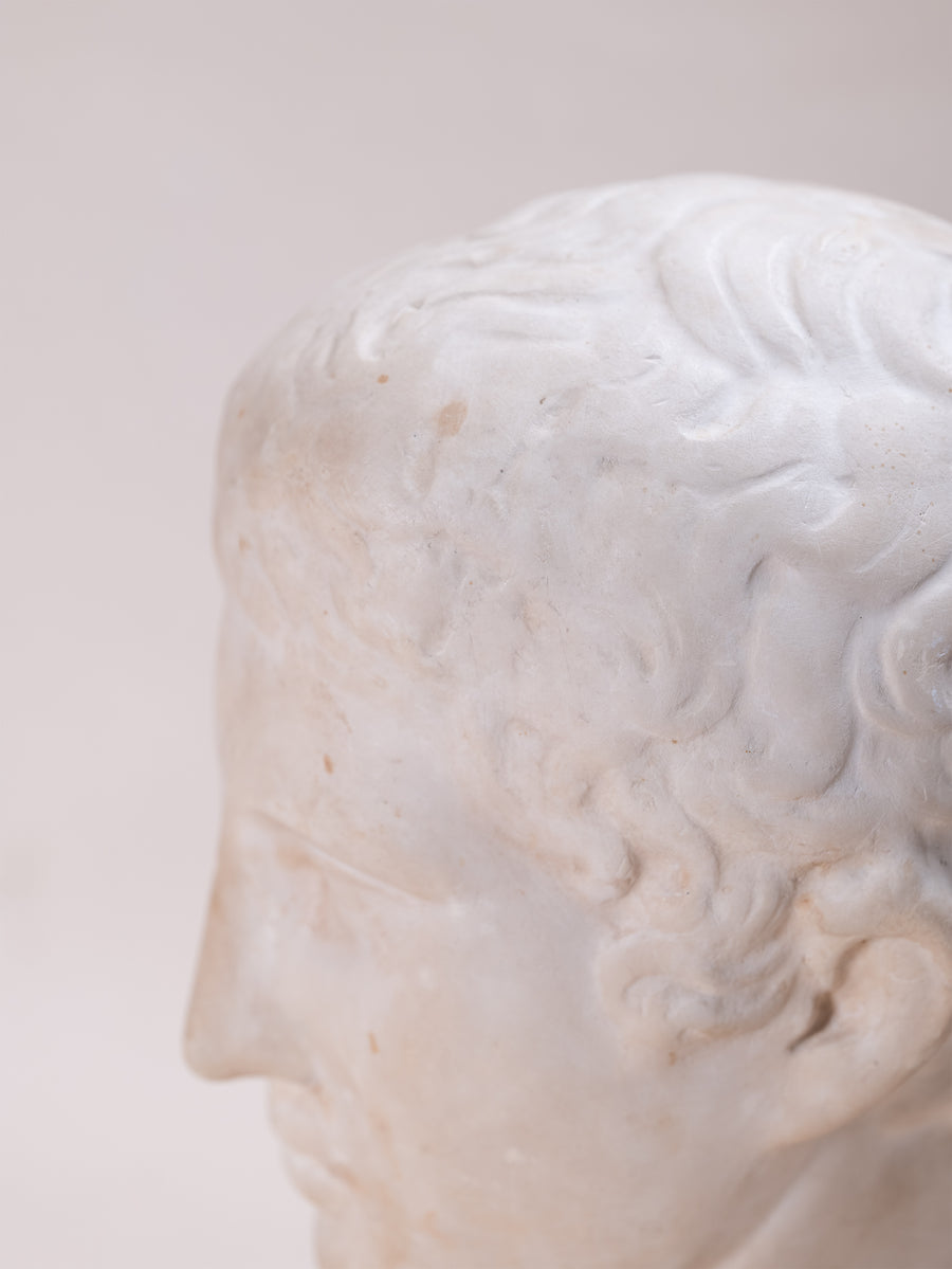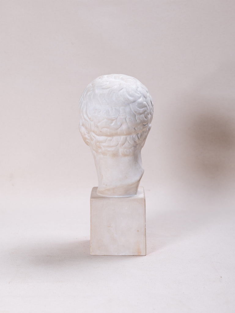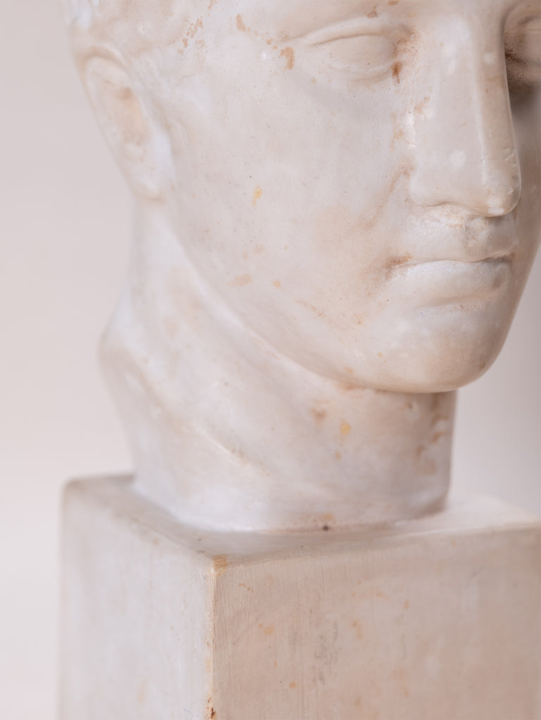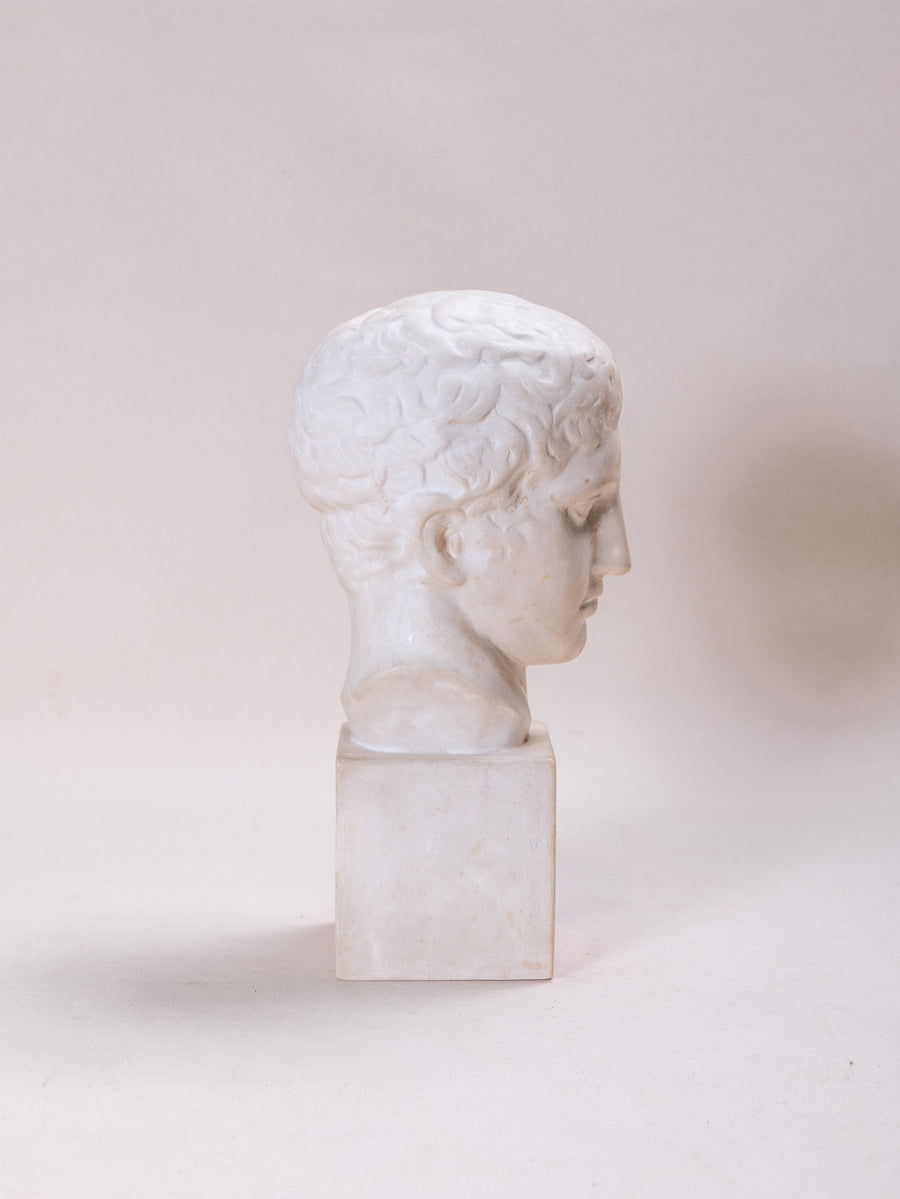 This 1950s plaster bust draws inspiration from classical sculpture, with finely modelled features and a simple block base. Its softly aged surface lends character and authenticity, making it a striking decorative accent for display on a console, pedestal, or shelf. Timeless in form and understated in presence, it brings a touch of history and refinement to any interior.