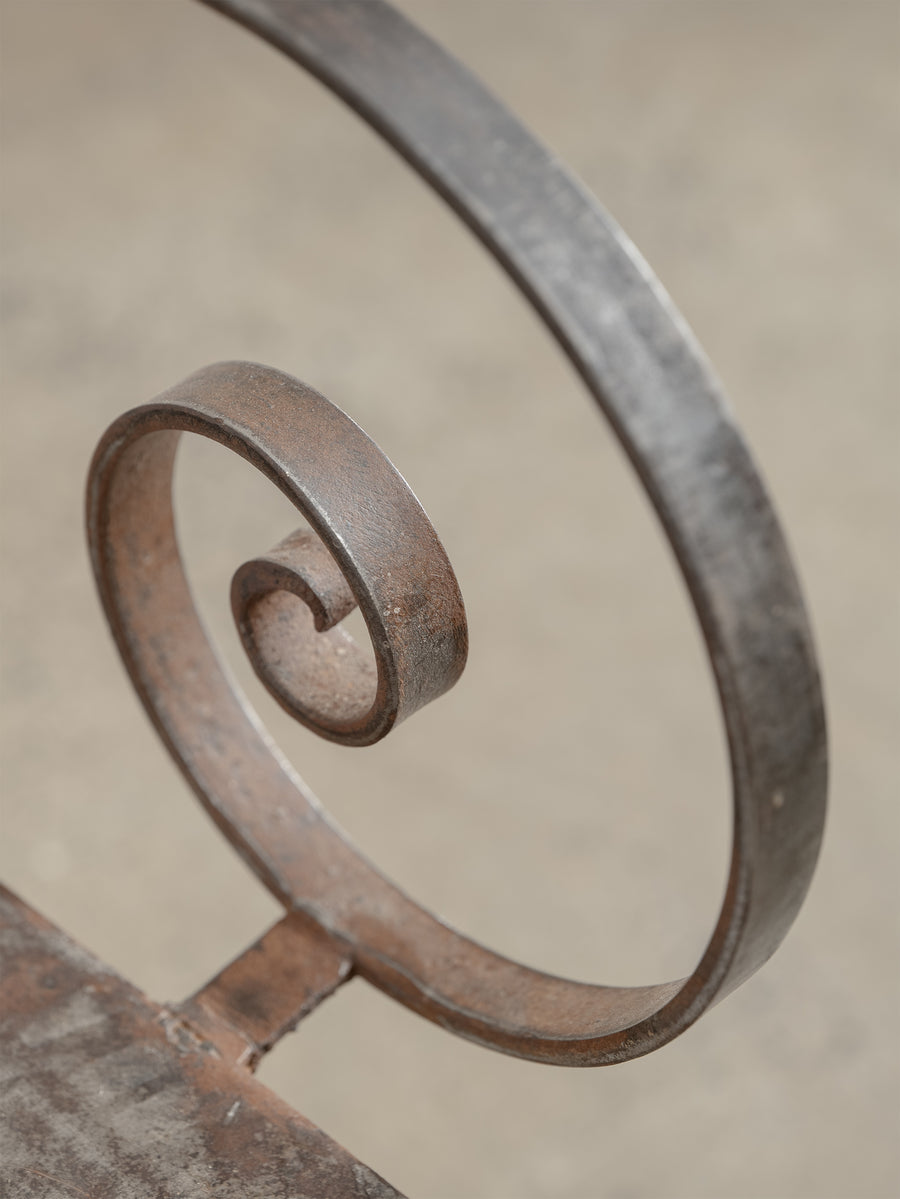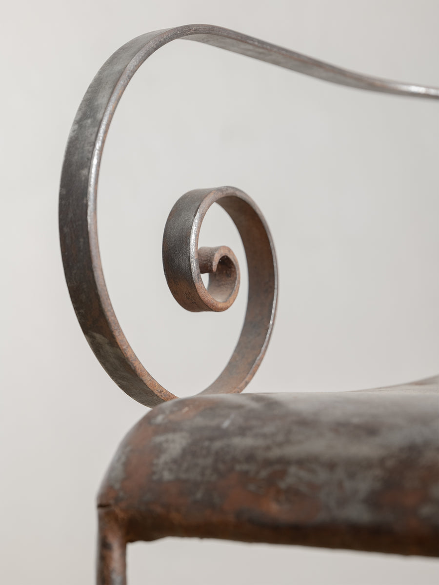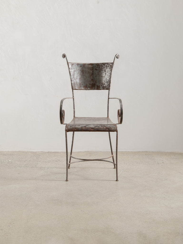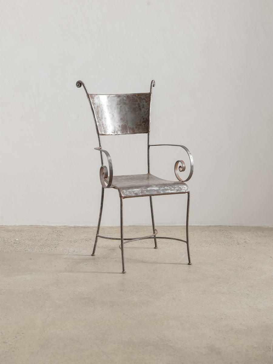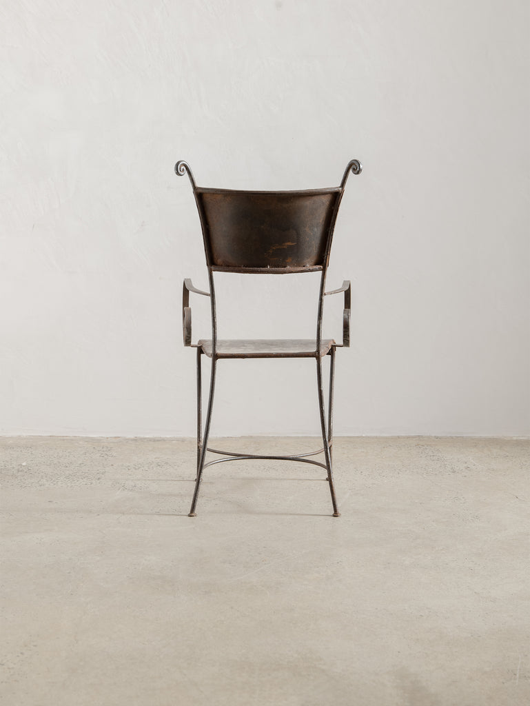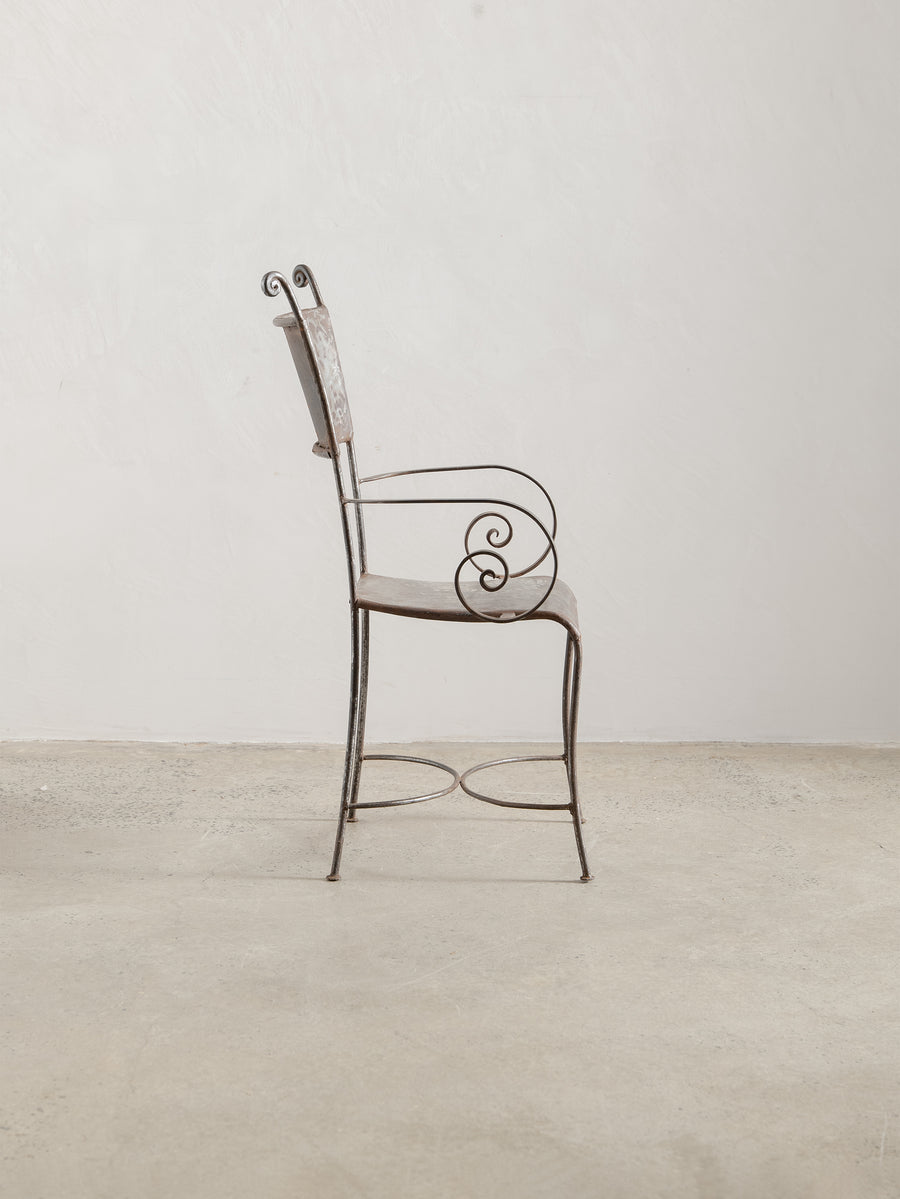 A striking example of French mid-century craftsmanship, this artisanal armchair is hand-forged from metal, dating back to the 1950s. Its sculptural form balances strength with elegance, featuring gracefully scrolled arms and a gently flared backrest. With a raw, time-worn patina that speaks to its age and history, this chair embodies both function and artistry, making it as much a statement piece as a seat. A rare find, it offers a glimpse into the refined simplicity of French design of the era.