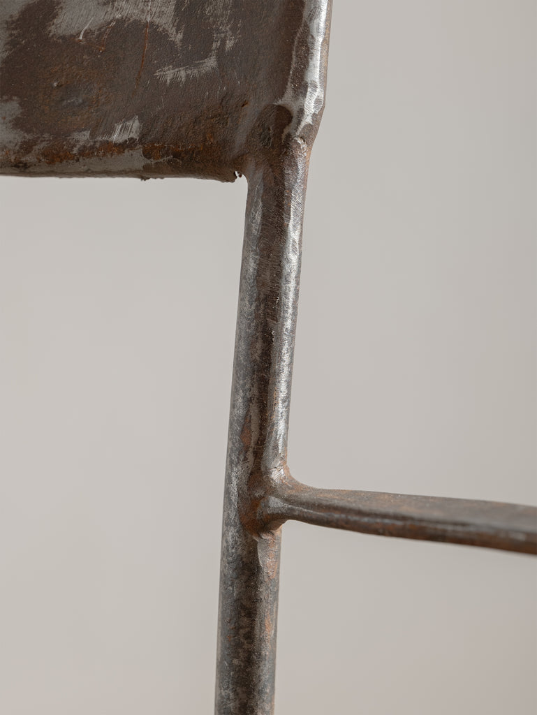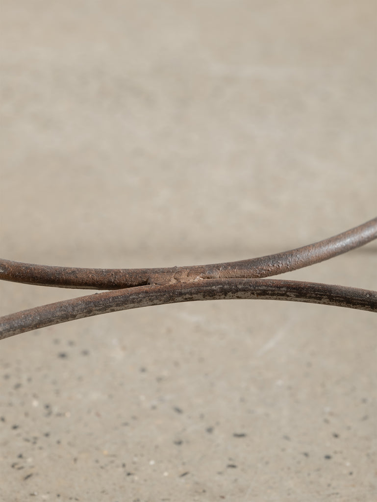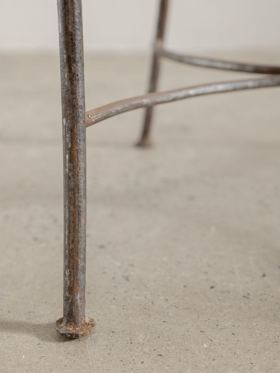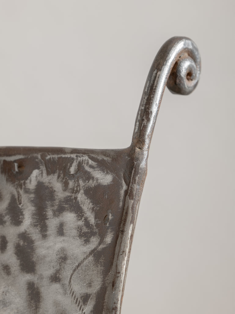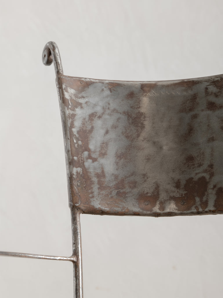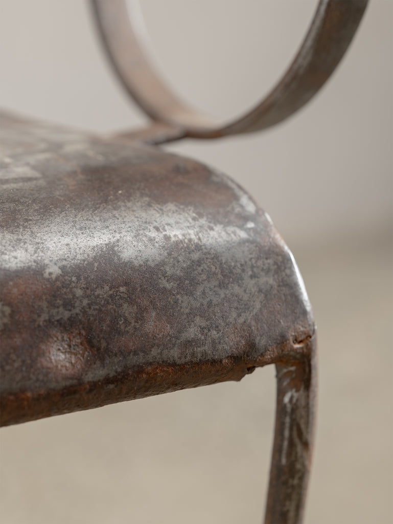 A striking example of French mid-century craftsmanship, this artisanal armchair is hand-forged from metal, dating back to the 1950s. Its sculptural form balances strength with elegance, featuring gracefully scrolled arms and a gently flared backrest. With a raw, time-worn patina that speaks to its age and history, this chair embodies both function and artistry, making it as much a statement piece as a seat. A rare find, it offers a glimpse into the refined simplicity of French design of the era.