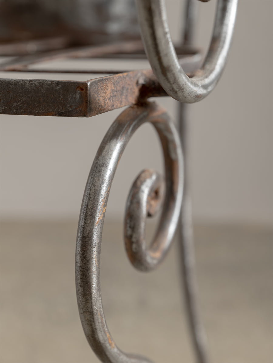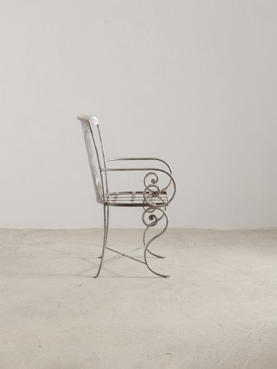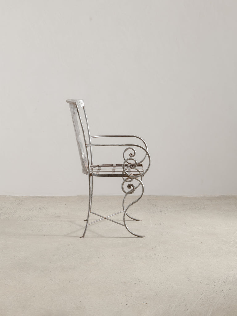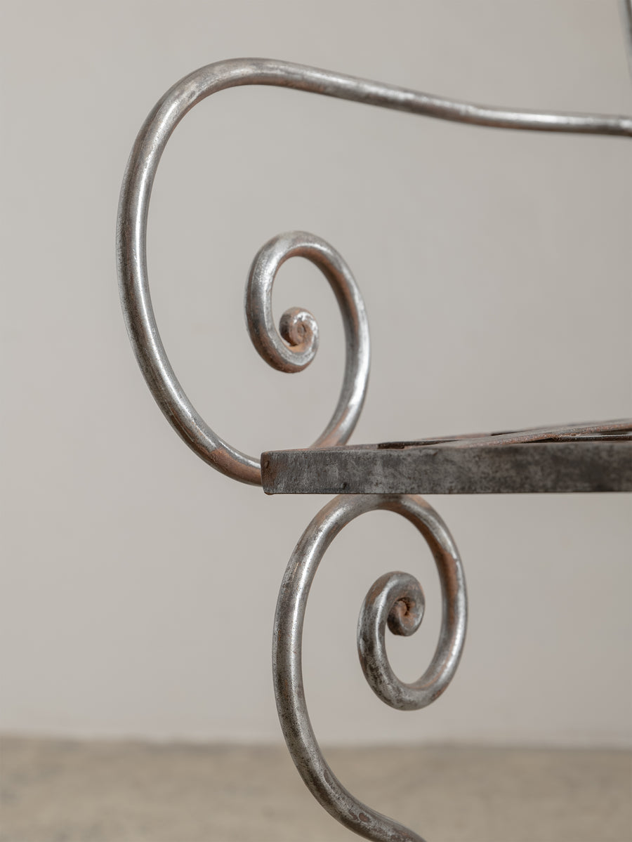 A striking example of French mid-century craftsmanship, this artisanal armchair is hand-forged from metal, dating back to the 1950s. Its sculptural form balances strength with elegance, featuring gracefully scrolled arms and a gently flared backrest. With a raw, time-worn patina that speaks to its age and history, this chair embodies both function and artistry, making it as much a statement piece as a seat. A rare find, it offers a glimpse into the refined simplicity of French design of the era.