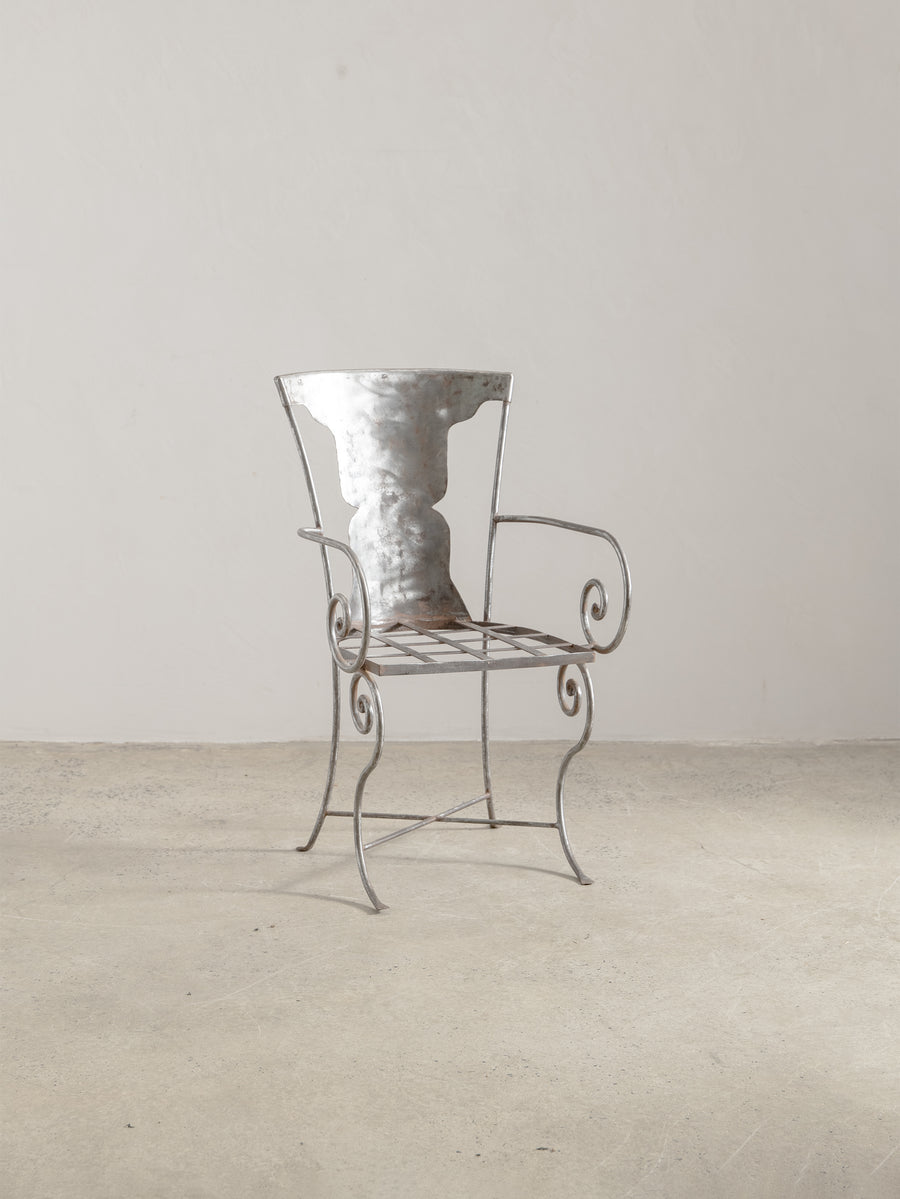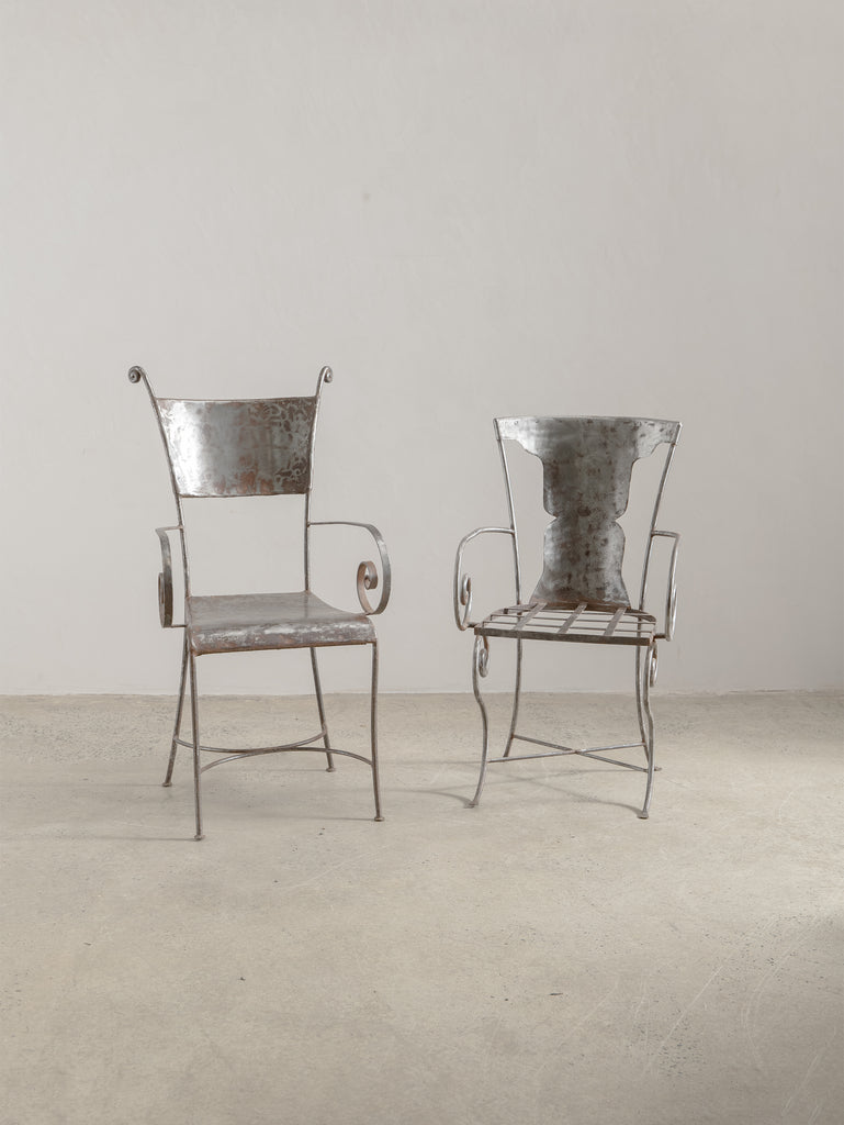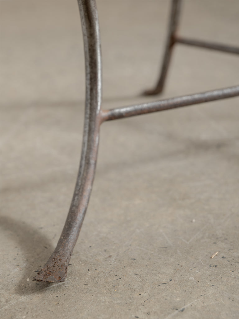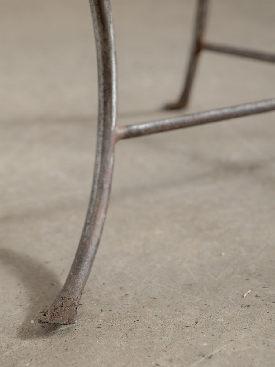 A striking example of French mid-century craftsmanship, this artisanal armchair is hand-forged from metal, dating back to the 1950s. Its sculptural form balances strength with elegance, featuring gracefully scrolled arms and a gently flared backrest. With a raw, time-worn patina that speaks to its age and history, this chair embodies both function and artistry, making it as much a statement piece as a seat. A rare find, it offers a glimpse into the refined simplicity of French design of the era.