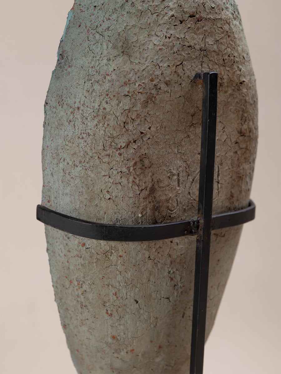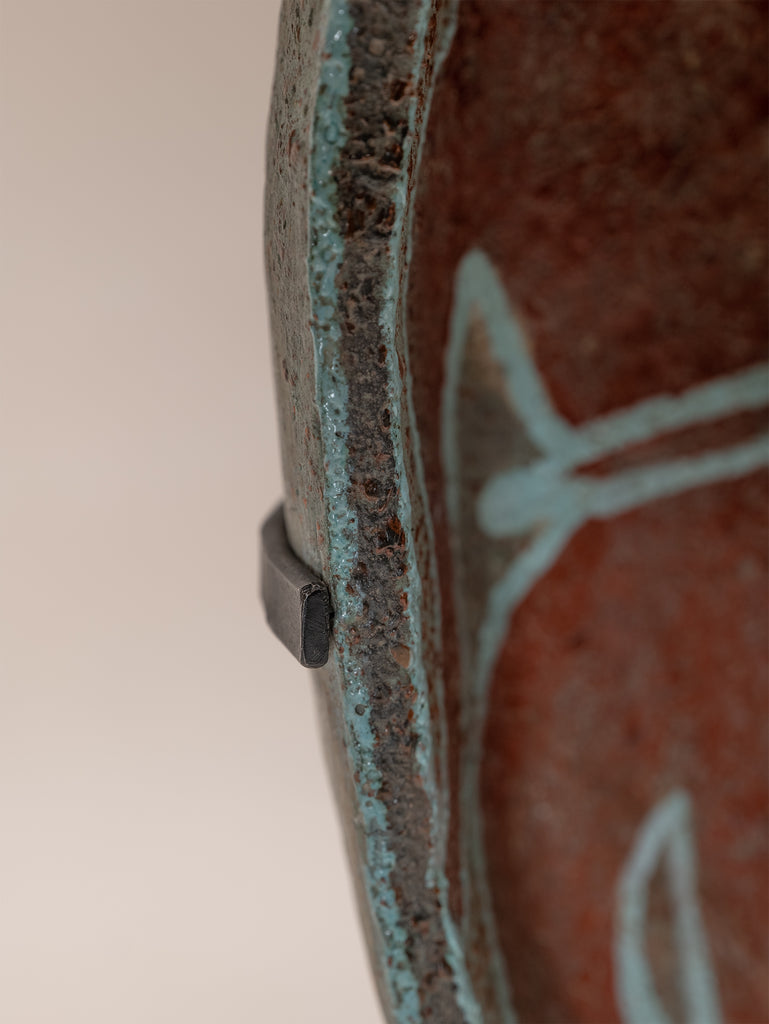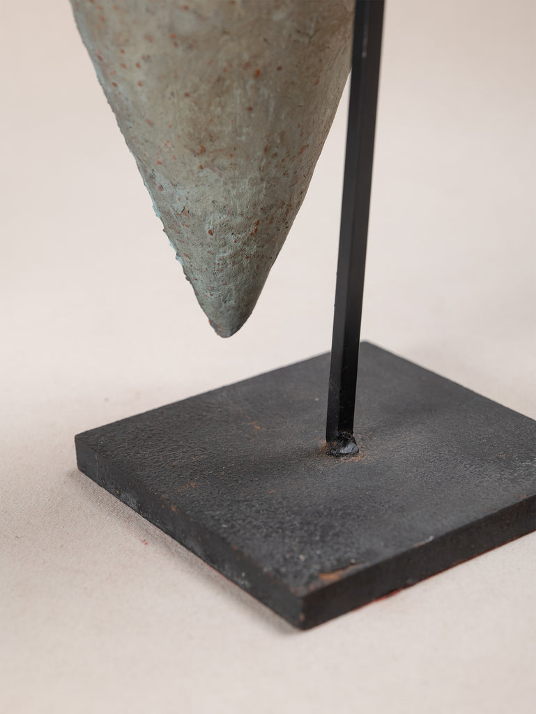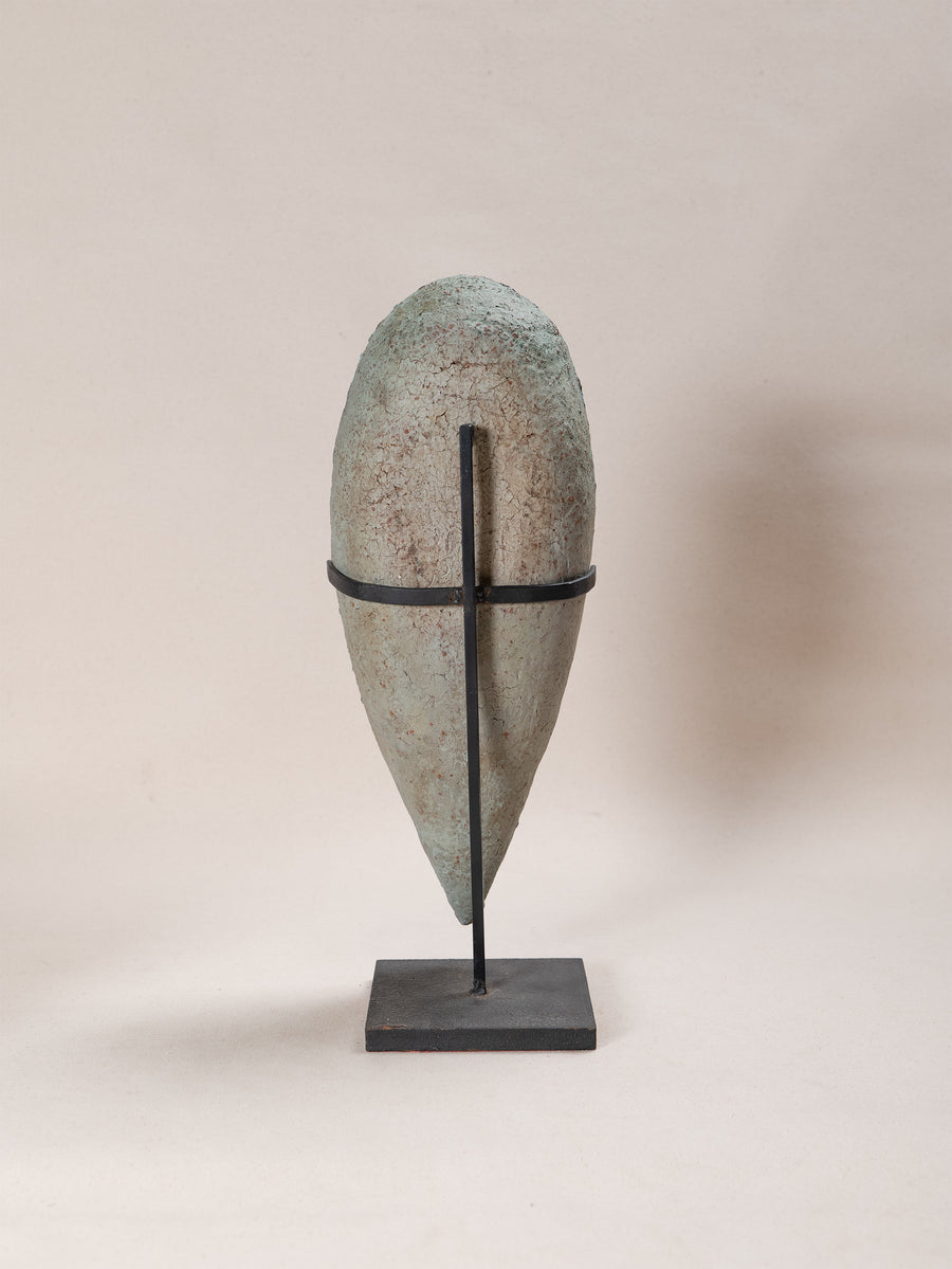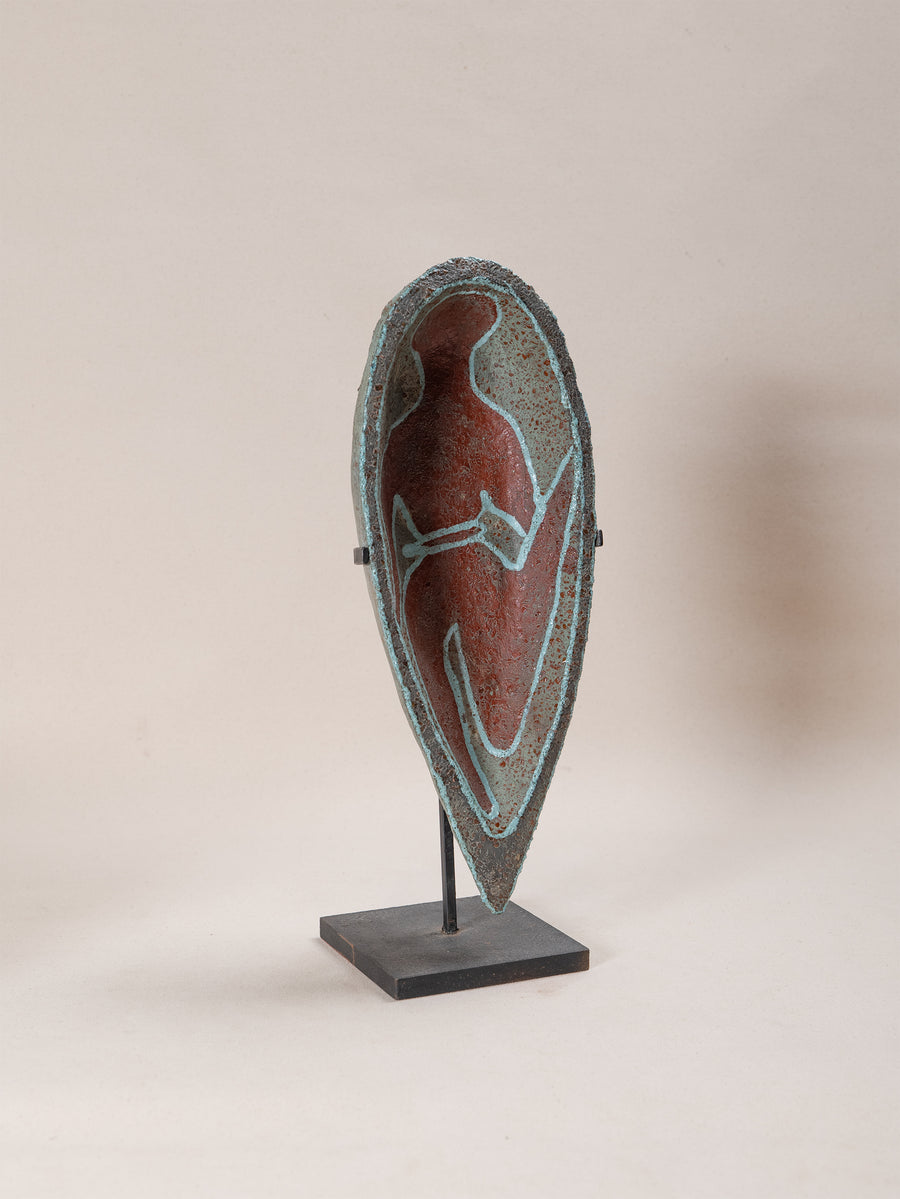 Evoking the spirit of primitive art and mid-century abstraction, this ceramic sculpture captures a powerful sense of presence. Handcrafted in textured clay and finished in earthy red and turquoise tones, its stylised figure is both ancient and modern - bridging artefact and artwork. The elongated teardrop form, mounted on a black base, reveals a tactile surface that celebrates imperfection and material honesty. A striking piece that reflects the organic minimalism of 1960s studio ceramics.