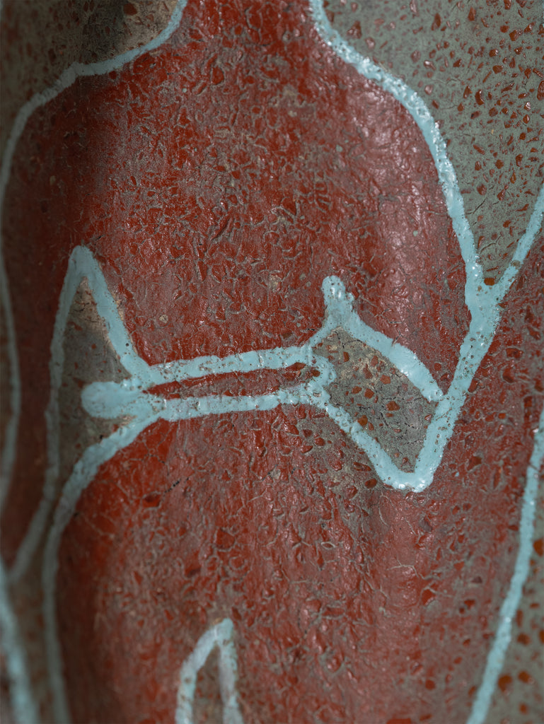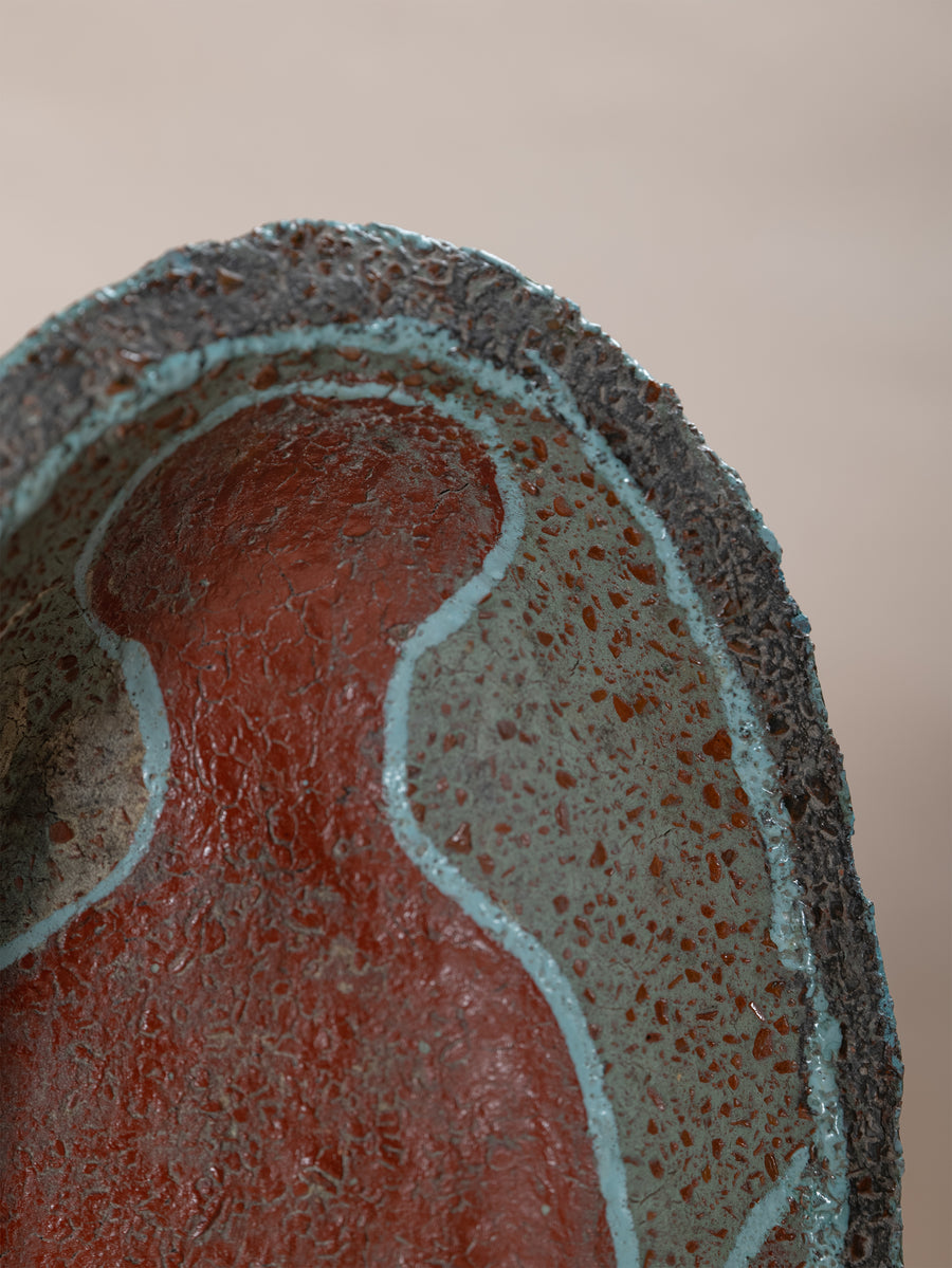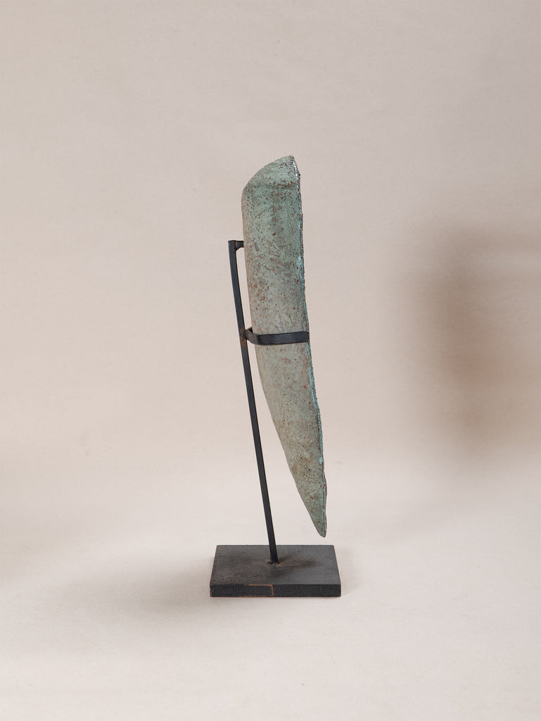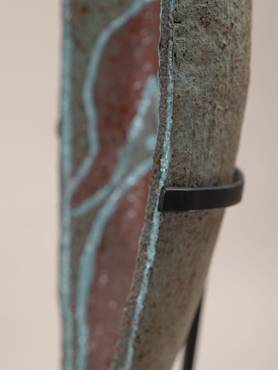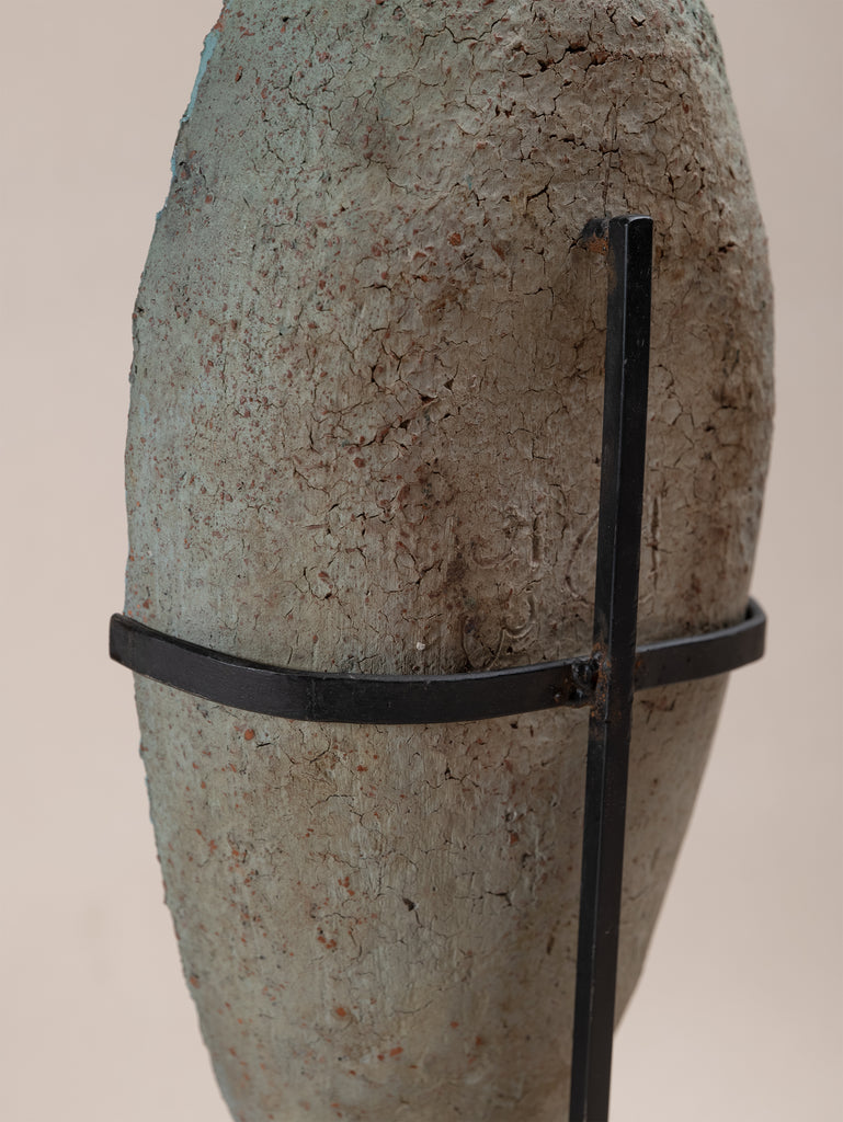 Evoking the spirit of primitive art and mid-century abstraction, this ceramic sculpture captures a powerful sense of presence. Handcrafted in textured clay and finished in earthy red and turquoise tones, its stylised figure is both ancient and modern - bridging artefact and artwork. The elongated teardrop form, mounted on a black base, reveals a tactile surface that celebrates imperfection and material honesty. A striking piece that reflects the organic minimalism of 1960s studio ceramics.