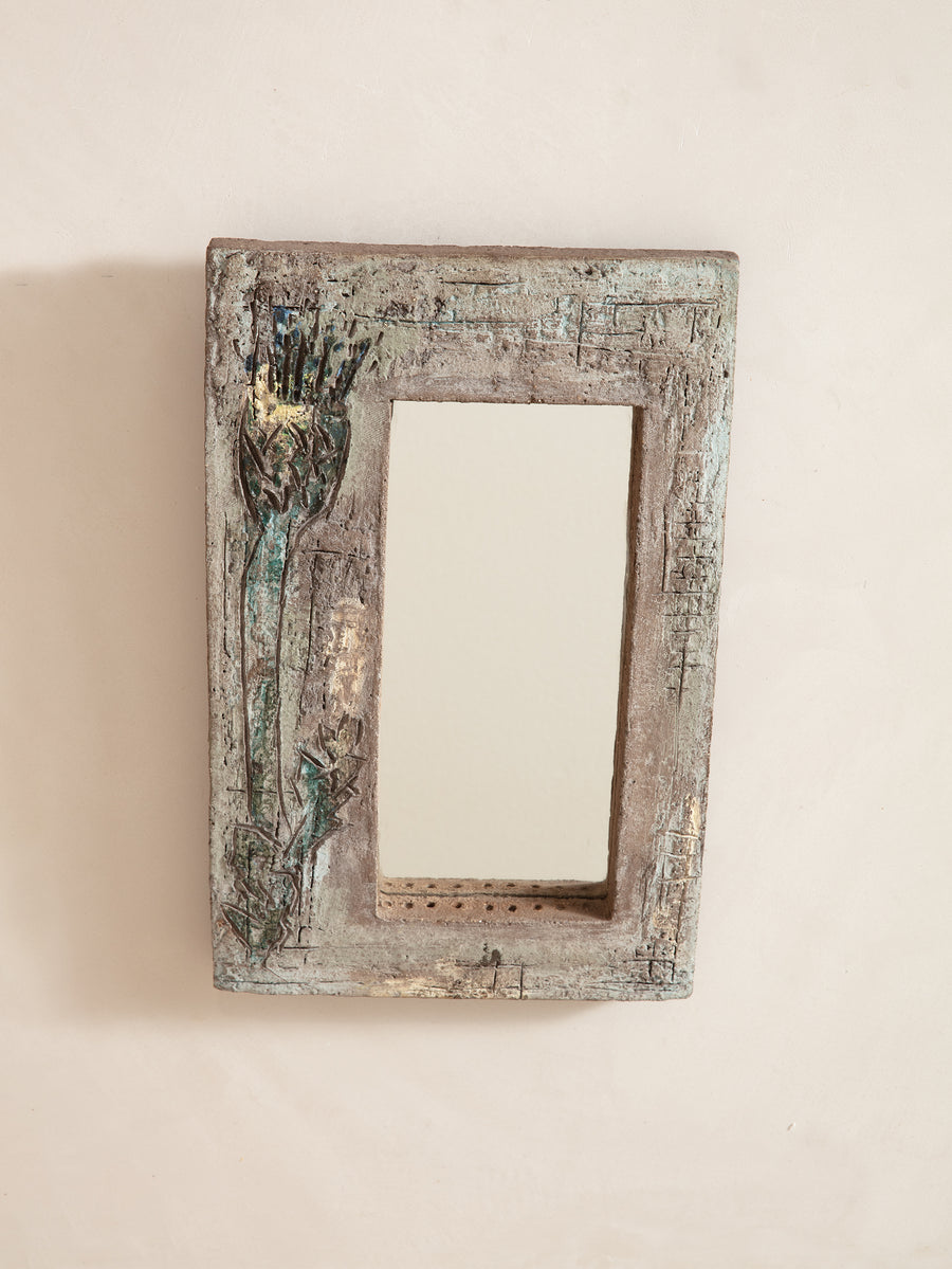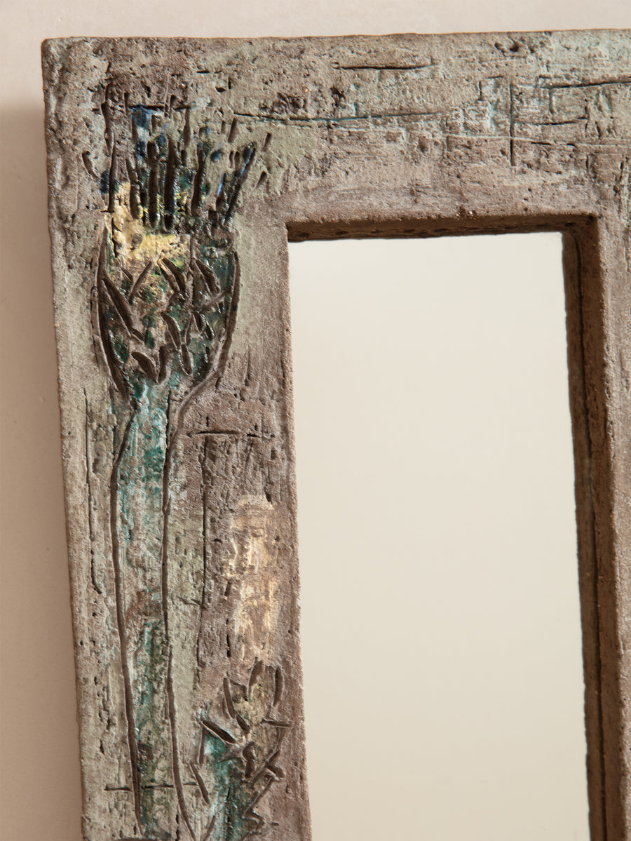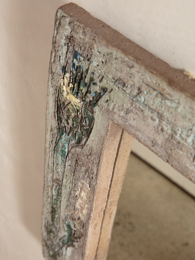 A rare ceramic mirror that blurs the line between art and utility. The sculpted frame bears organic carvings and a soft green-blue patina, reminiscent of ancient frescoes. Its textured surface and timeworn glaze lend an earthy tactility and quiet depth - a reflection of mid-century artistry rooted in material beauty and imperfection.