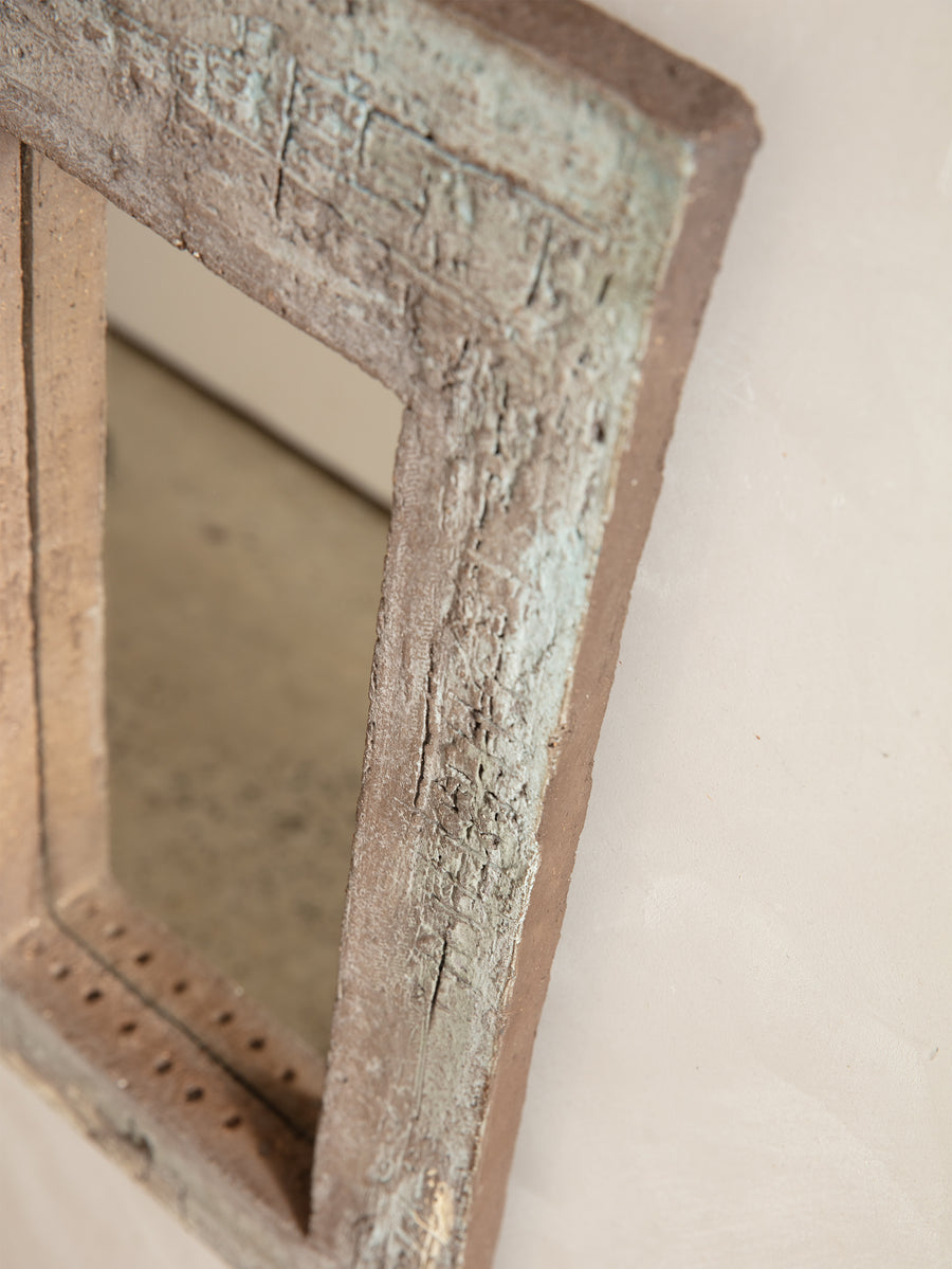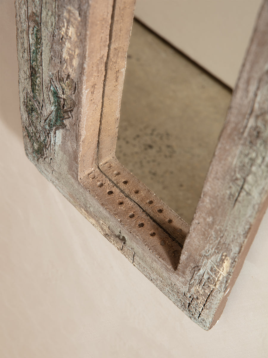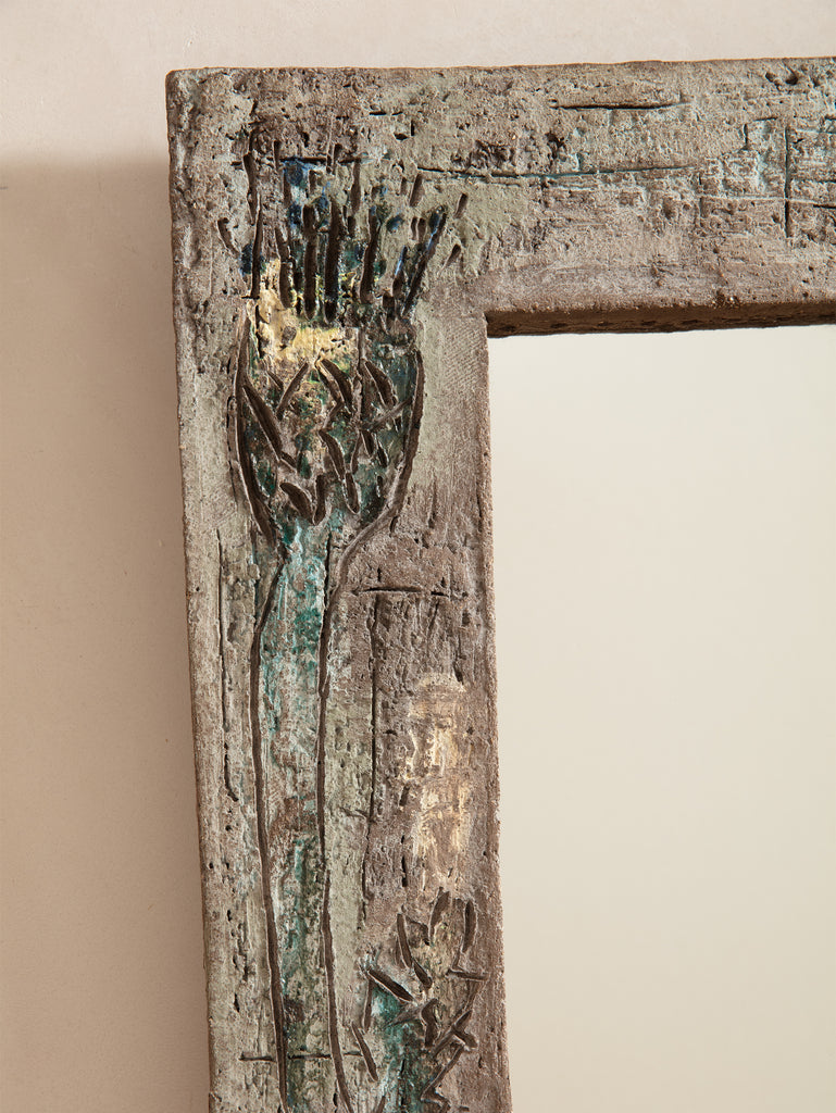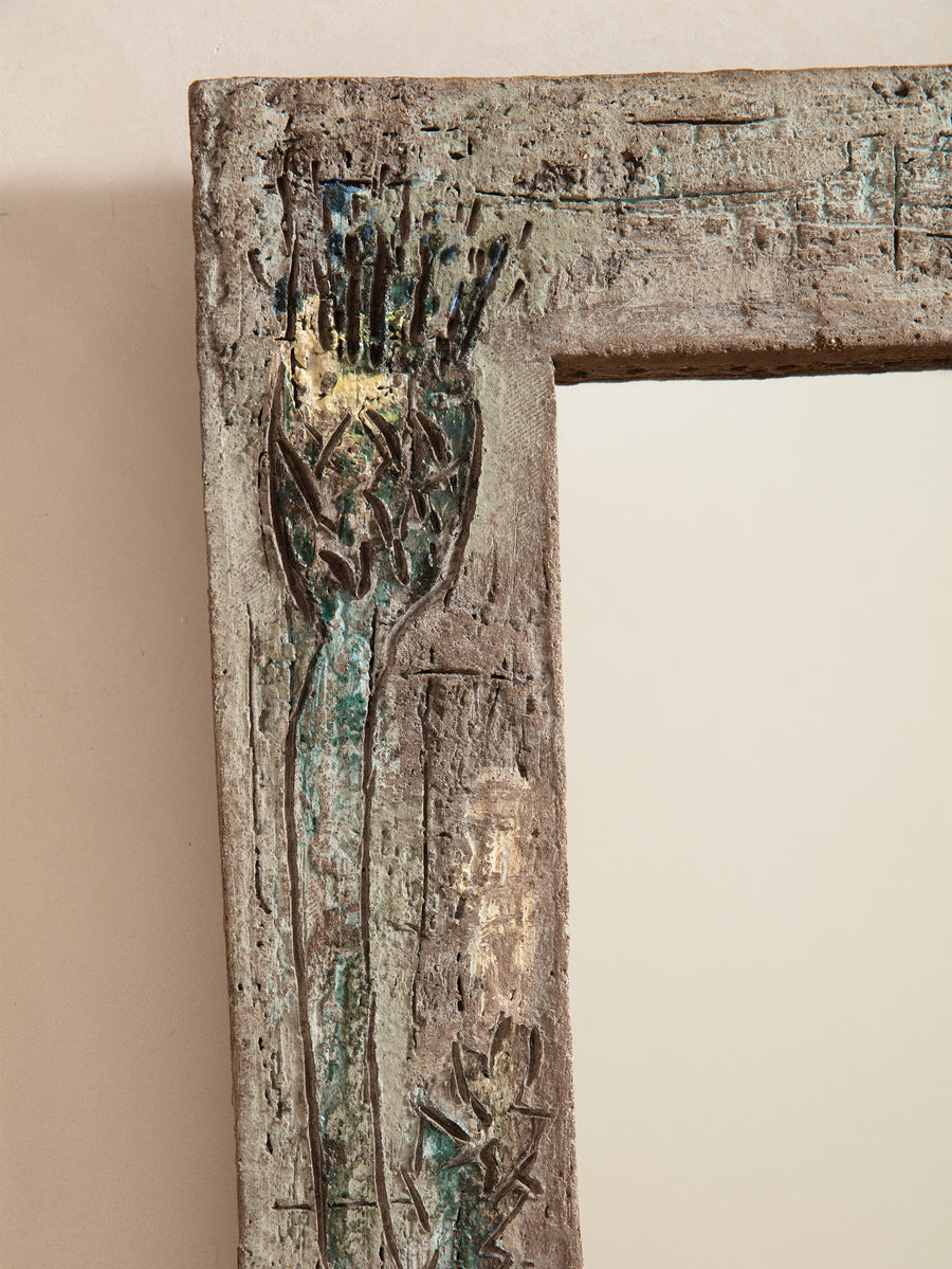 A rare ceramic mirror that blurs the line between art and utility. The sculpted frame bears organic carvings and a soft green-blue patina, reminiscent of ancient frescoes. Its textured surface and timeworn glaze lend an earthy tactility and quiet depth - a reflection of mid-century artistry rooted in material beauty and imperfection.