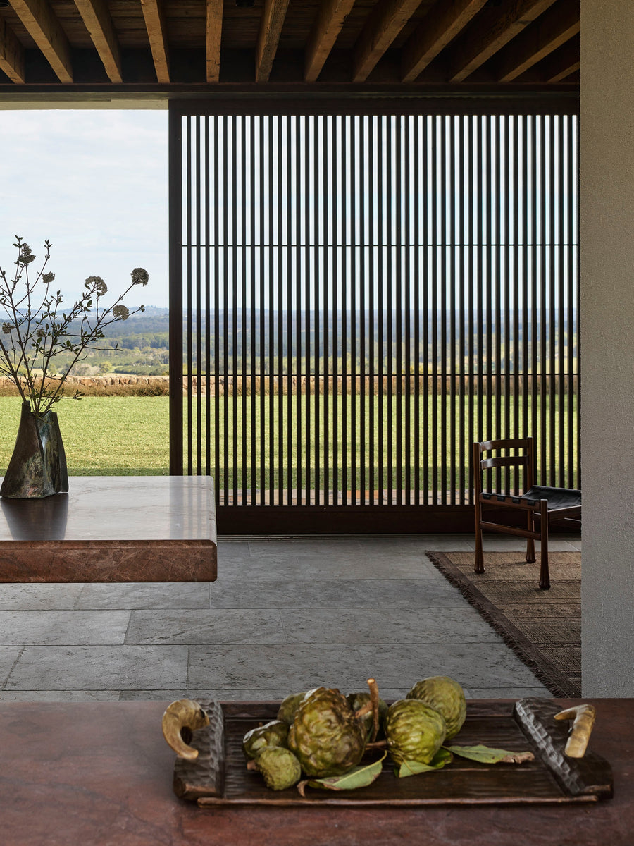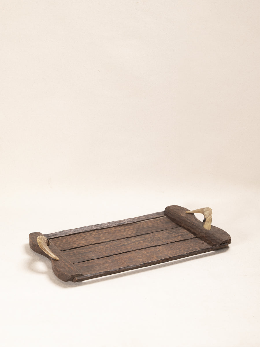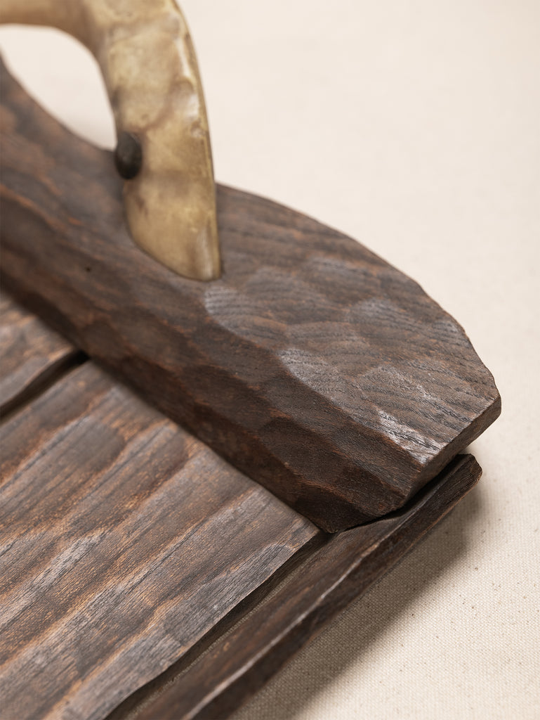 A striking Brutalist-era serving tray crafted from dark, hand-carved timber and accented with sculptural ivory handles. The piece captures the raw beauty of natural materials, combining rustic texture with elegant form. Once used for serving wine or aperitifs, it now serves beautifully as a decorative centrepiece - a refined example of French artisanal design from the period.