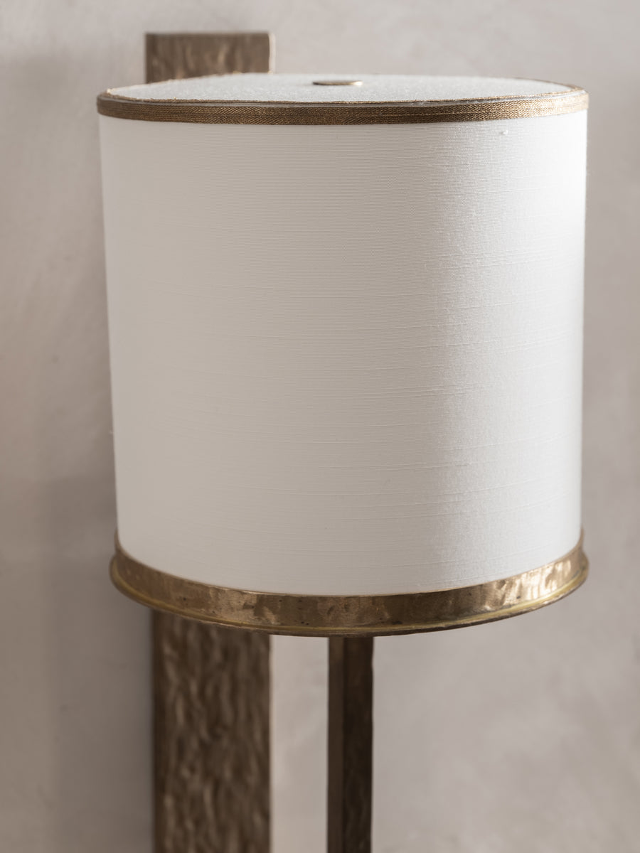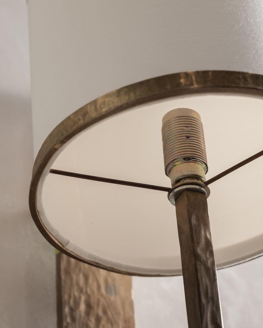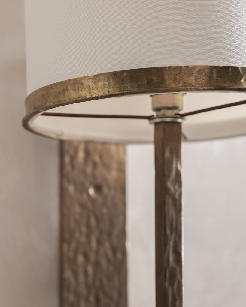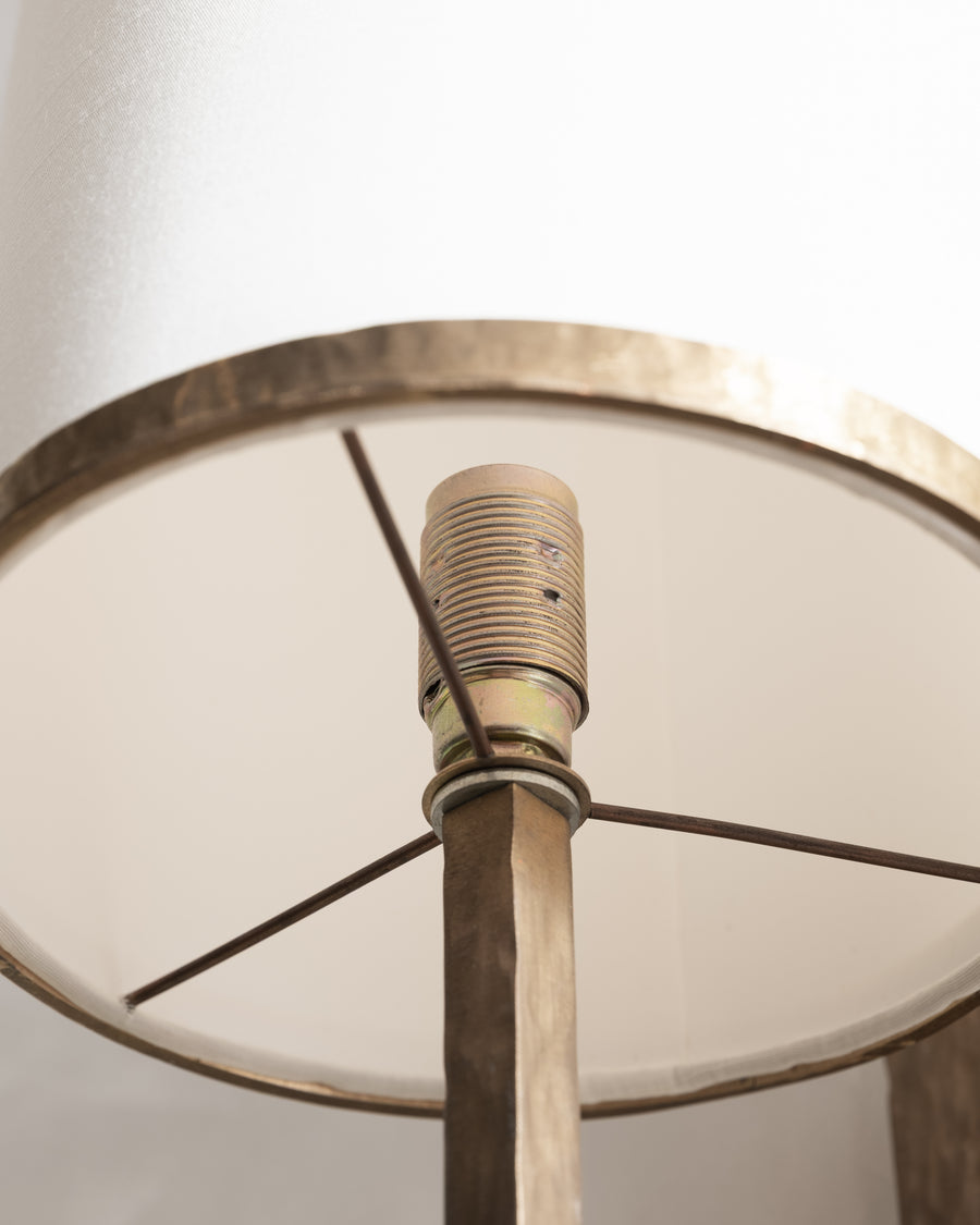 A quiet study in texture and warmth, this 1980s French table lamp is crafted from gilt brass with a beautifully hammered surface - catching the light with a subtle, organic shimmer. The bronze is in great condition, its golden tones rich with depth. A fabric shade softens the glow, bringing warmth to the piece. Sculptural yet understated, it speaks to a refined, tactile elegance.