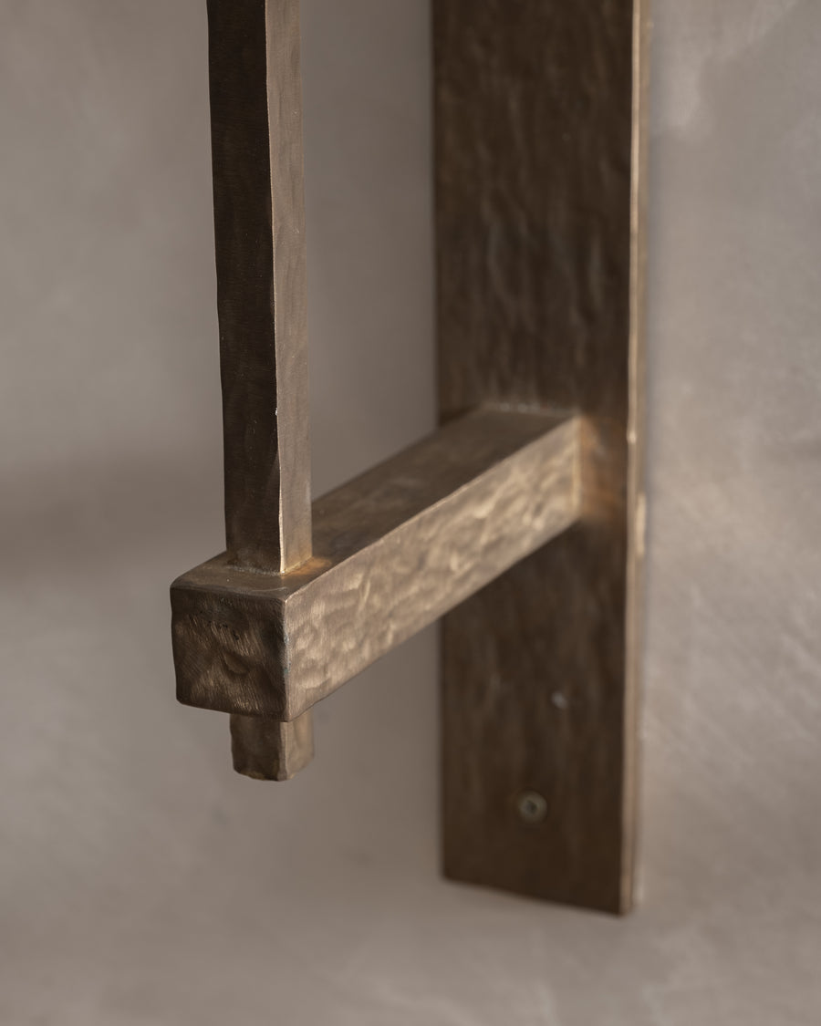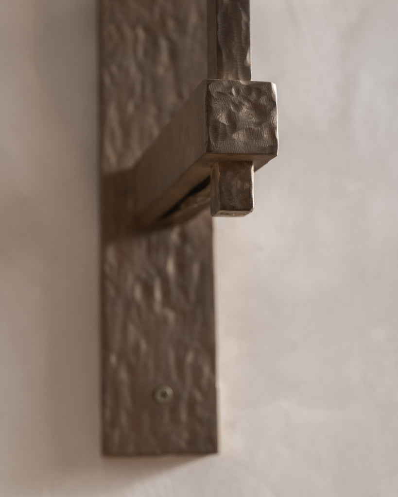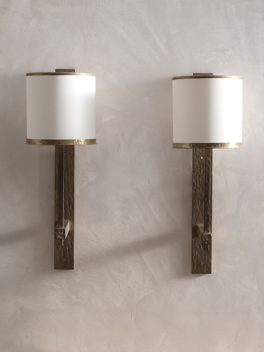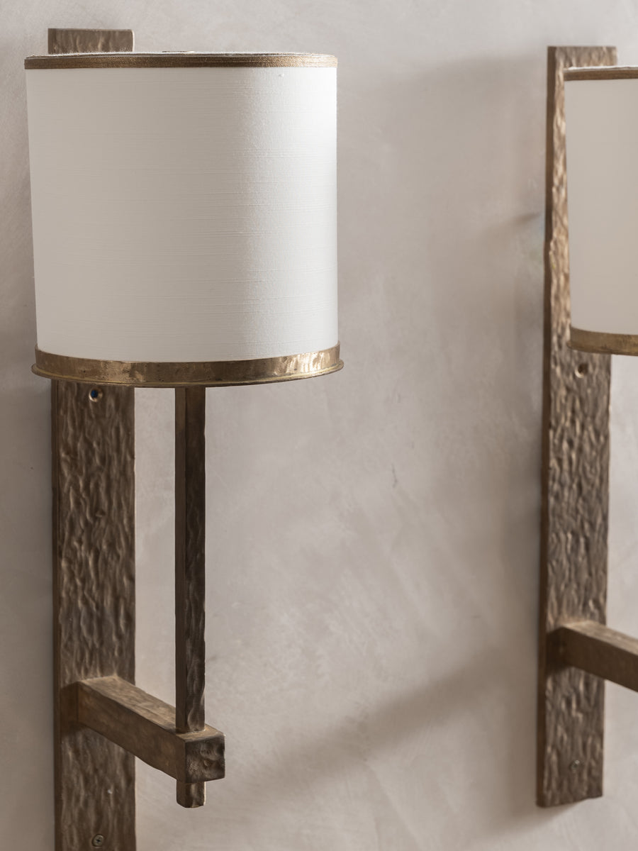 A quiet study in texture and warmth, this 1980s French table lamp is crafted from gilt brass with a beautifully hammered surface - catching the light with a subtle, organic shimmer. The bronze is in great condition, its golden tones rich with depth. A fabric shade softens the glow, bringing warmth to the piece. Sculptural yet understated, it speaks to a refined, tactile elegance.